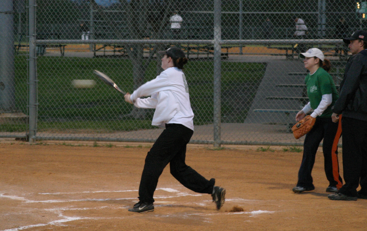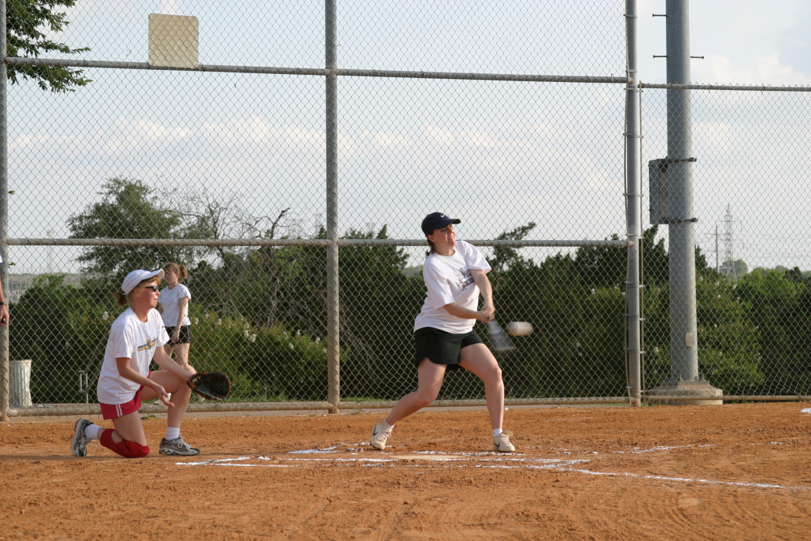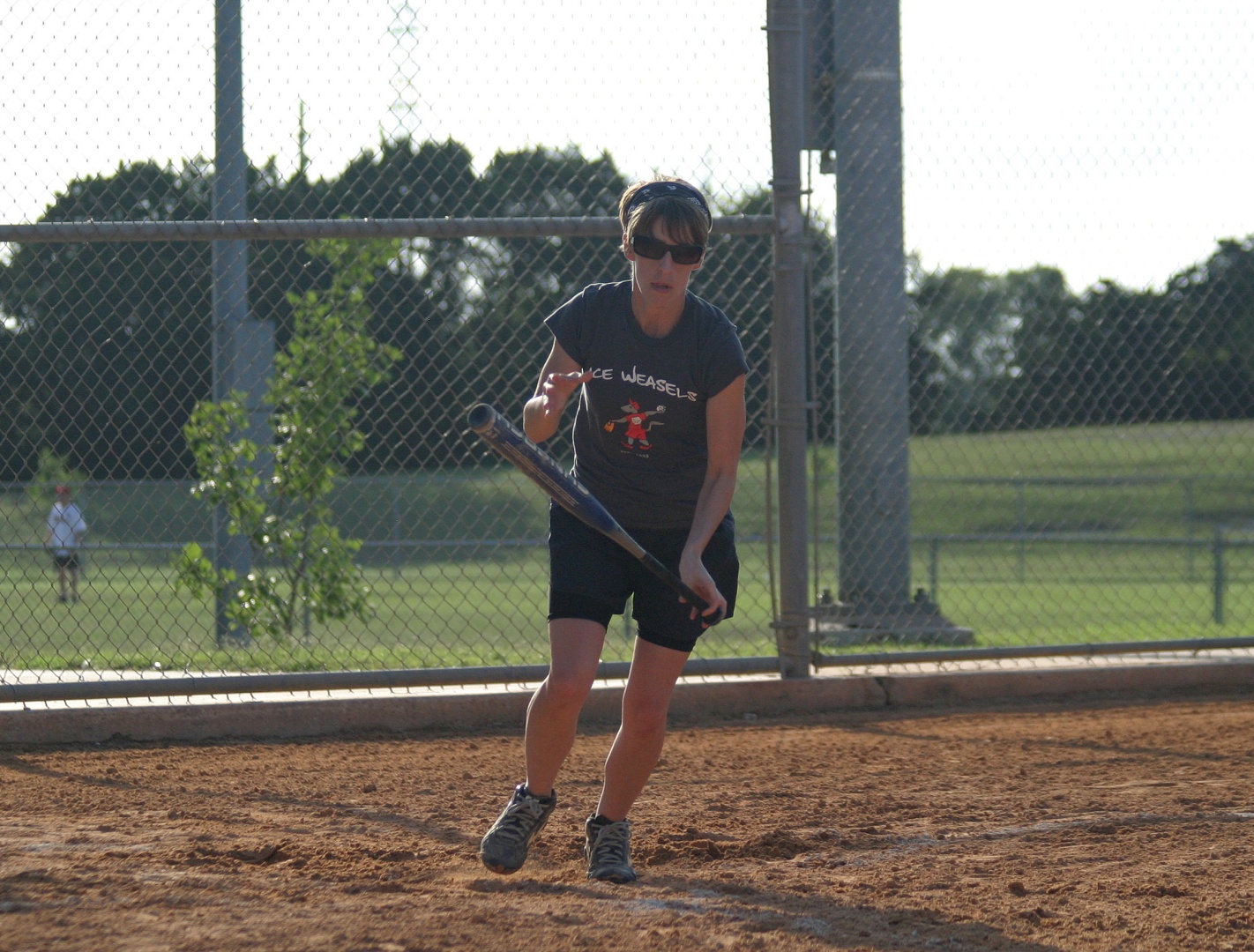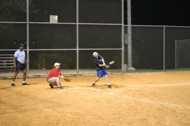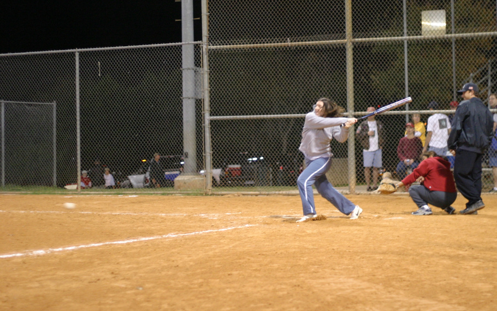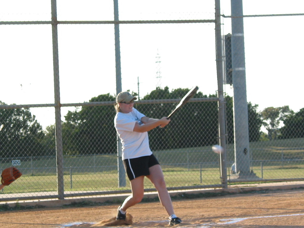 Becky hits a ball in the top of the 2nd inning. Neil is on deck, Matt is the third base coach, and Mitch is standing in the door of the dugout keeping score. In the dugout, from left to right, are Tim R, Michelle F, Newton, Azzy, Lindsay H, and Kelly B. On the other side of Mitch in the dugout, Lacey is sitting on the bench. |