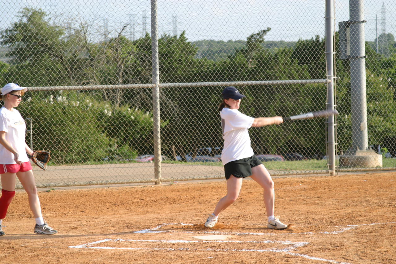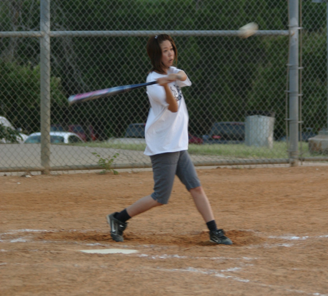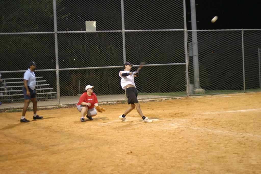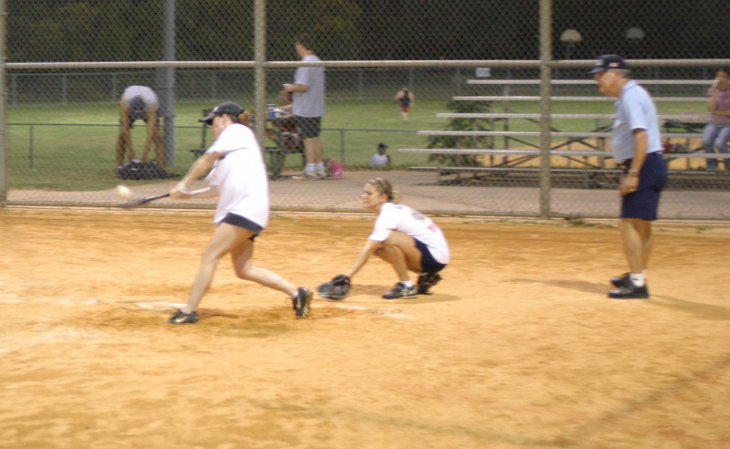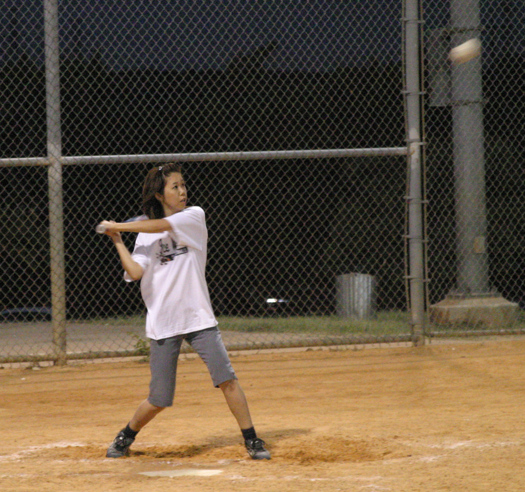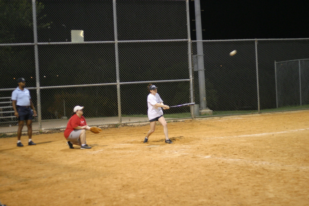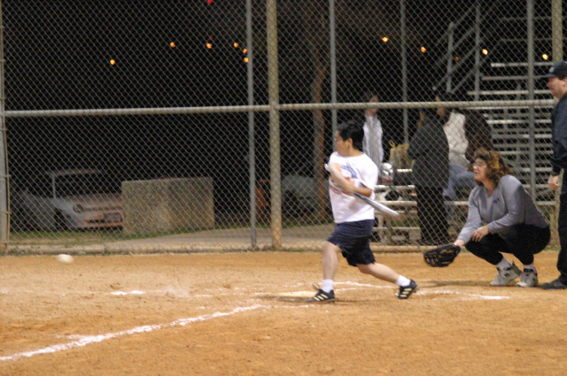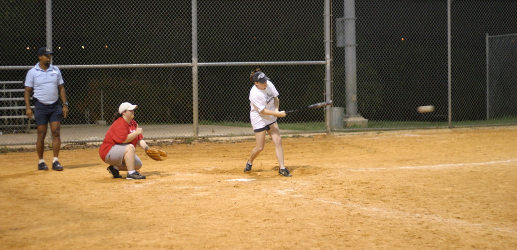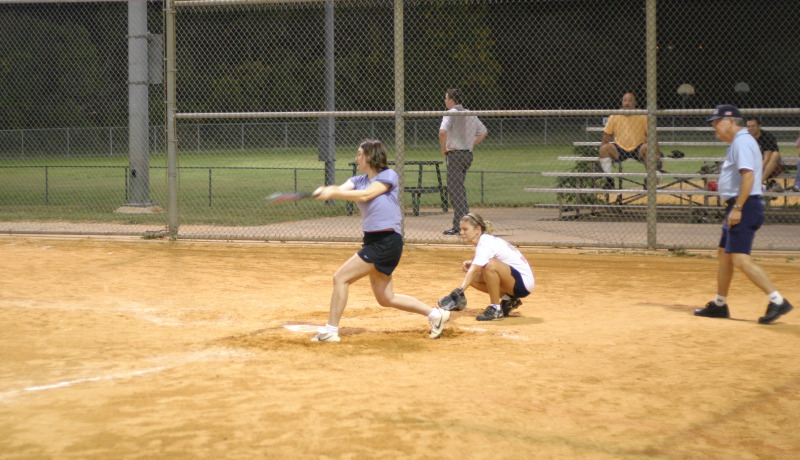 Becky hits a ball in the top of the 2nd inning. Neil is on deck, Matt is the third base coach, and Mitch is standing in the door of the dugout keeping score. In the dugout, from left to right, are Tim R, Michelle F, Newton, Azzy, Lindsay H, and Kelly B. On the other side of Mitch in the dugout, Lacey is sitting on the bench. |