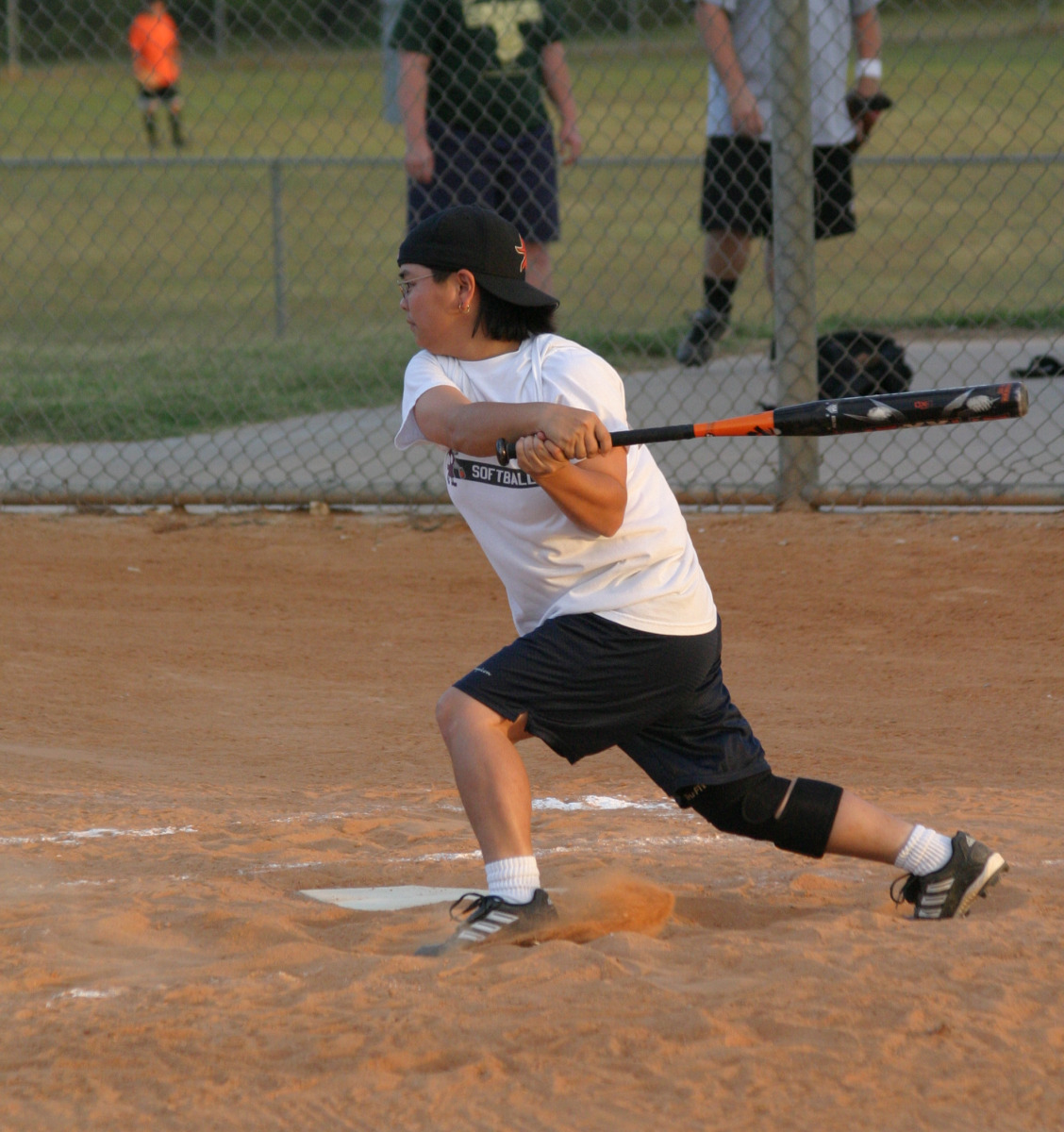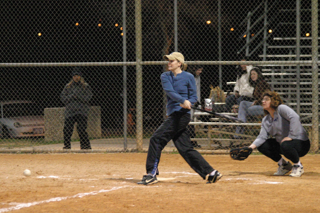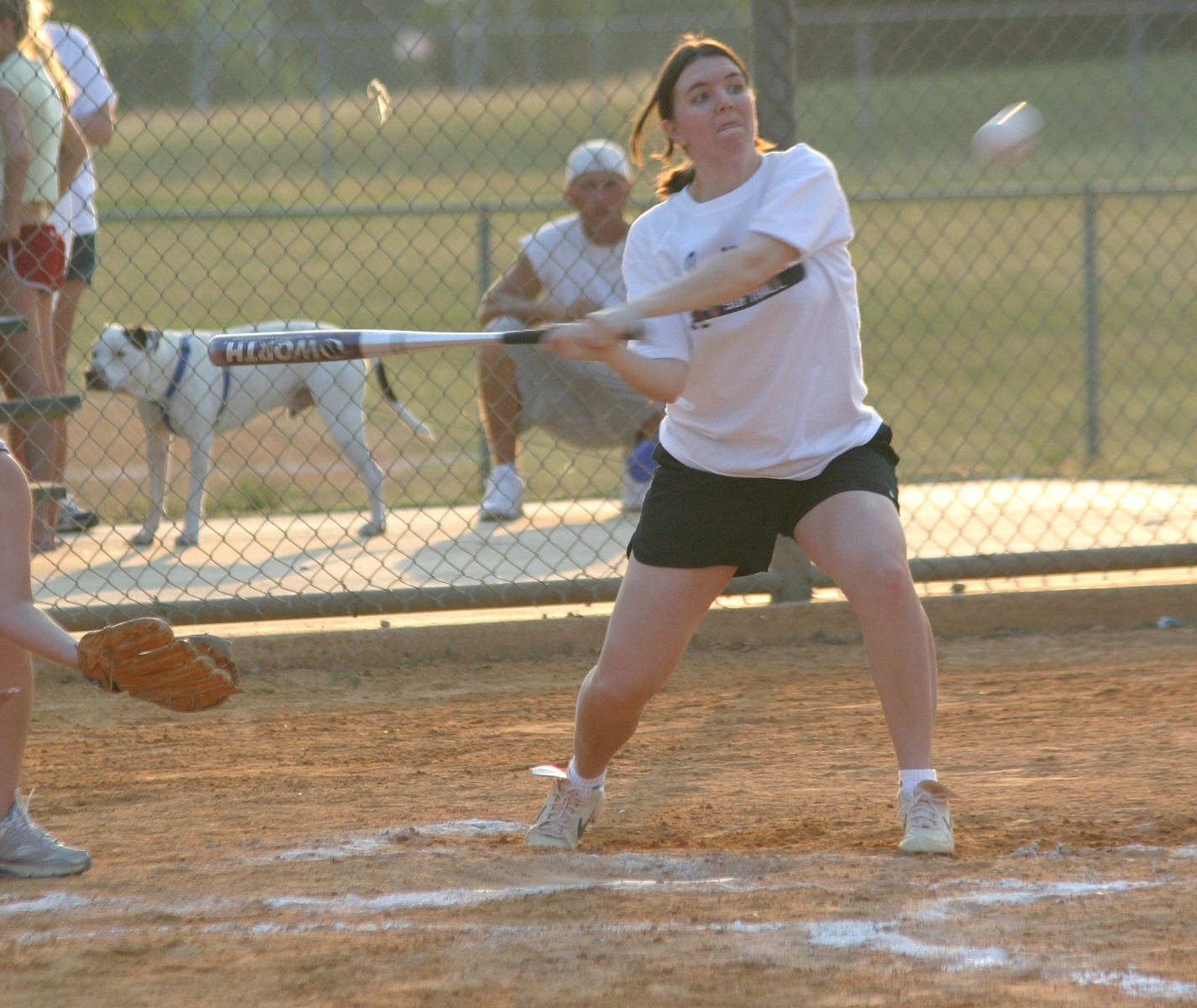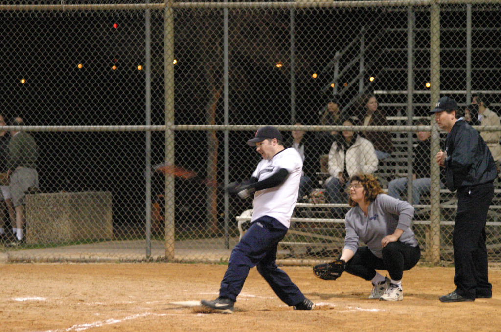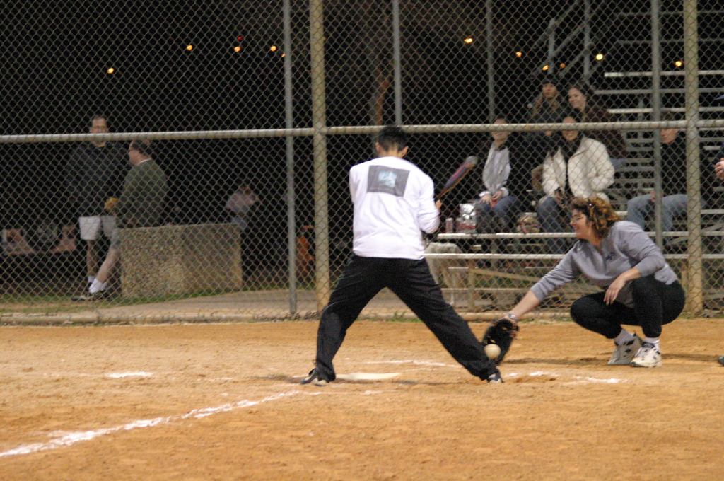 Becky hits a ball in the top of the 2nd inning. Neil is on deck, Matt is the third base coach, and Mitch is standing in the door of the dugout keeping score. In the dugout, from left to right, are Tim R, Michelle F, Newton, Azzy, Lindsay H, and Kelly B. On the other side of Mitch in the dugout, Lacey is sitting on the bench. |