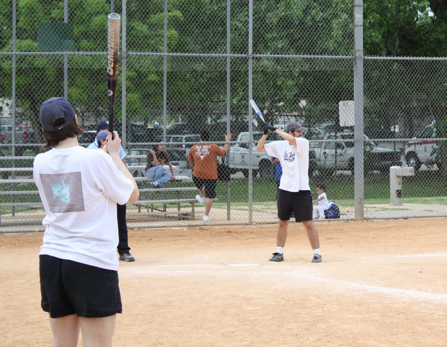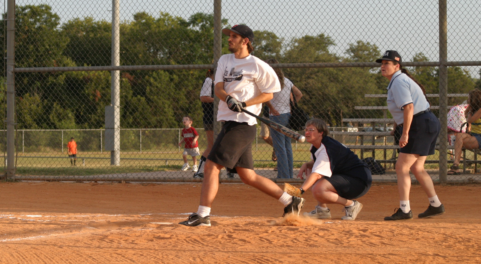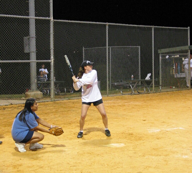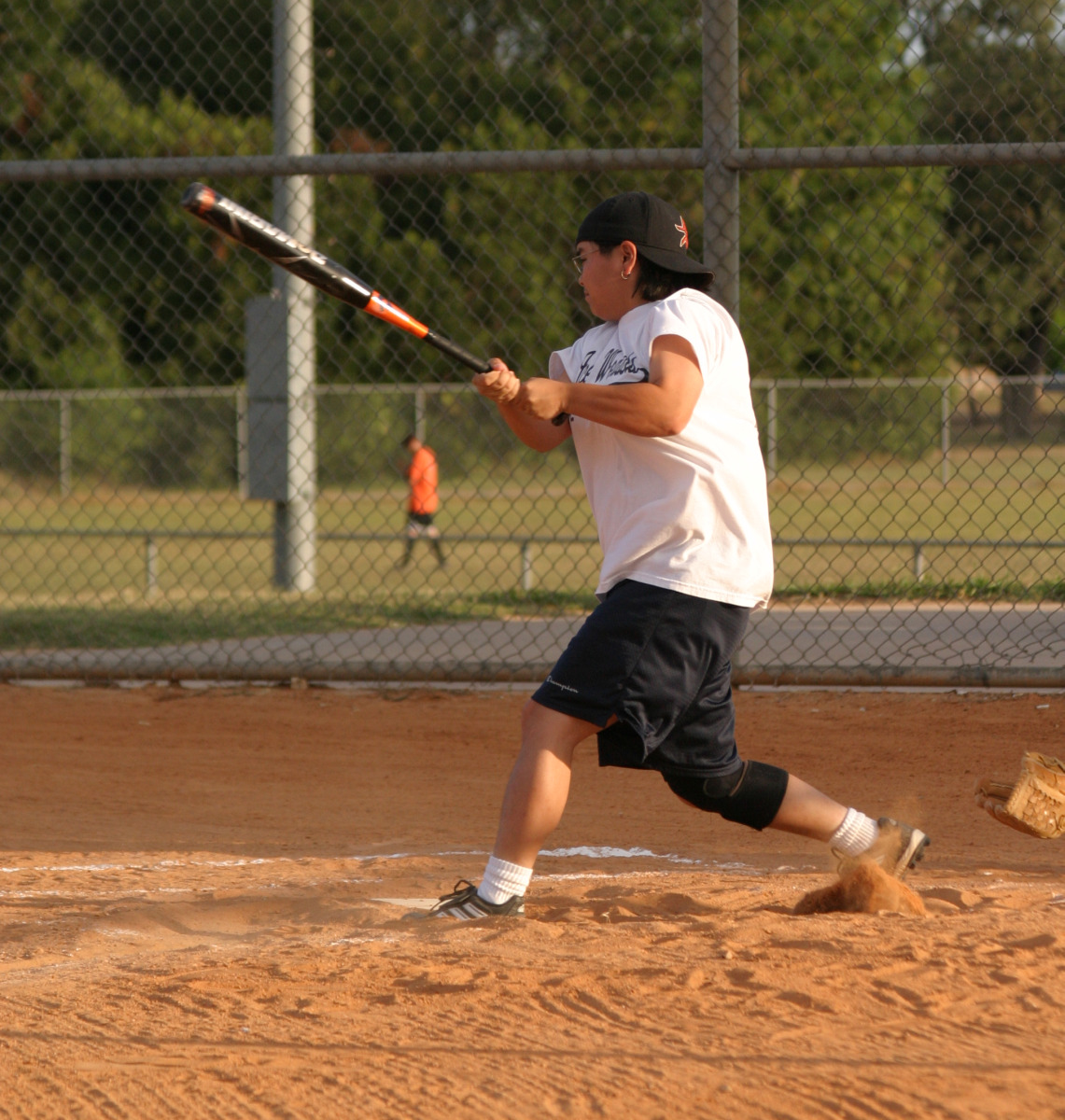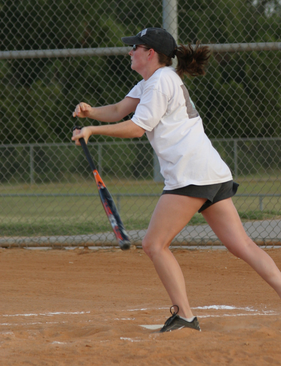 Becky hits a ball in the top of the 2nd inning. Neil is on deck, Matt is the third base coach, and Mitch is standing in the door of the dugout keeping score. In the dugout, from left to right, are Tim R, Michelle F, Newton, Azzy, Lindsay H, and Kelly B. On the other side of Mitch in the dugout, Lacey is sitting on the bench. |