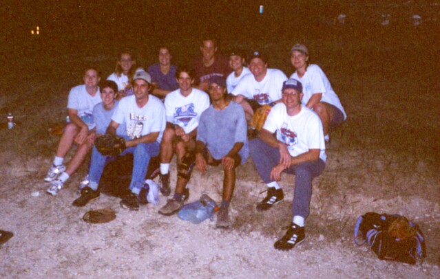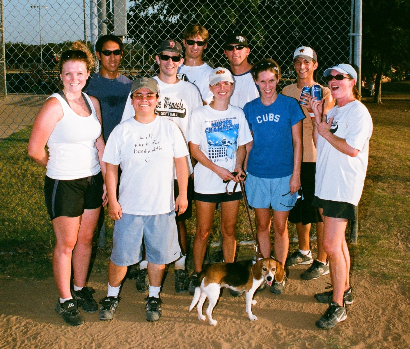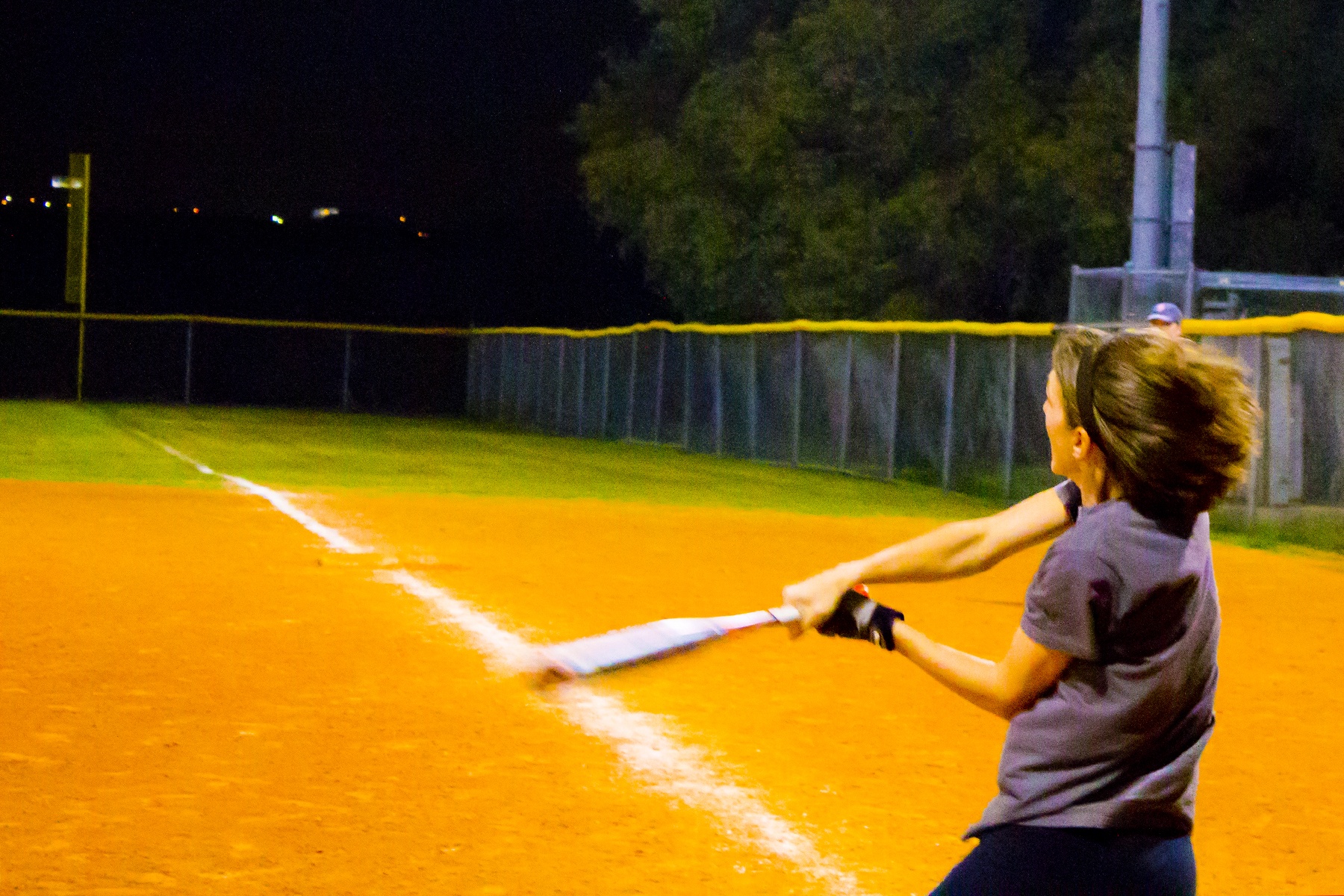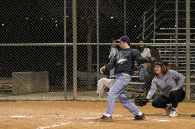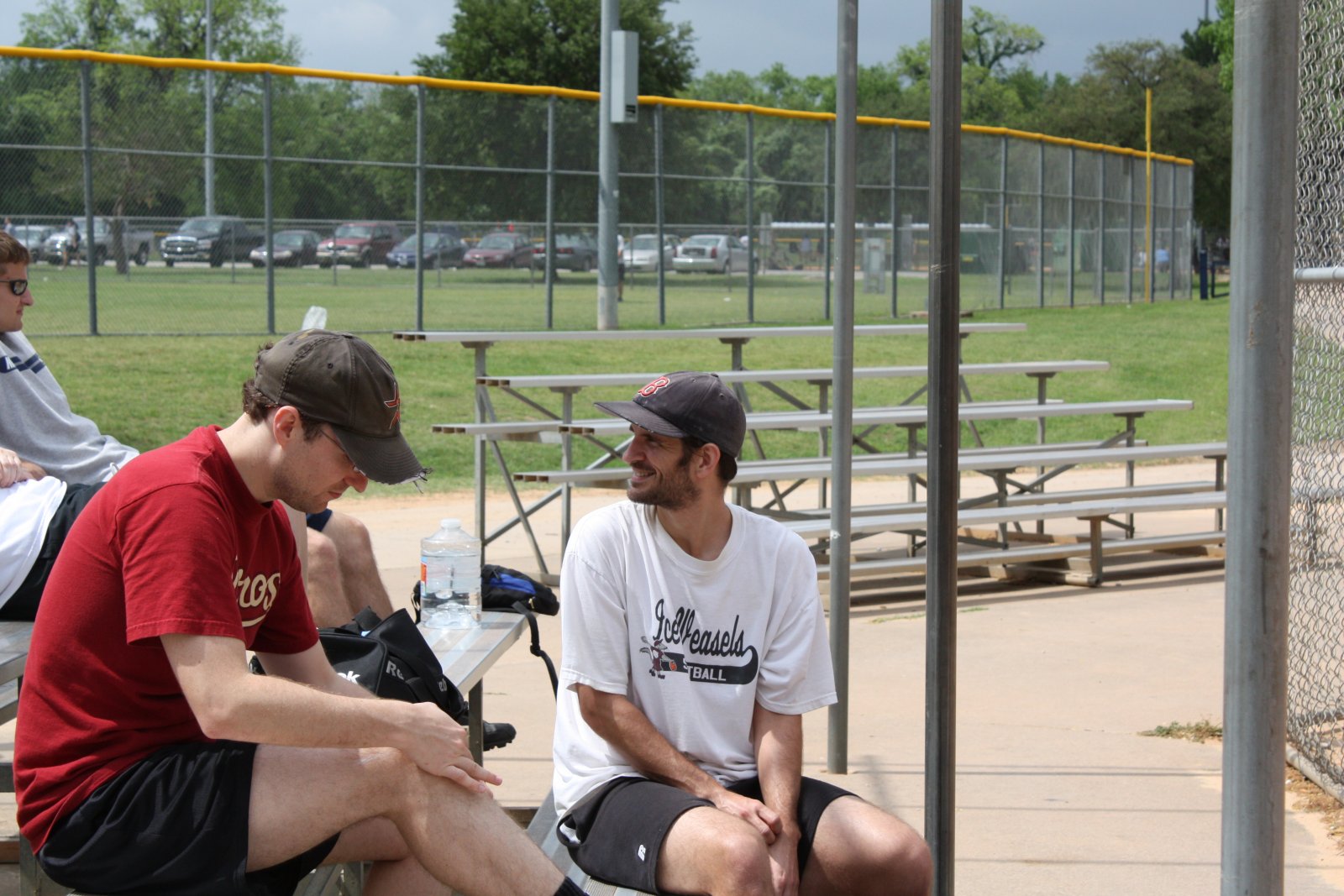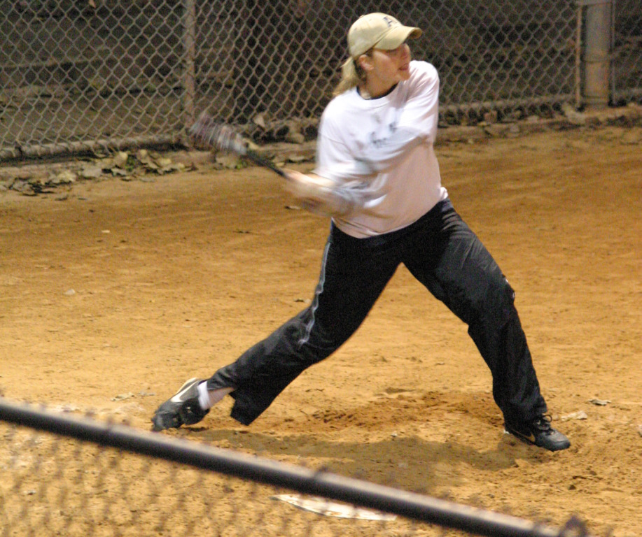 Becky hits a ball in the top of the 2nd inning. Neil is on deck, Matt is the third base coach, and Mitch is standing in the door of the dugout keeping score. In the dugout, from left to right, are Tim R, Michelle F, Newton, Azzy, Lindsay H, and Kelly B. On the other side of Mitch in the dugout, Lacey is sitting on the bench. |