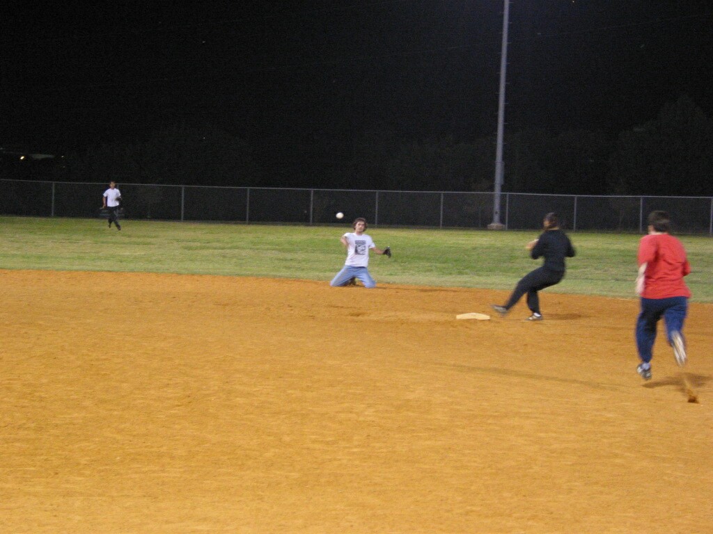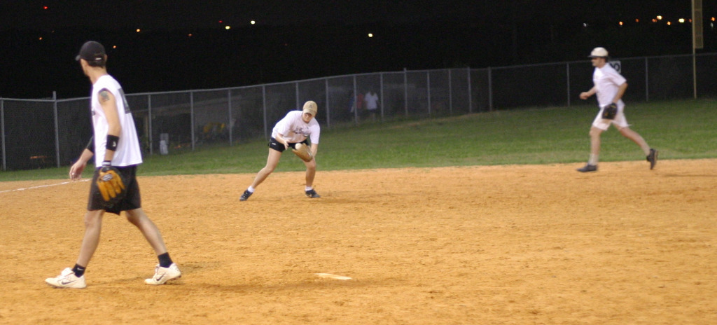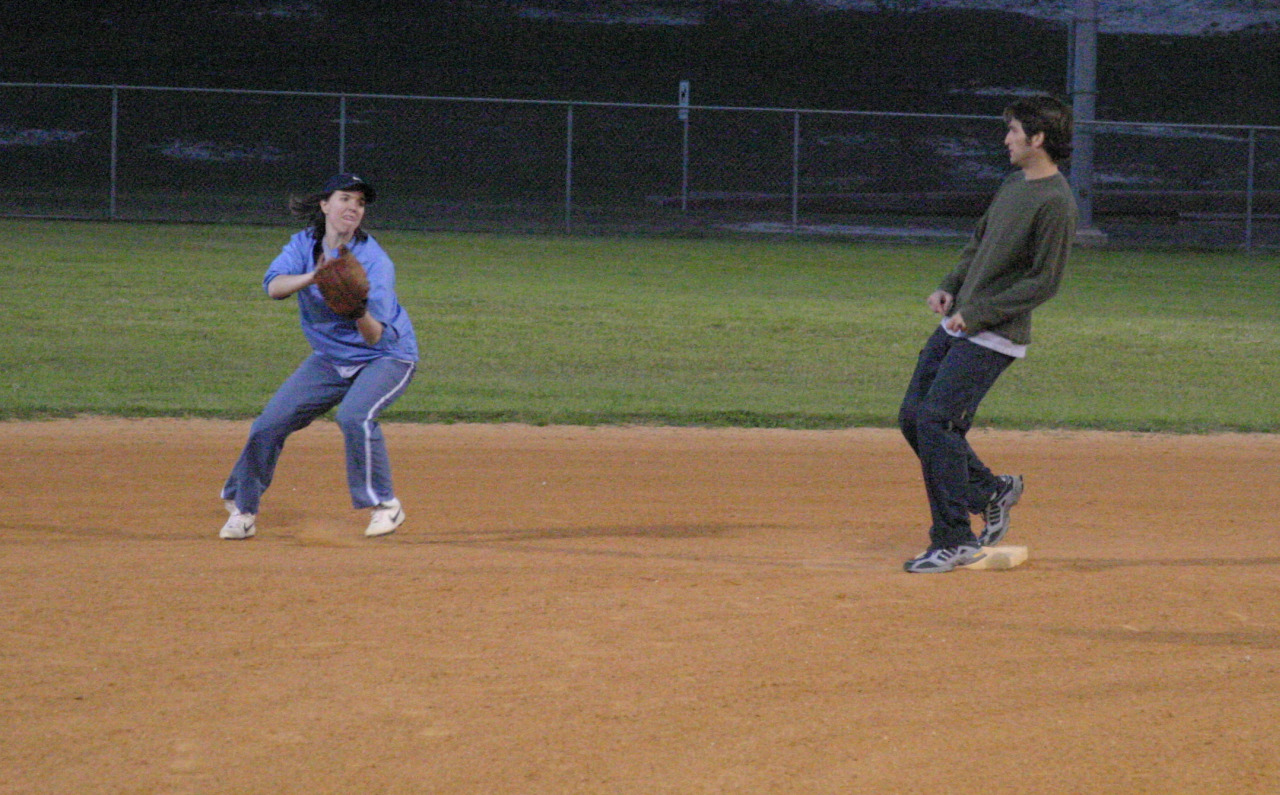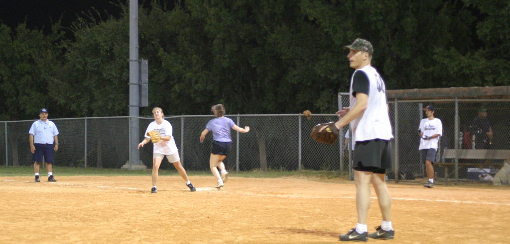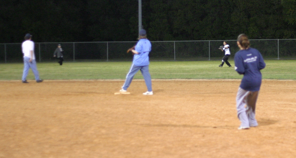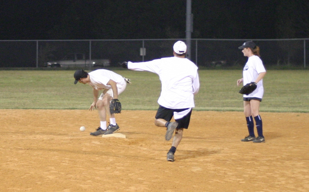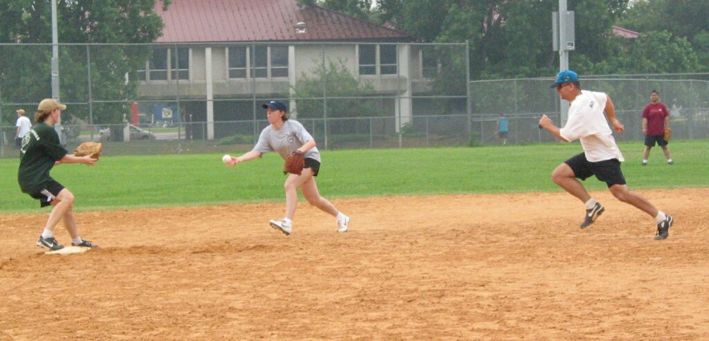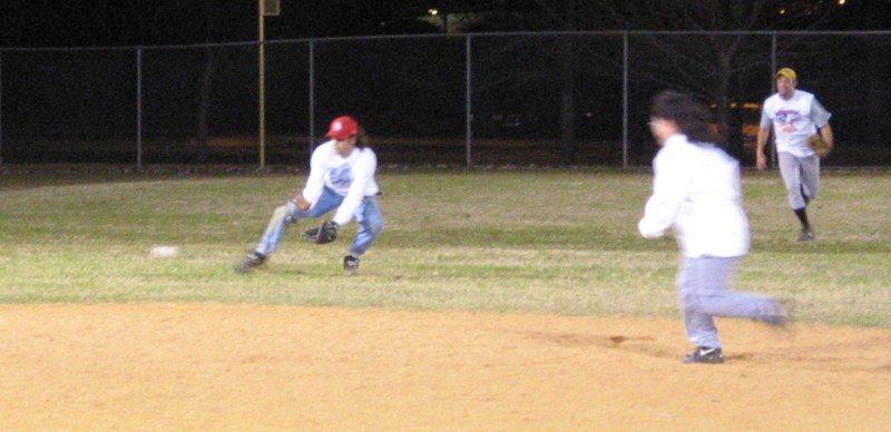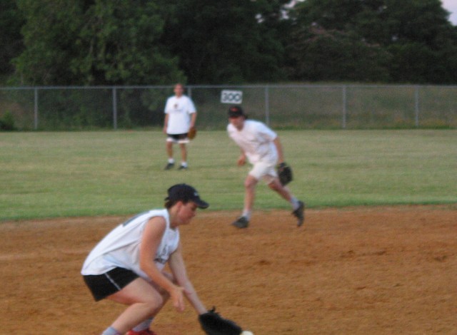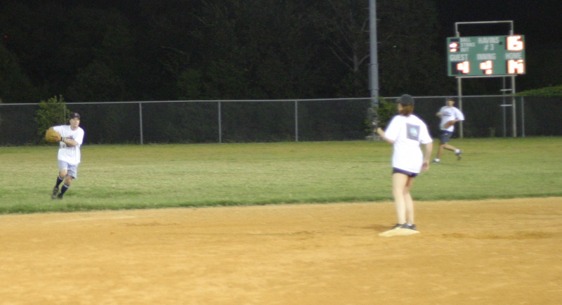 In the bottom of the 1st inning, Neil is about to pick up a ground ball as a runner sprints toward first base, and Michelle F waits to receive the throw. |