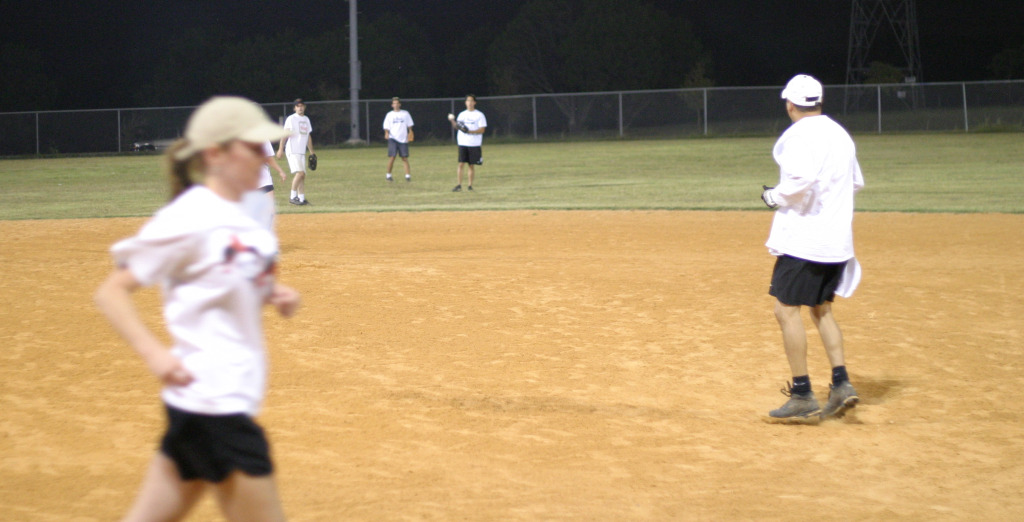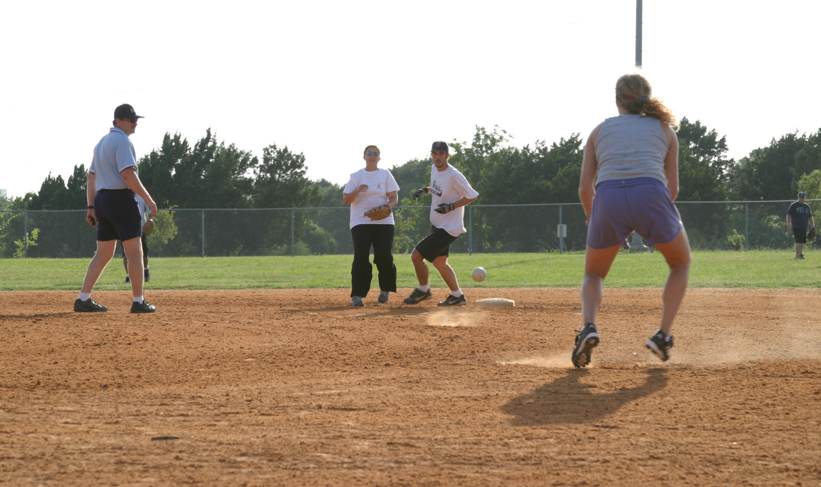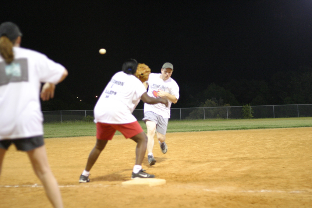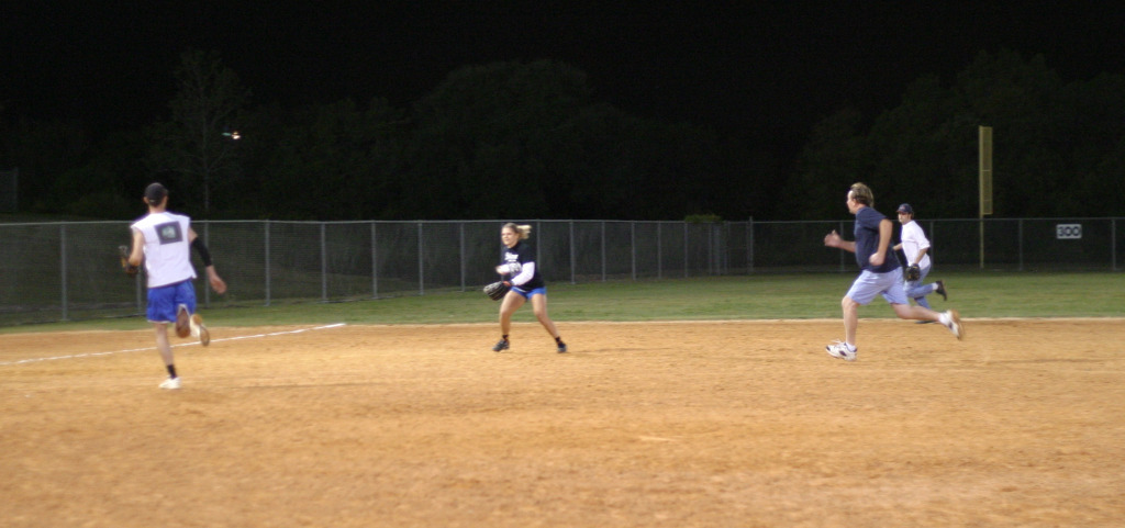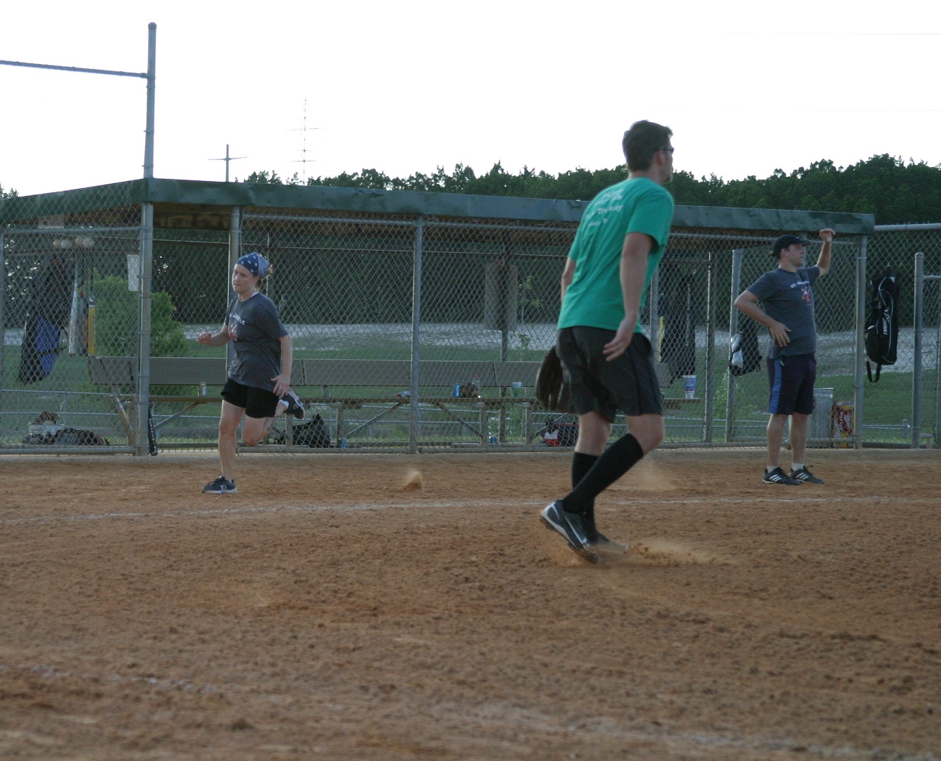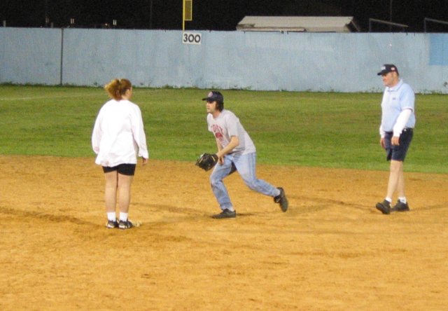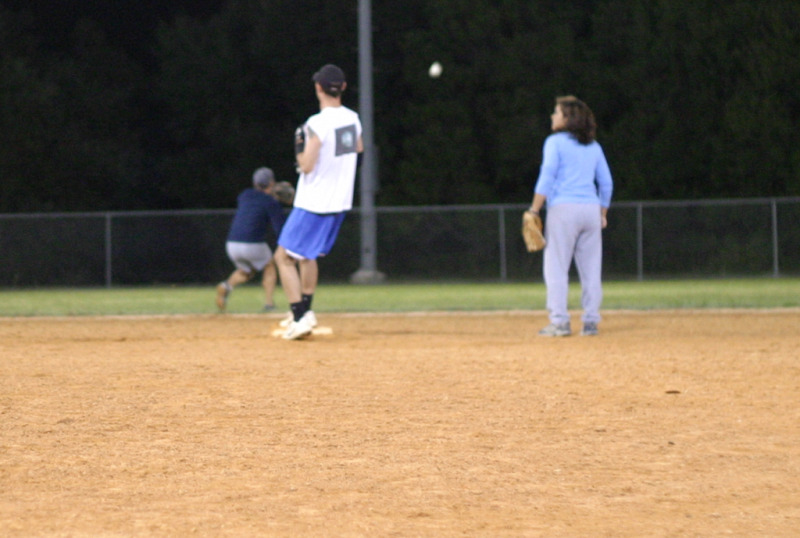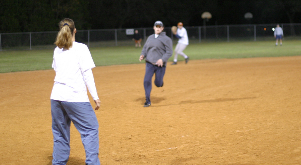 In the bottom of the 1st inning, Neil is about to pick up a ground ball as a runner sprints toward first base, and Michelle F waits to receive the throw. |