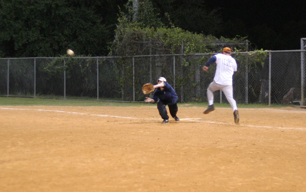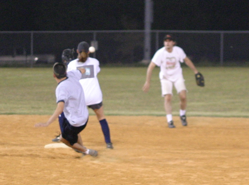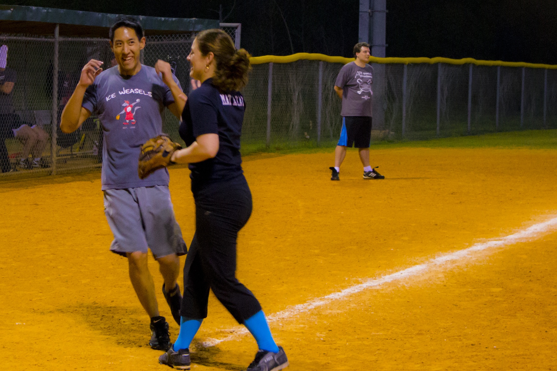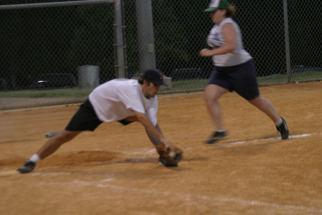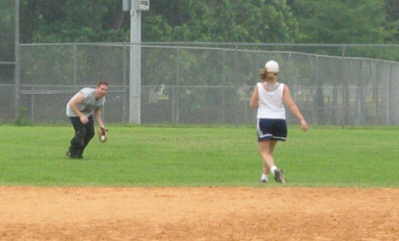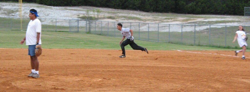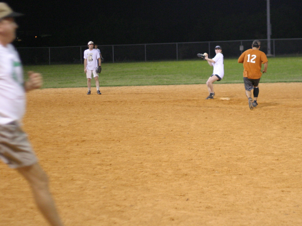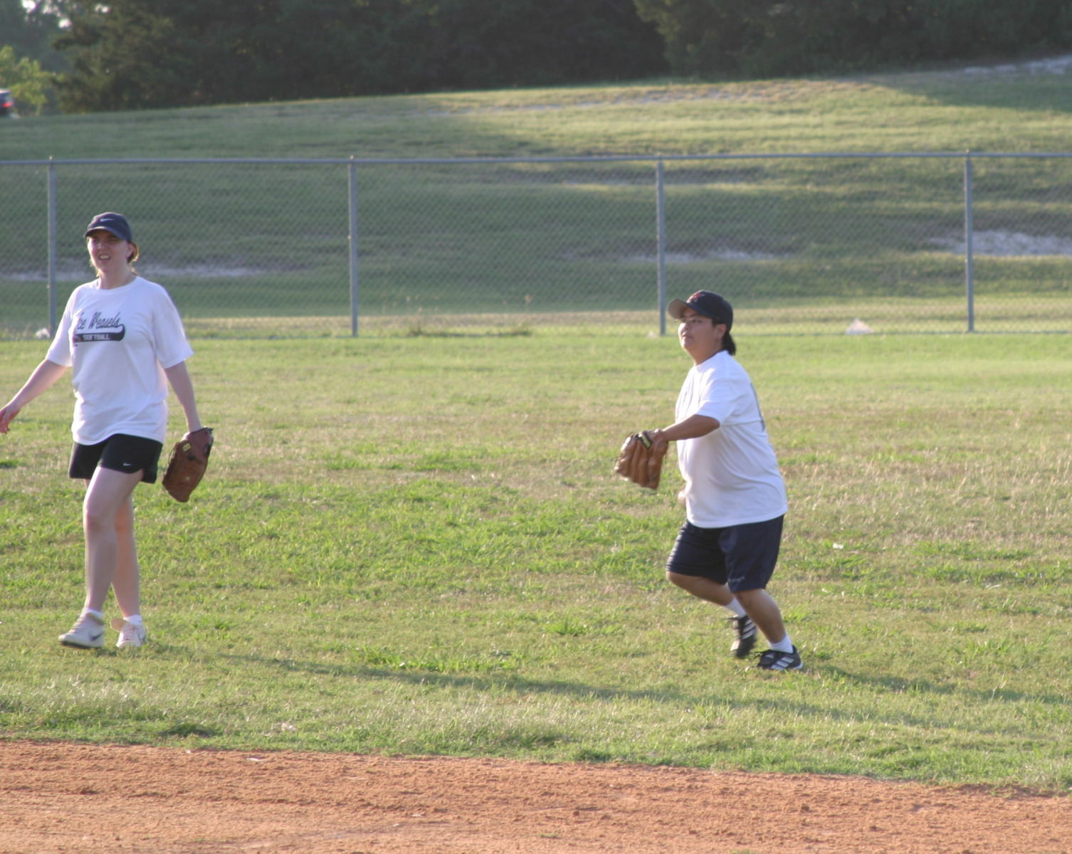 In the bottom of the 1st inning, Neil is about to pick up a ground ball as a runner sprints toward first base, and Michelle F waits to receive the throw. |