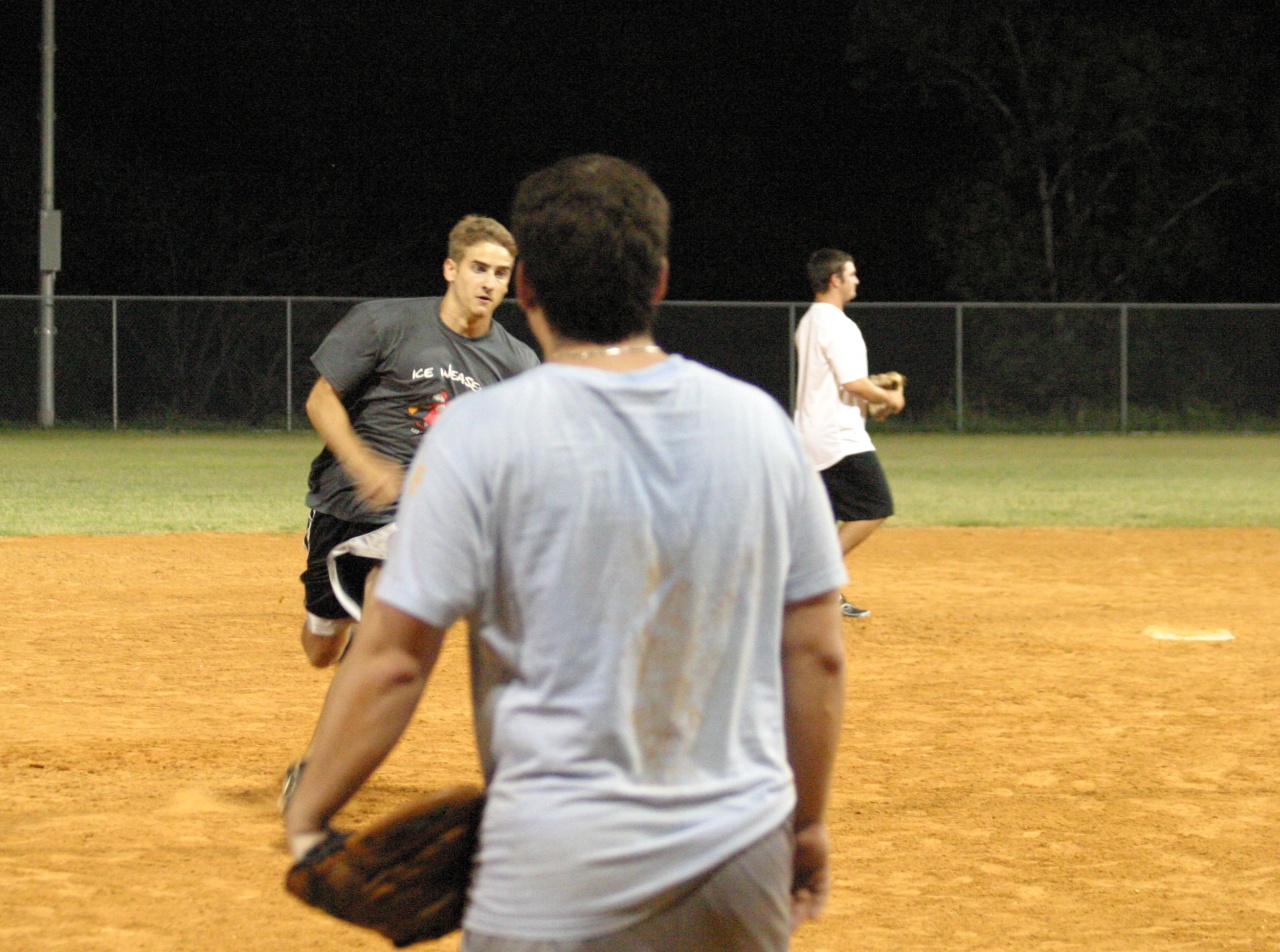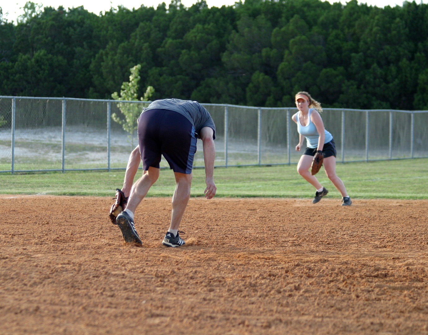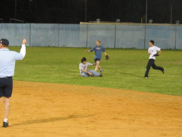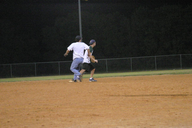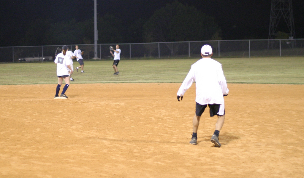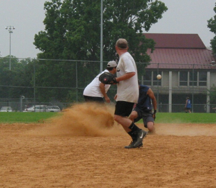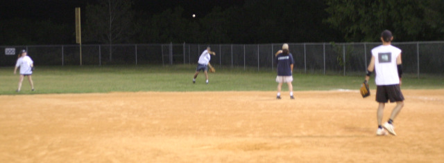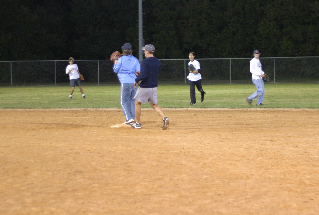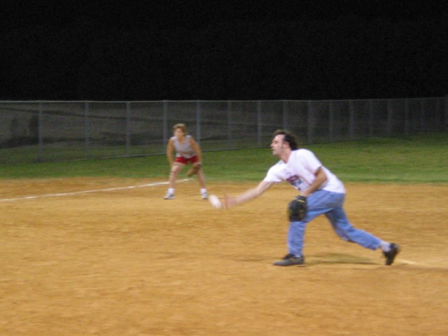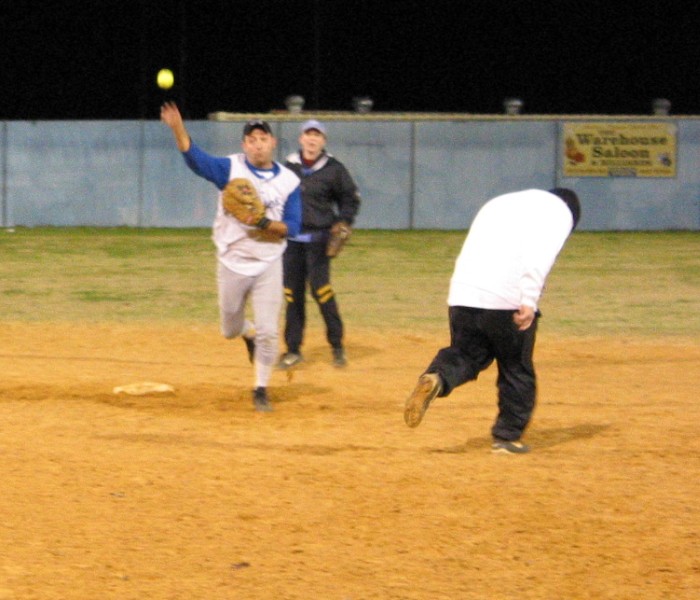 In the bottom of the 1st inning, Neil is about to pick up a ground ball as a runner sprints toward first base, and Michelle F waits to receive the throw. |