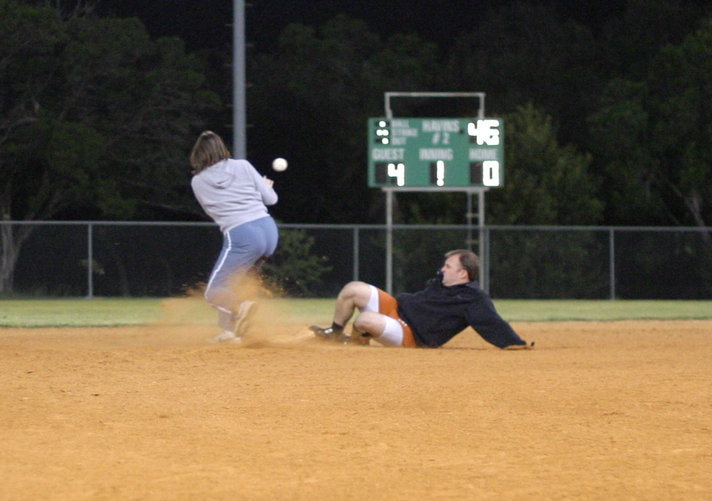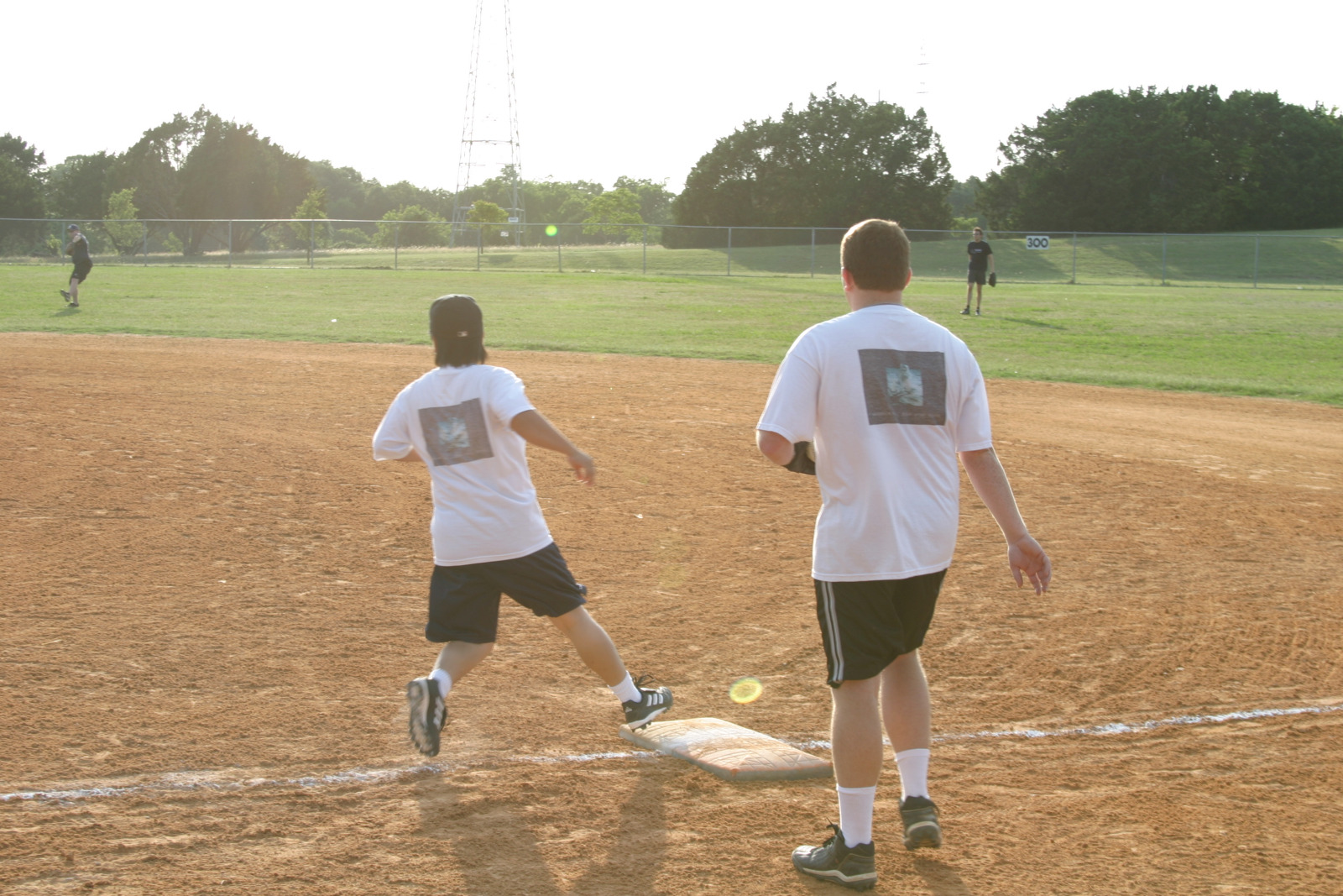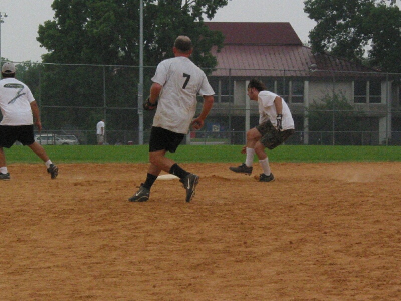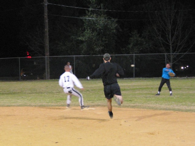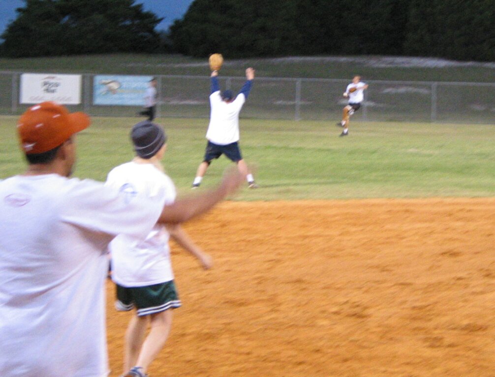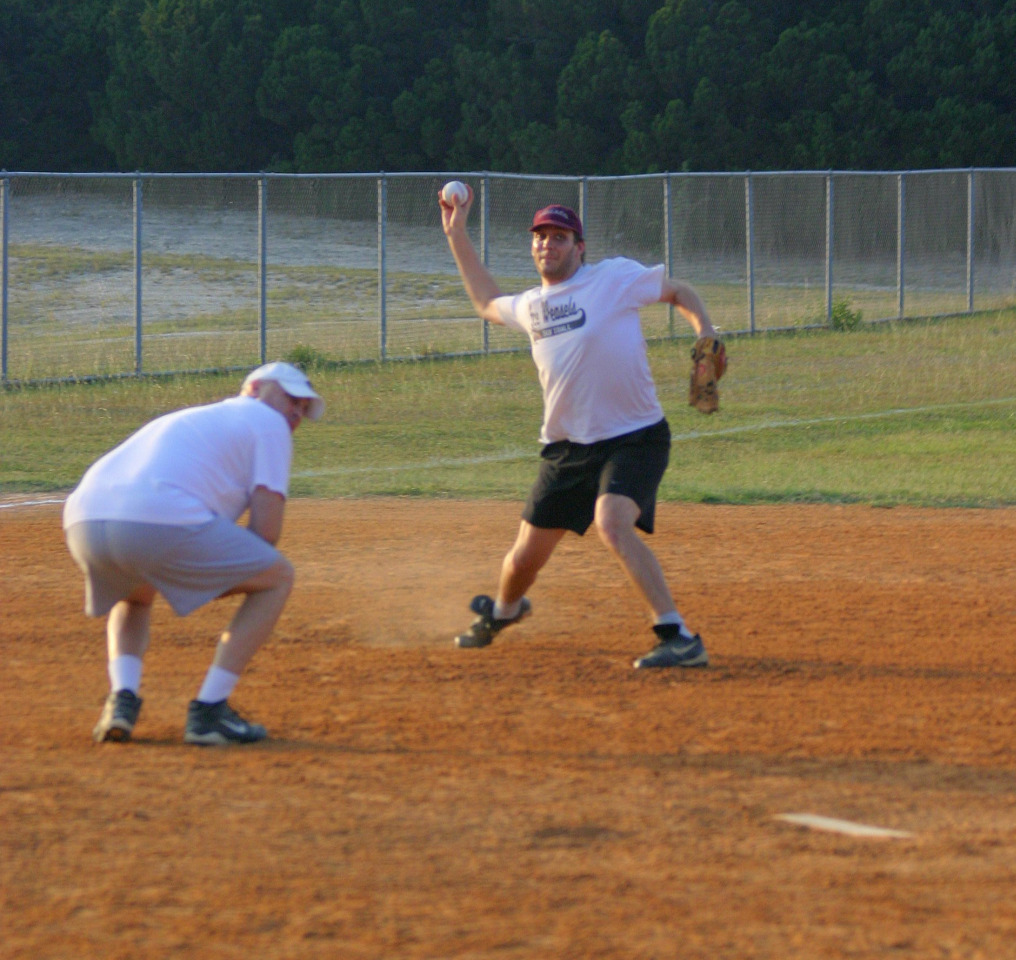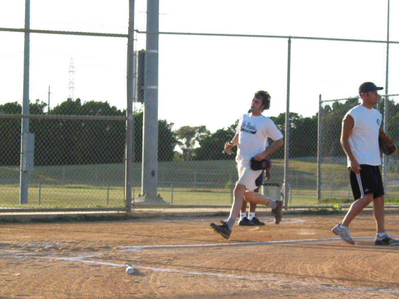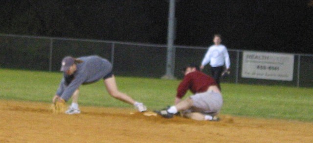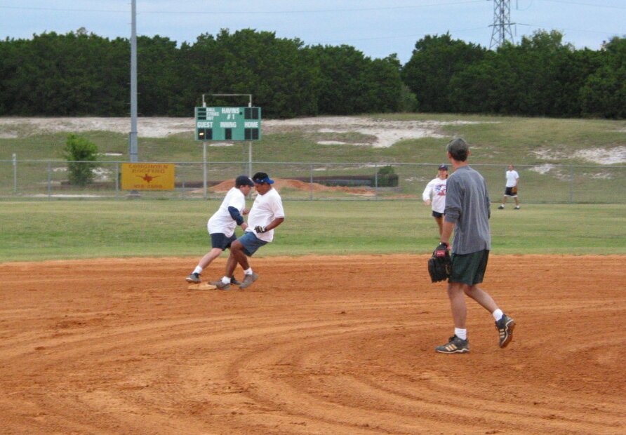 In the bottom of the 1st inning, Neil is about to pick up a ground ball as a runner sprints toward first base, and Michelle F waits to receive the throw. |
