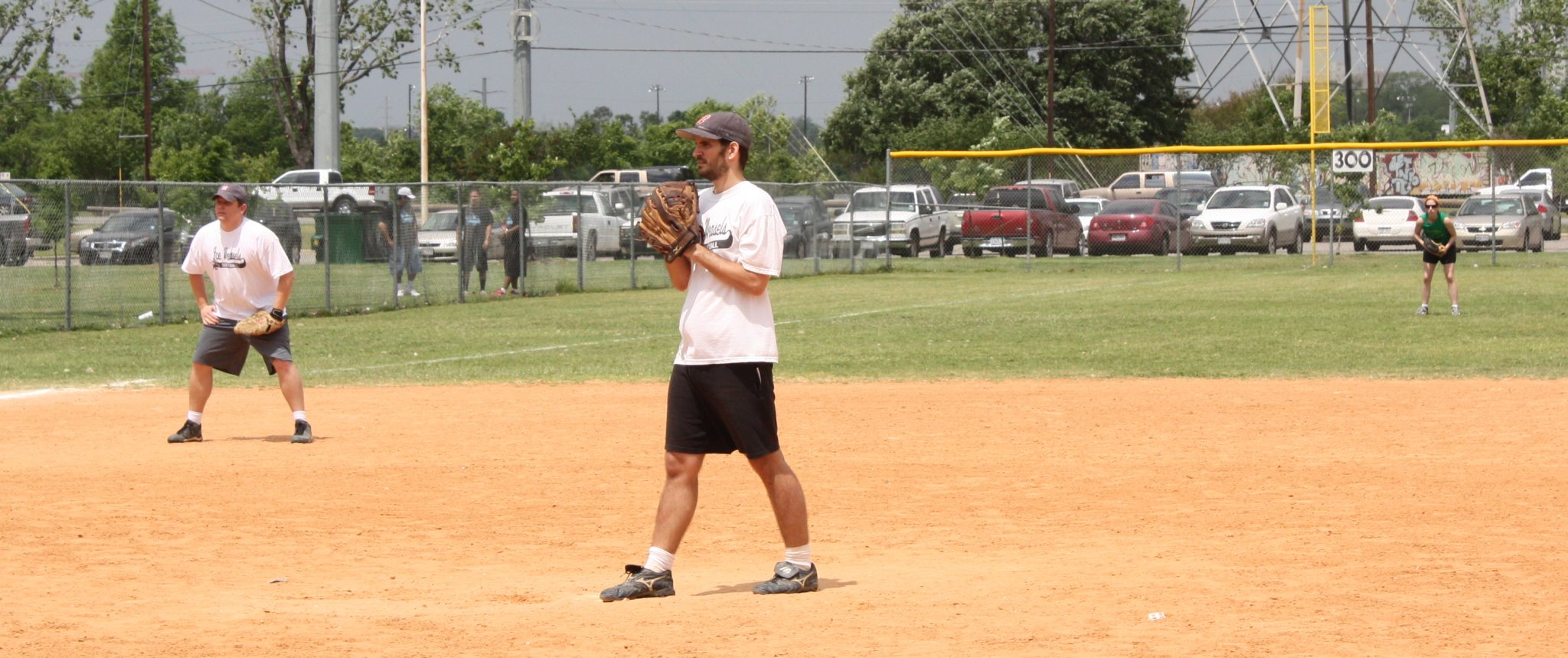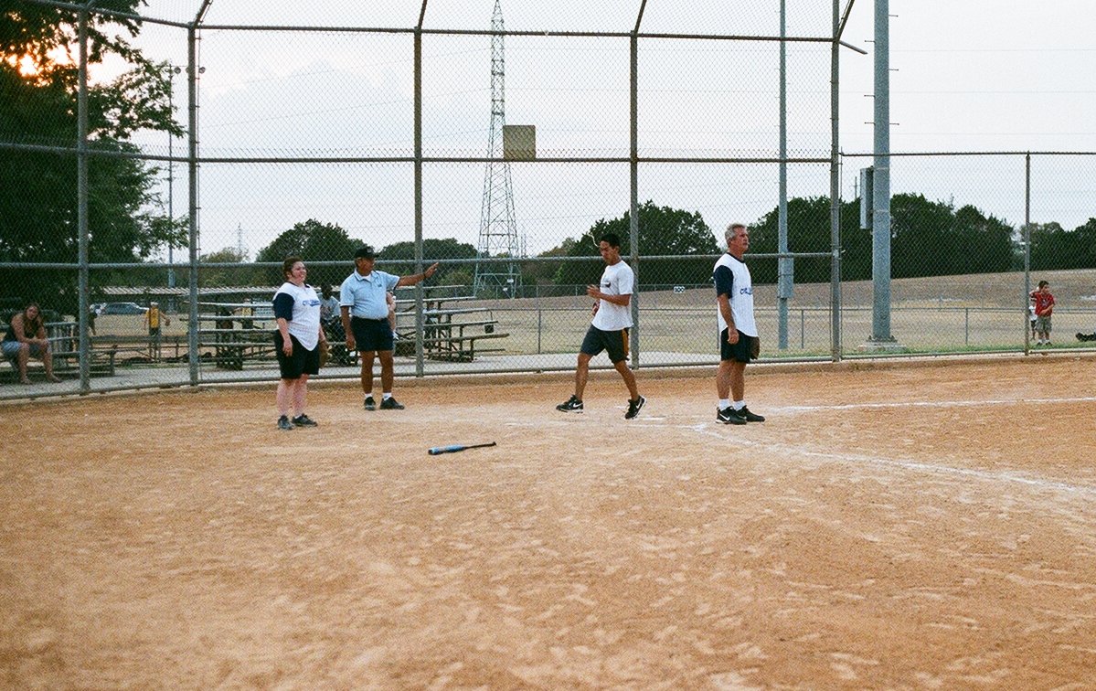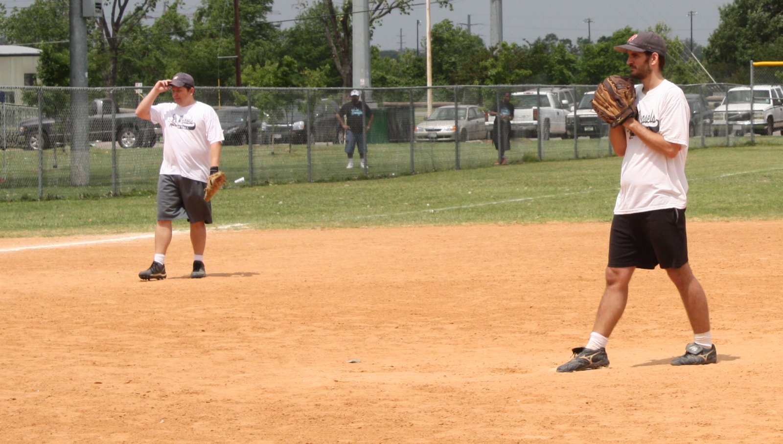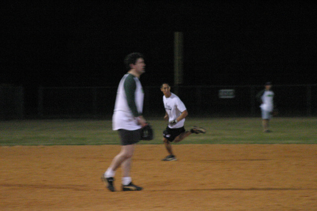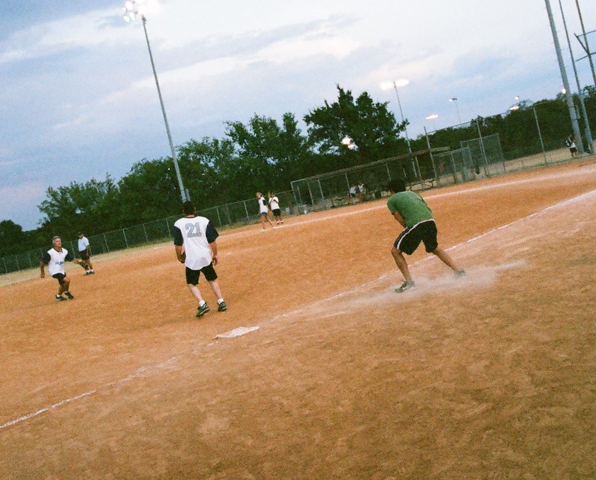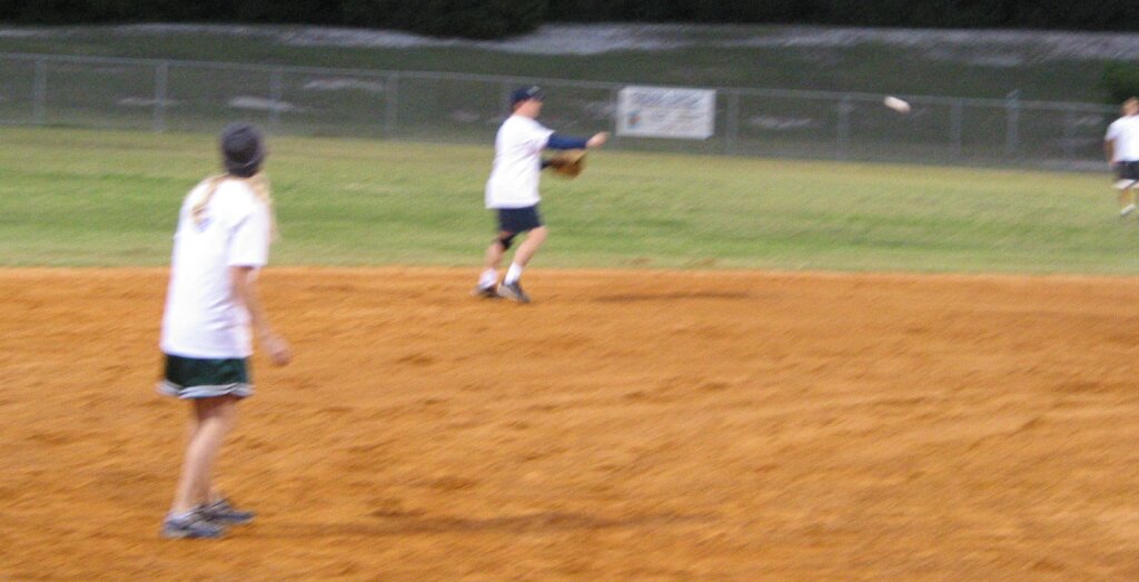 In the bottom of the 1st inning, Neil is about to pick up a ground ball as a runner sprints toward first base, and Michelle F waits to receive the throw. |