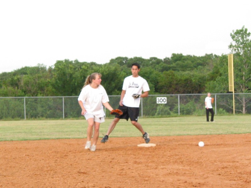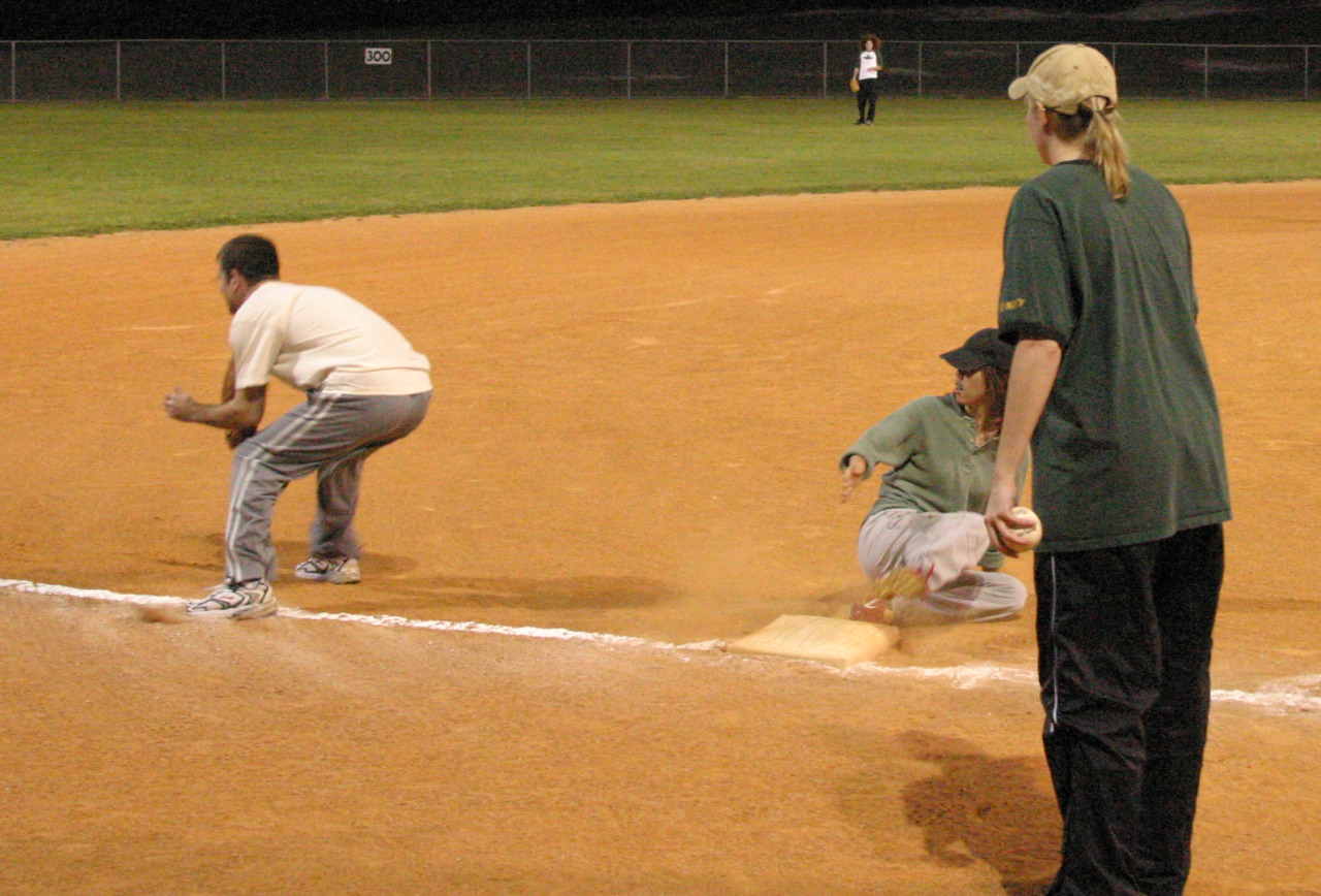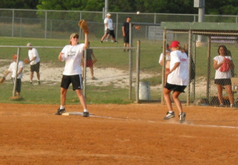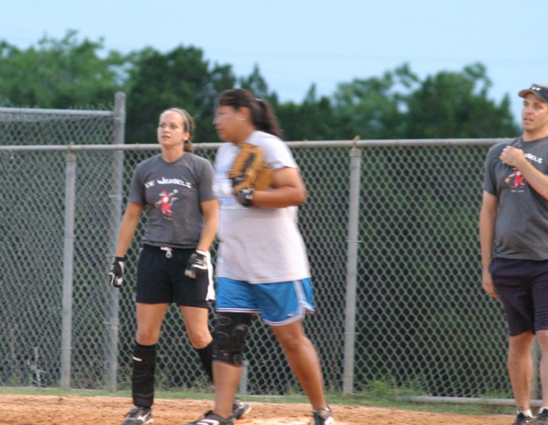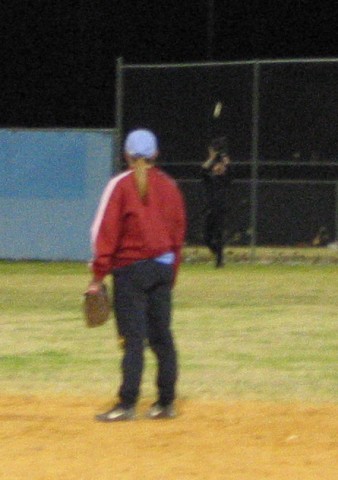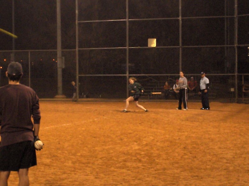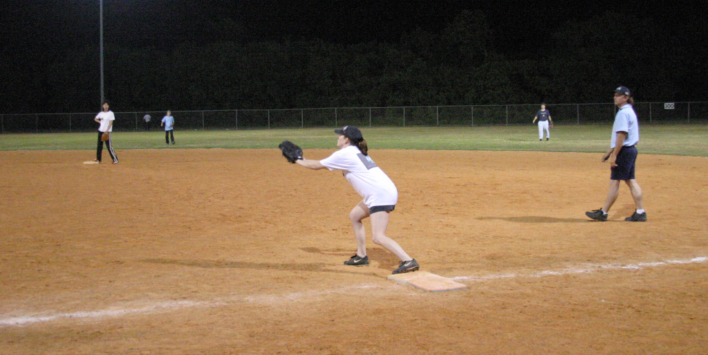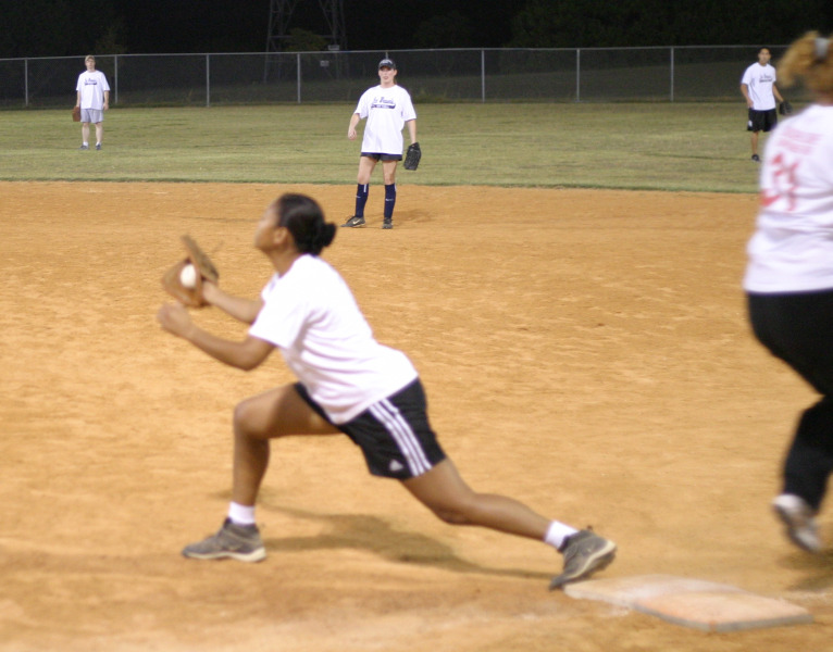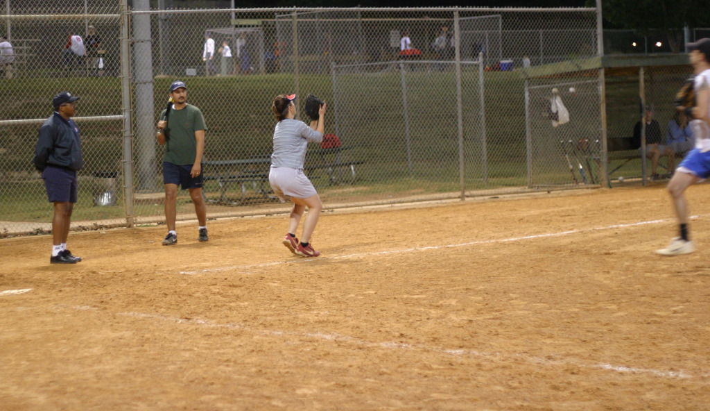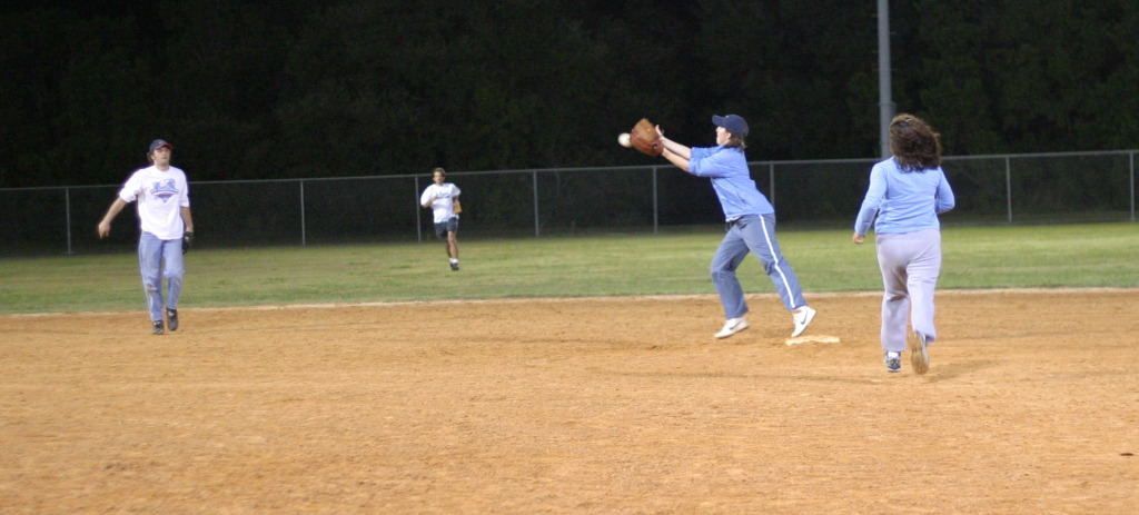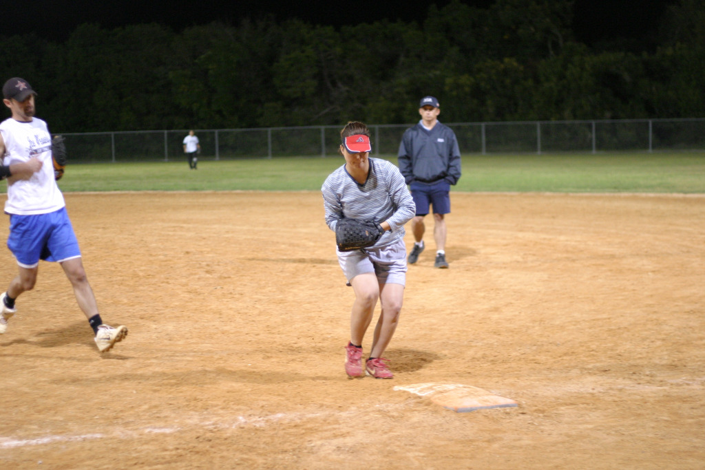 Aimee catches the ball at first base. Hawi (pitcher) and Matt (3b) can be seen in the background |