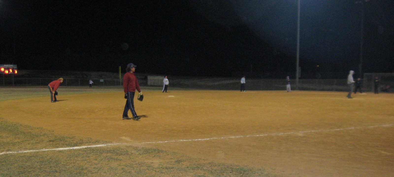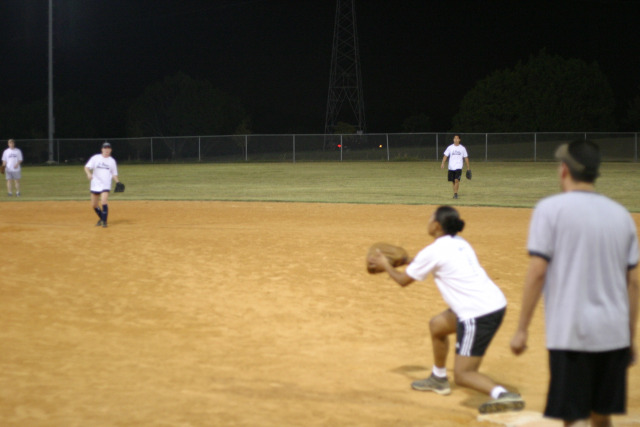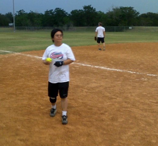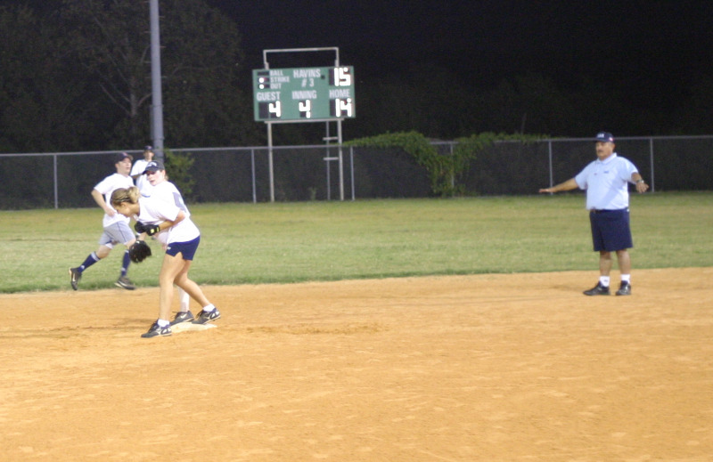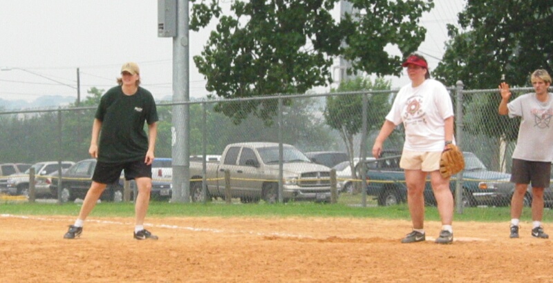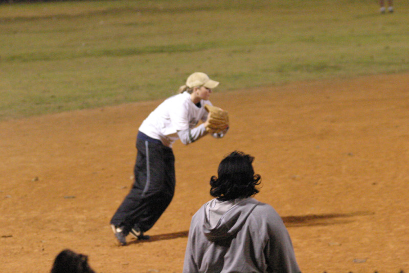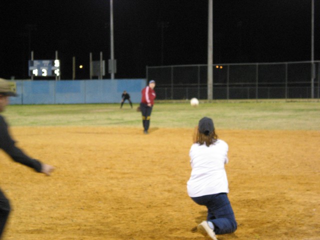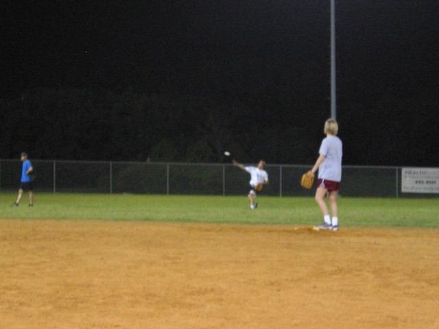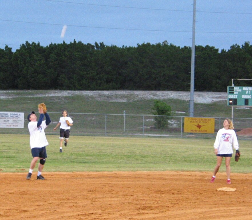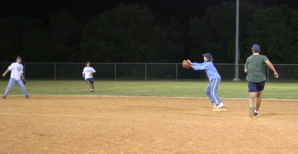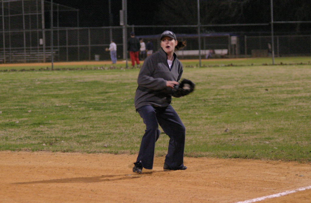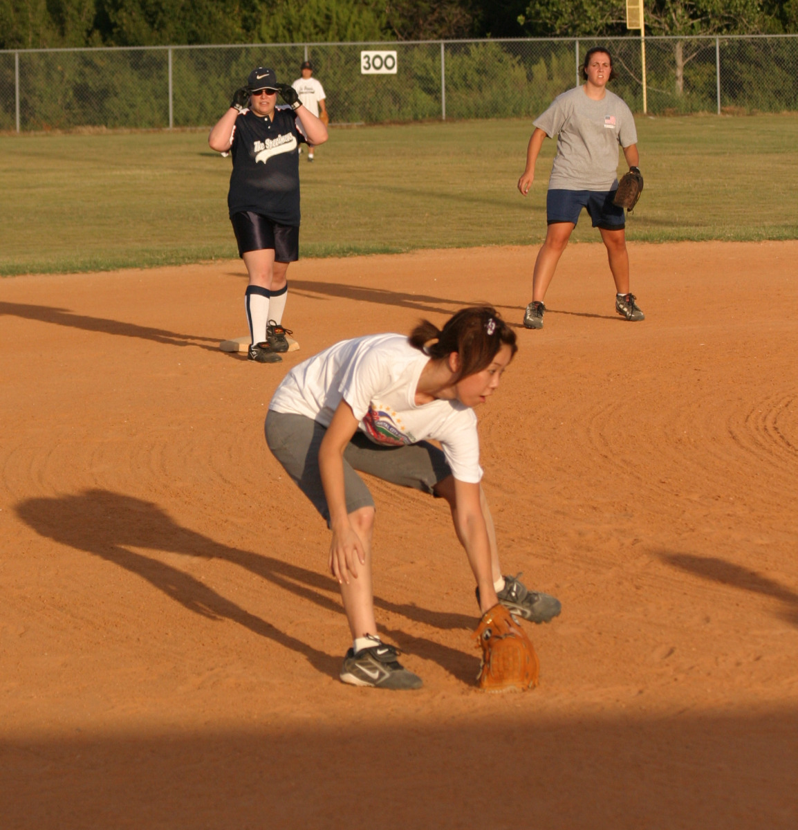 Aimee catches the ball at first base. Hawi (pitcher) and Matt (3b) can be seen in the background |