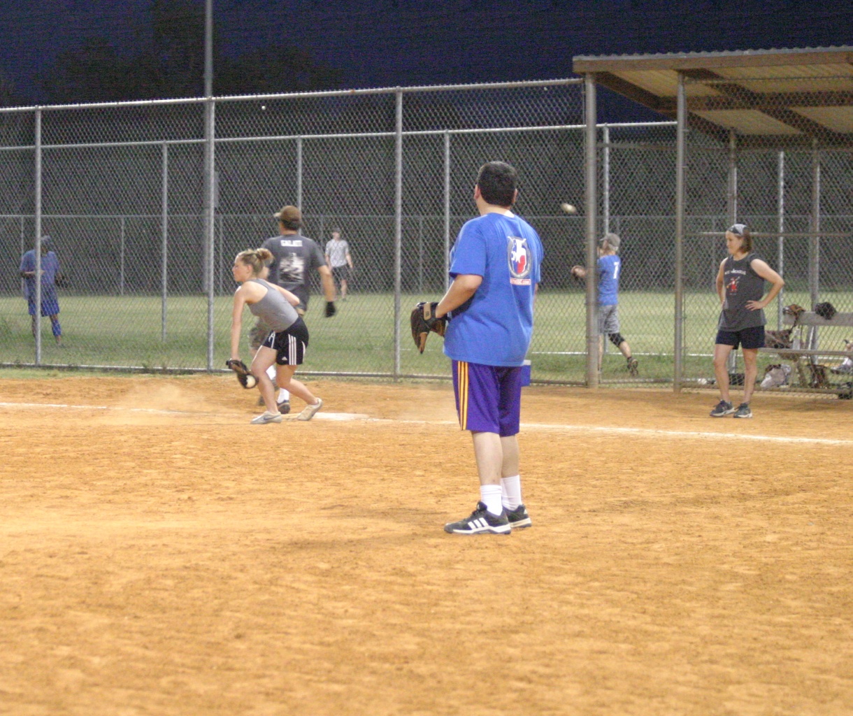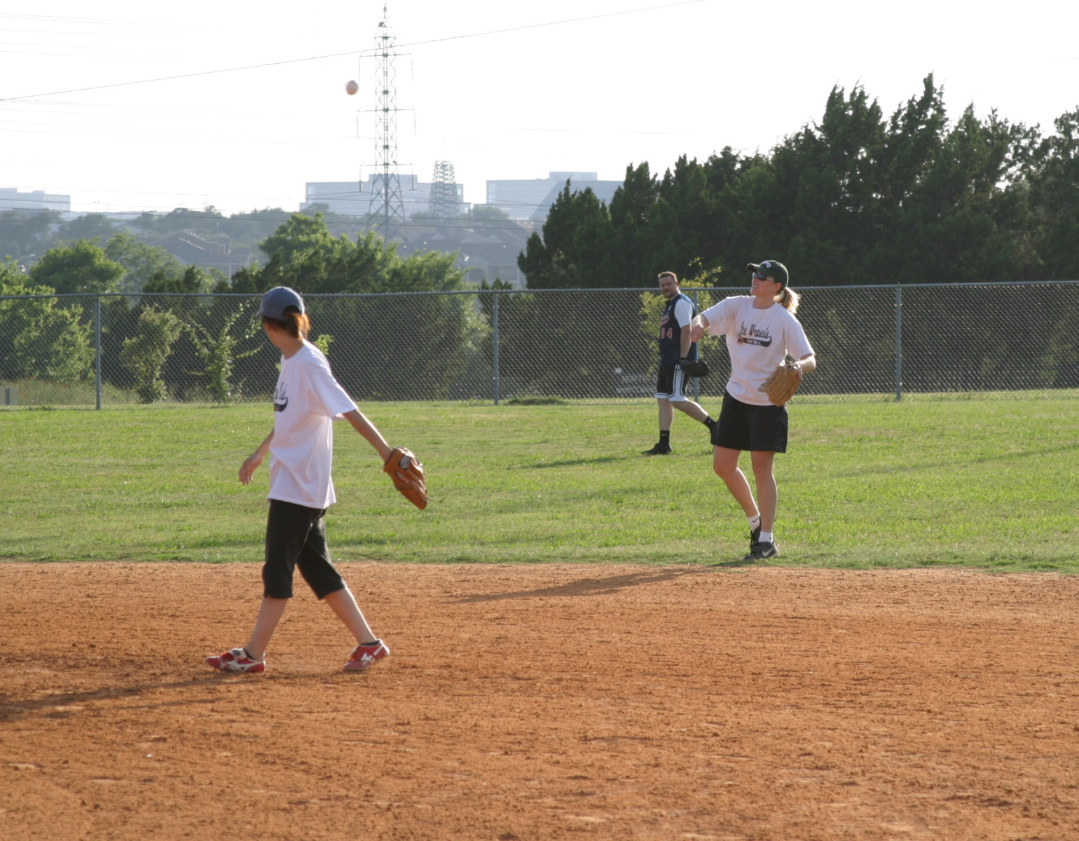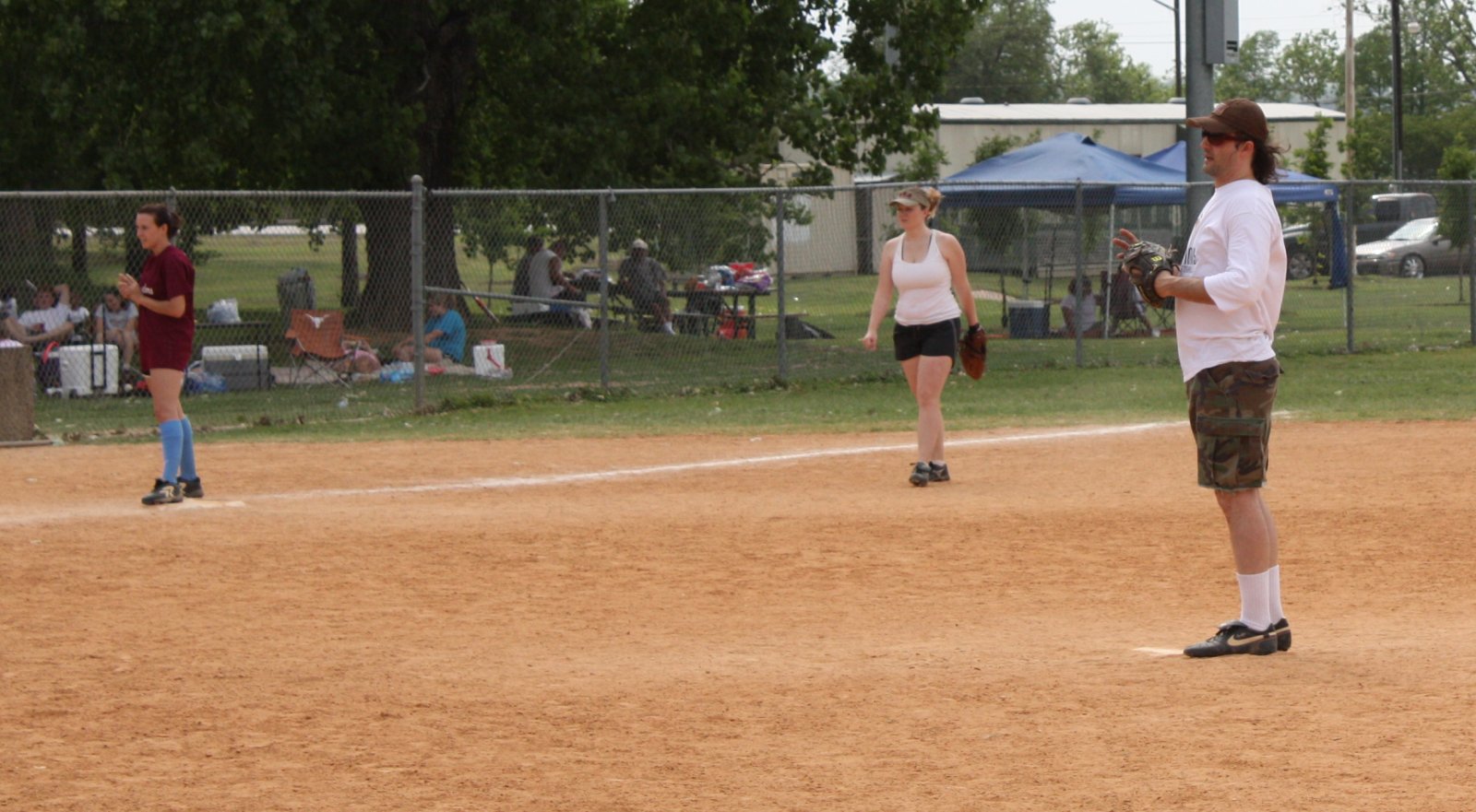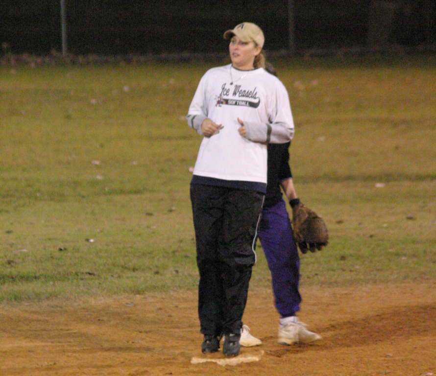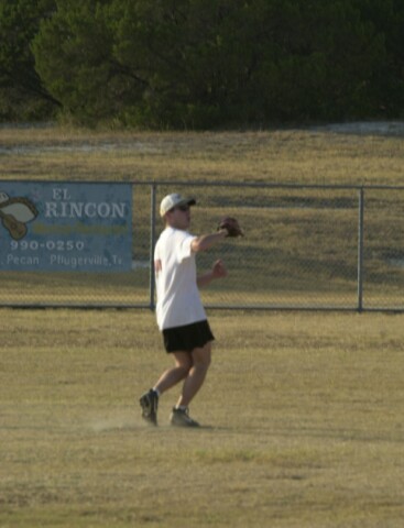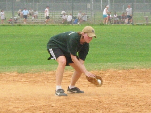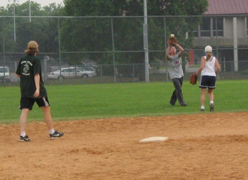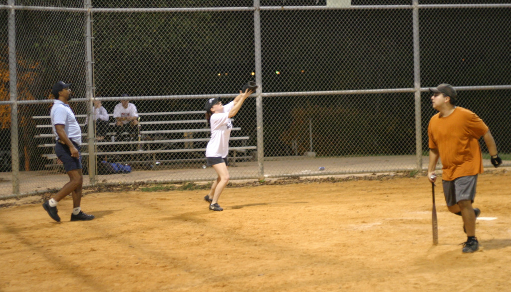 Aimee catches the ball at first base. Hawi (pitcher) and Matt (3b) can be seen in the background |