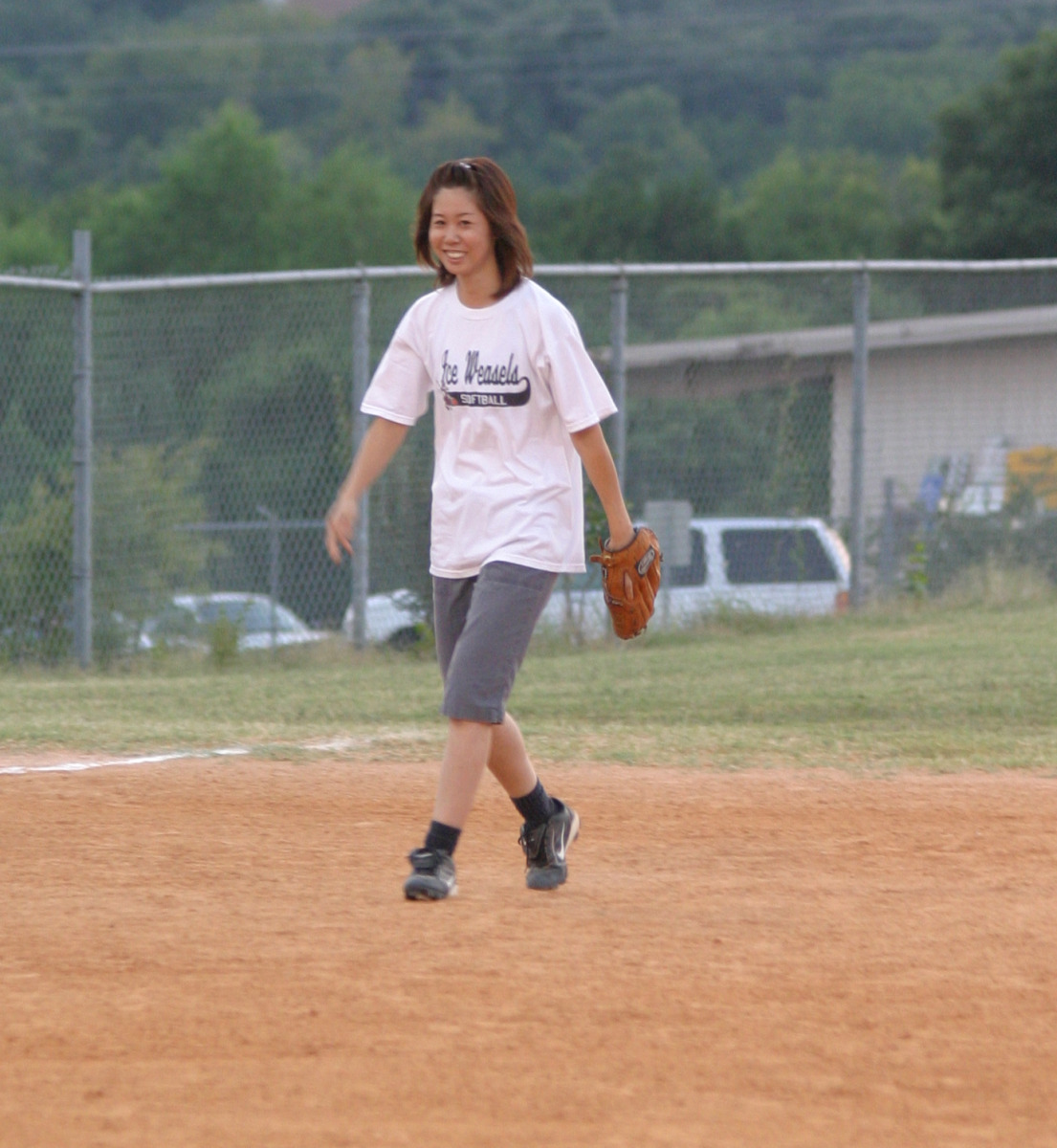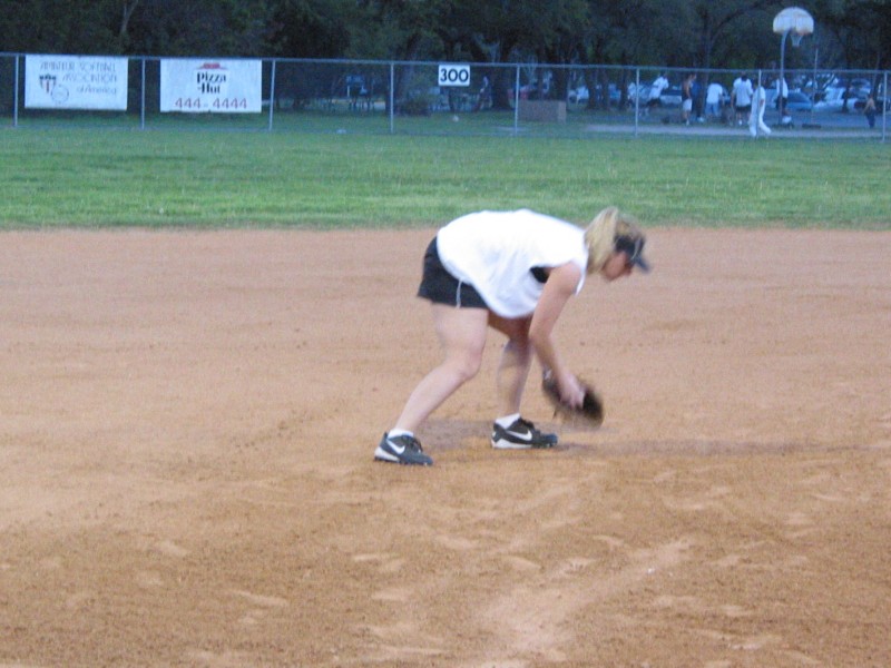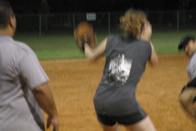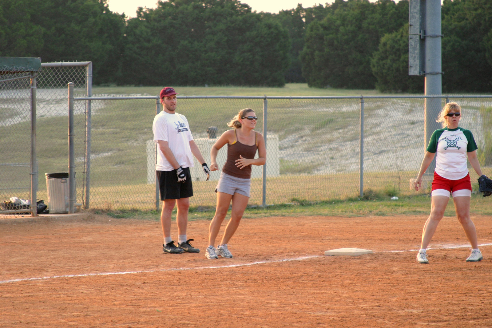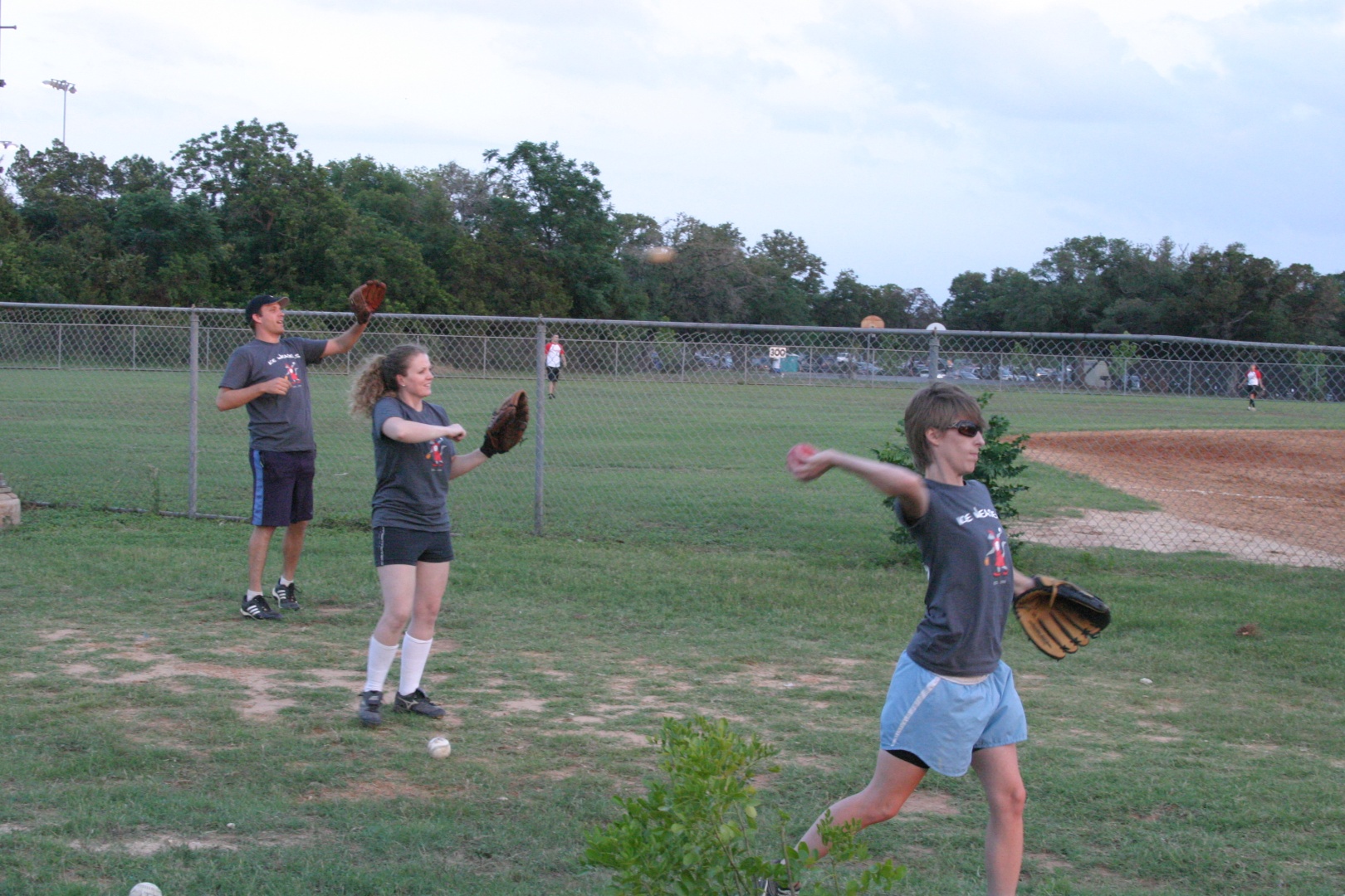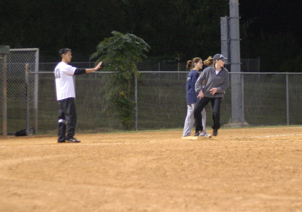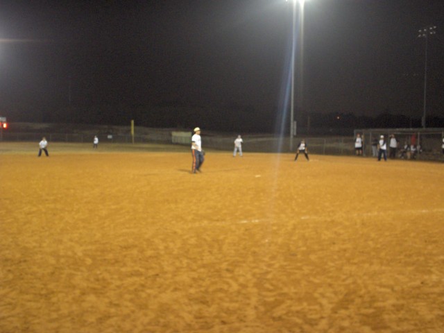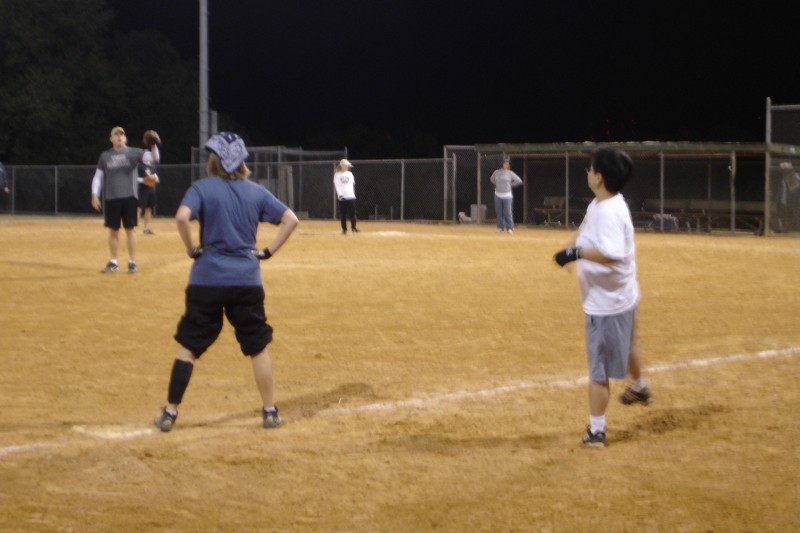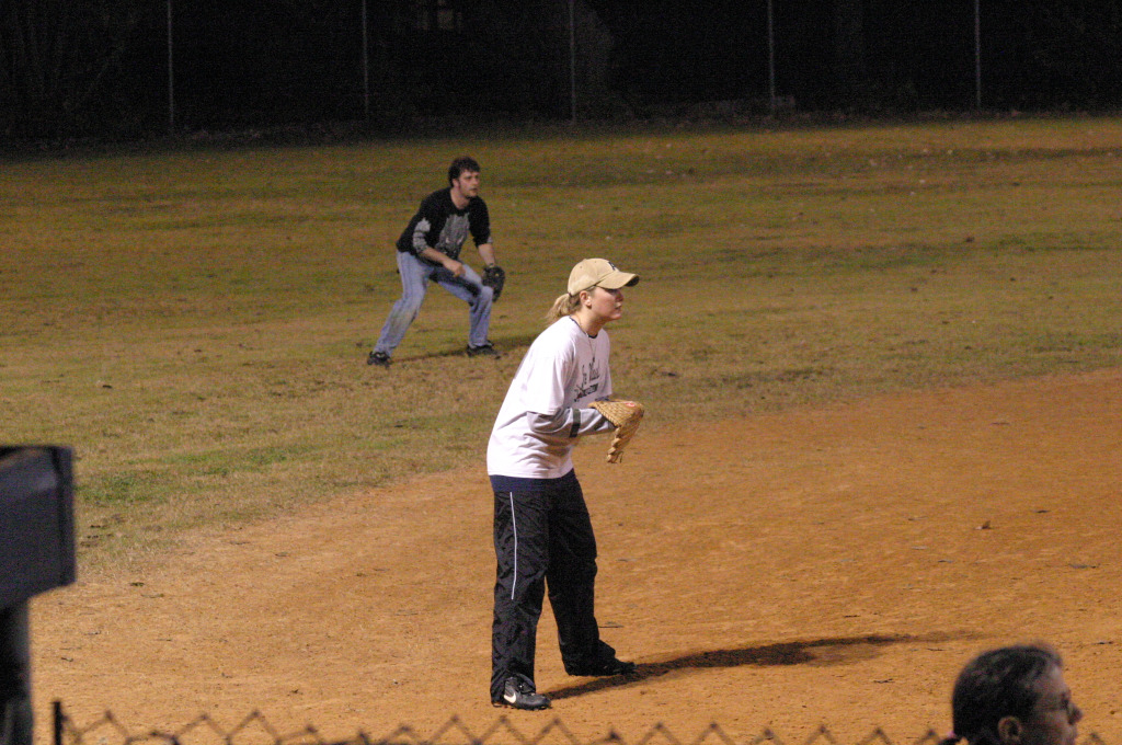 Aimee catches the ball at first base. Hawi (pitcher) and Matt (3b) can be seen in the background |
