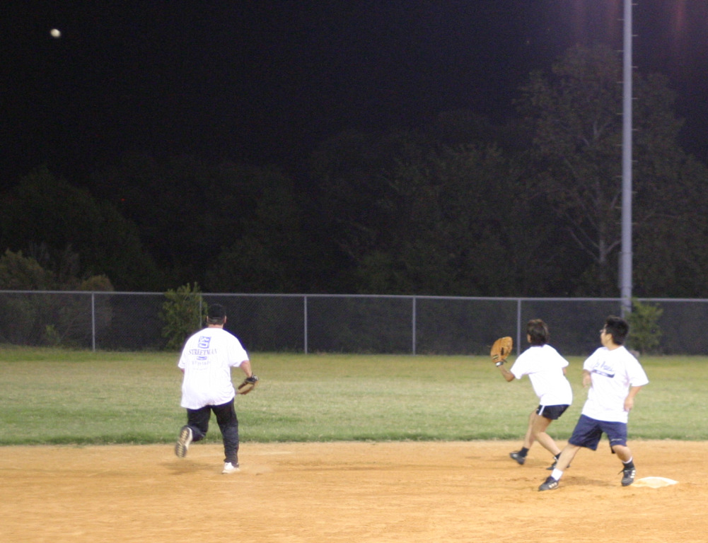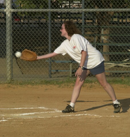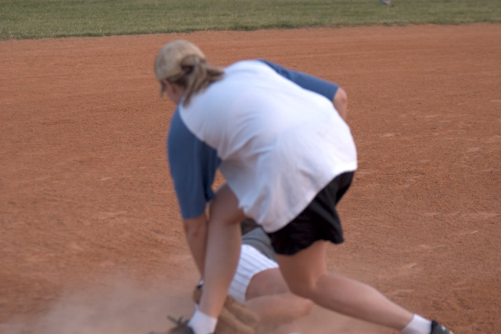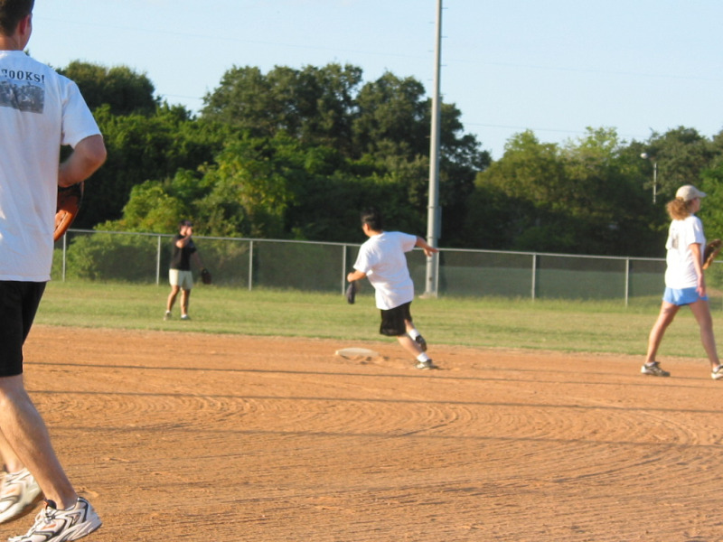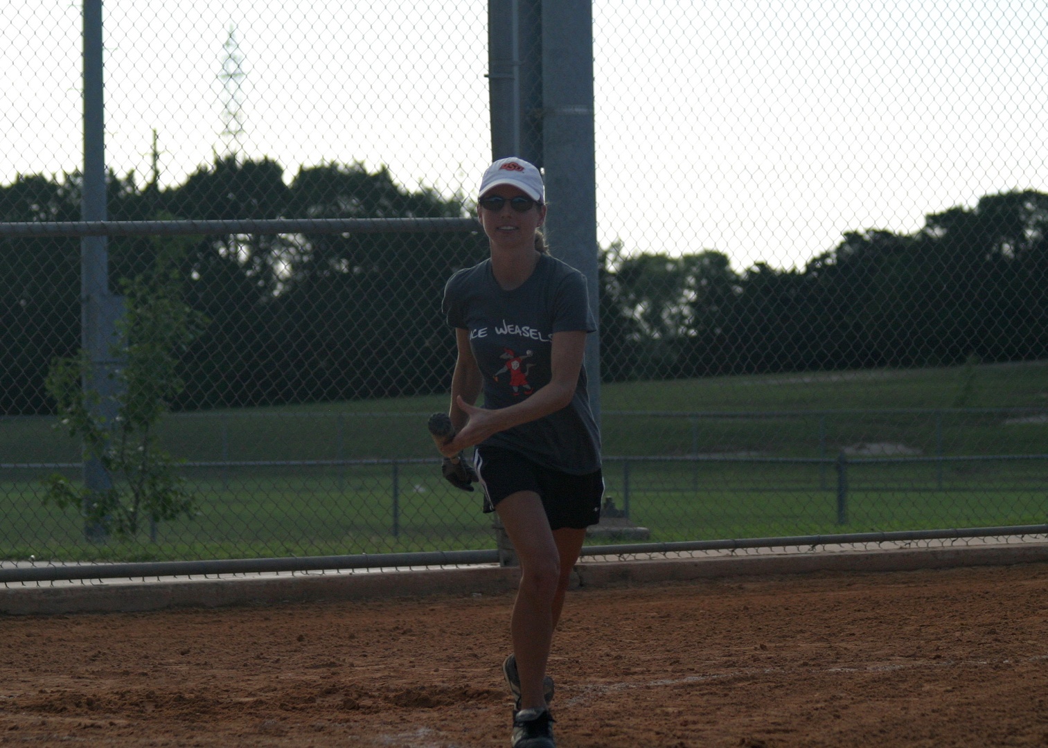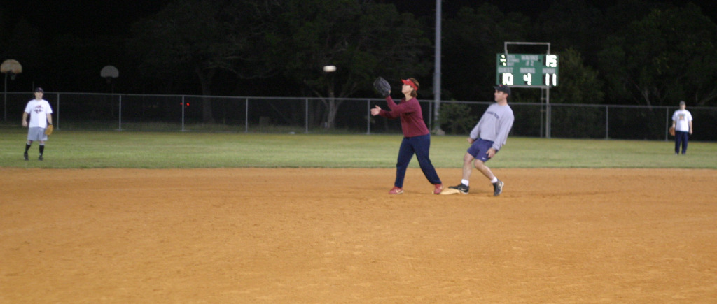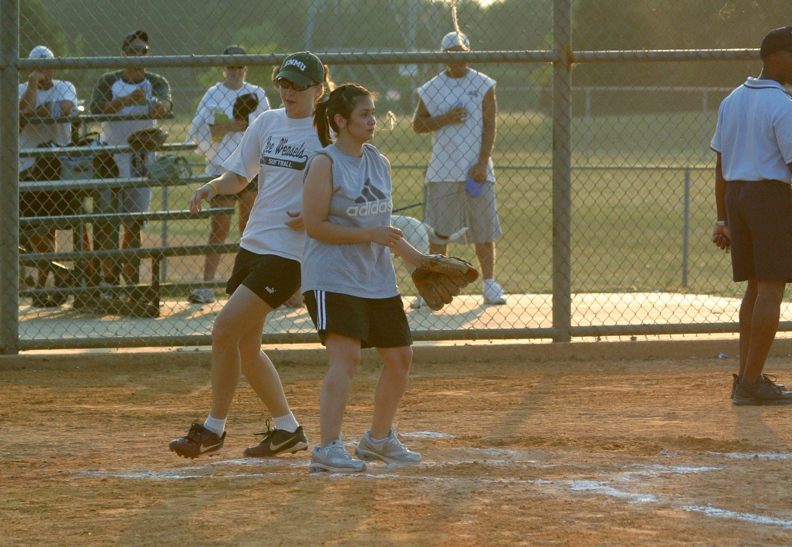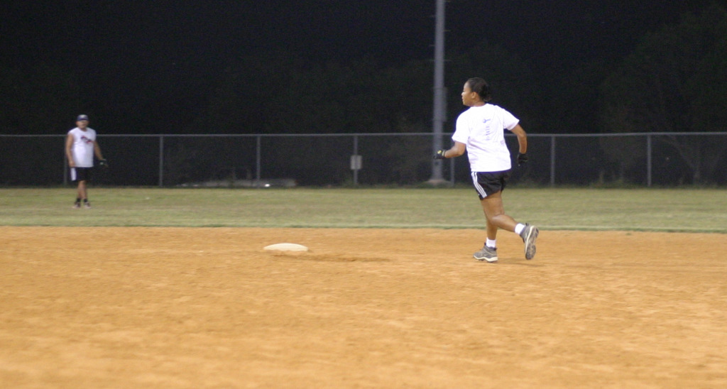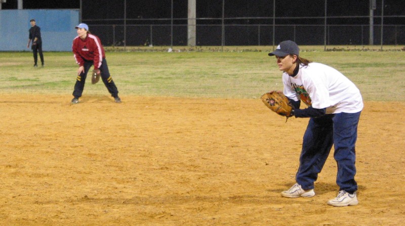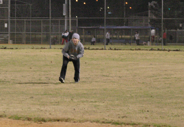 Aimee catches the ball at first base. Hawi (pitcher) and Matt (3b) can be seen in the background |