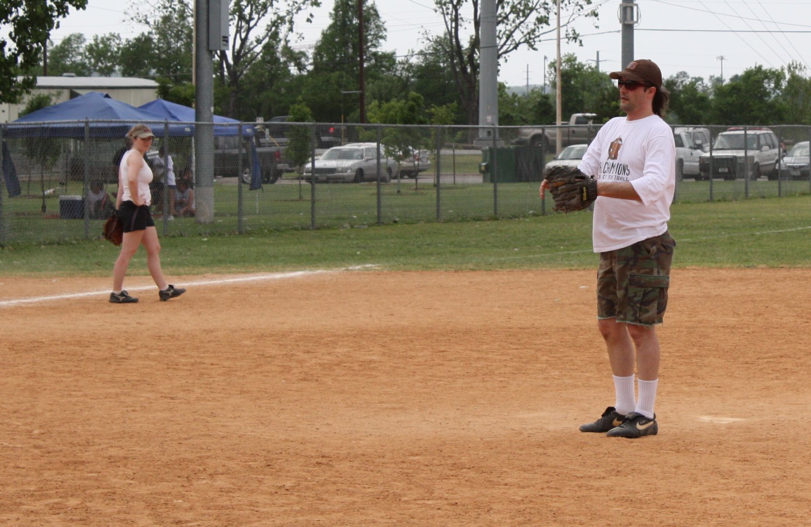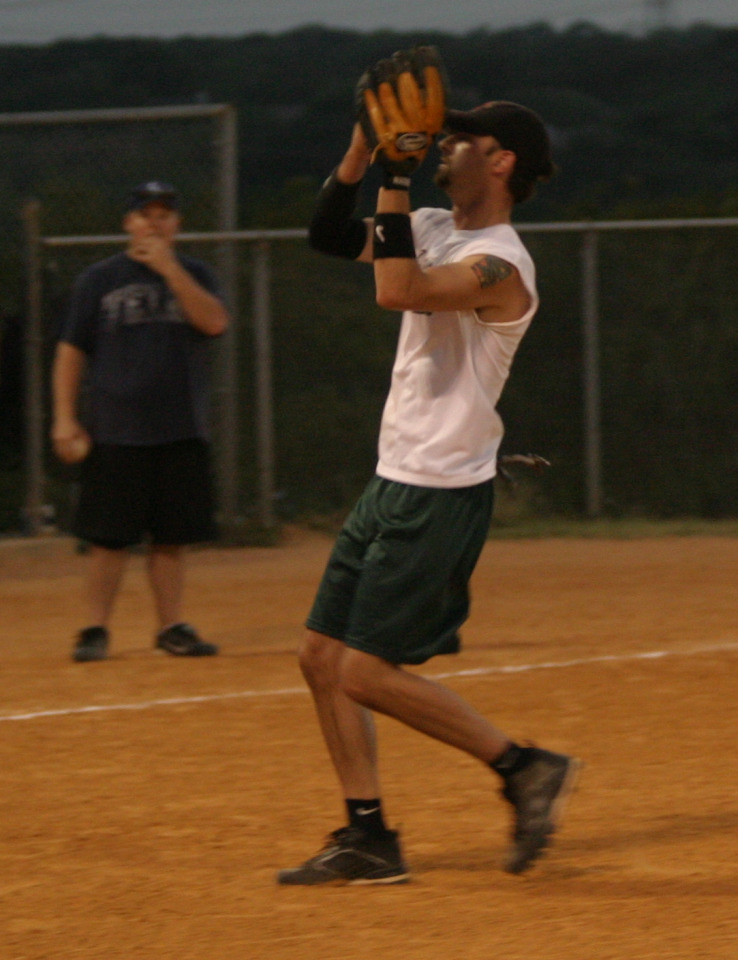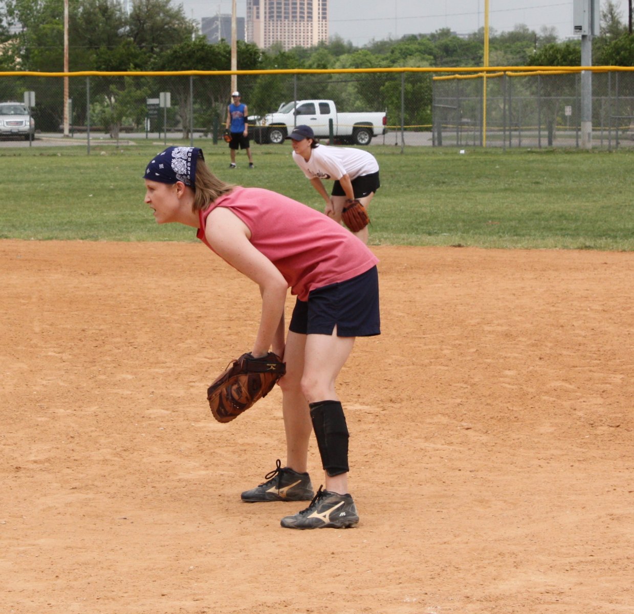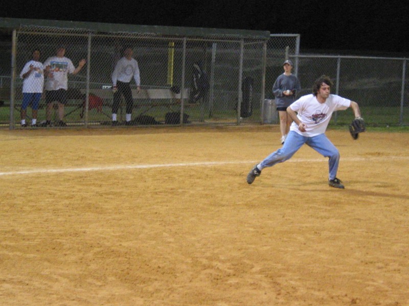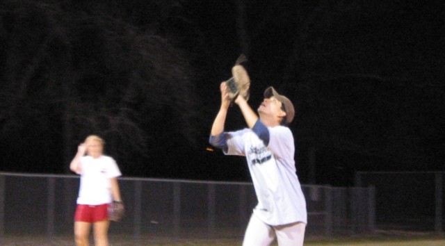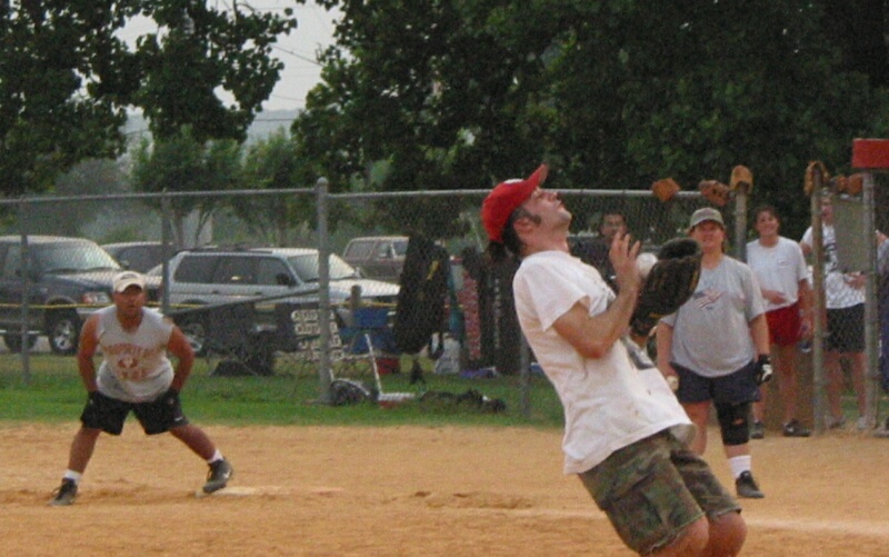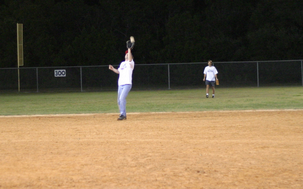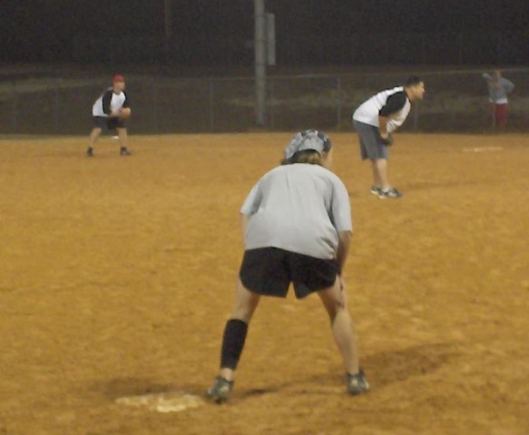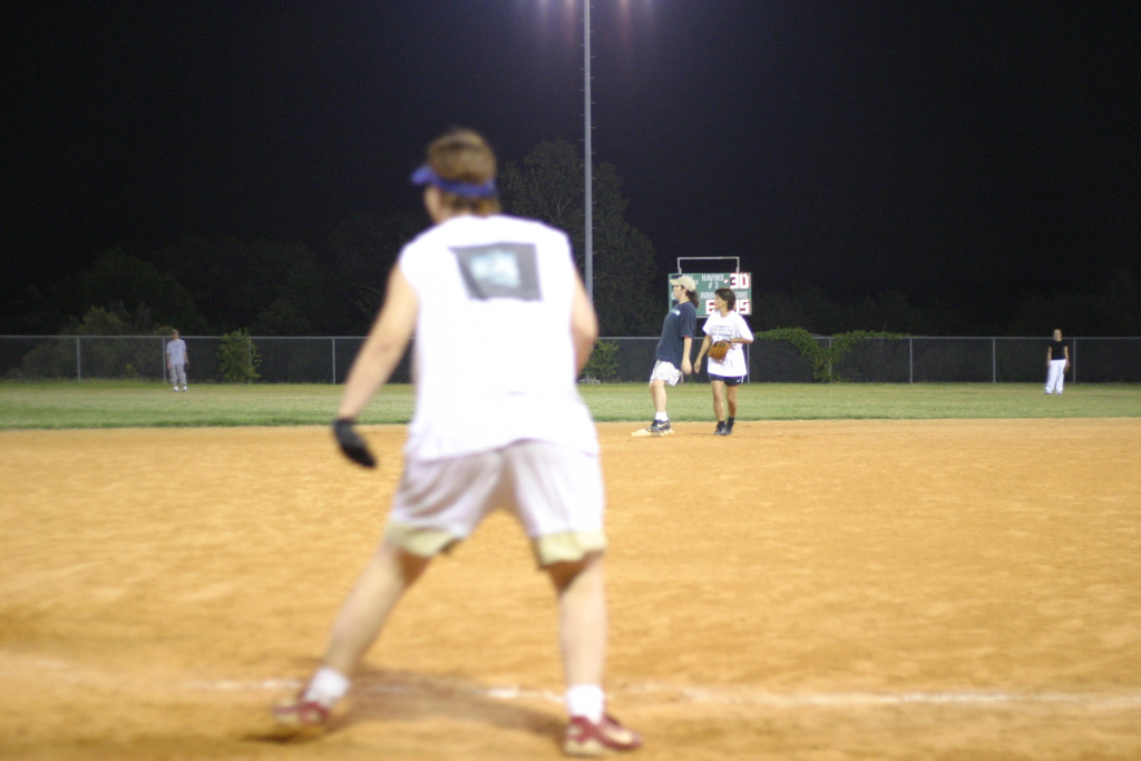 Aimee catches the ball at first base. Hawi (pitcher) and Matt (3b) can be seen in the background |