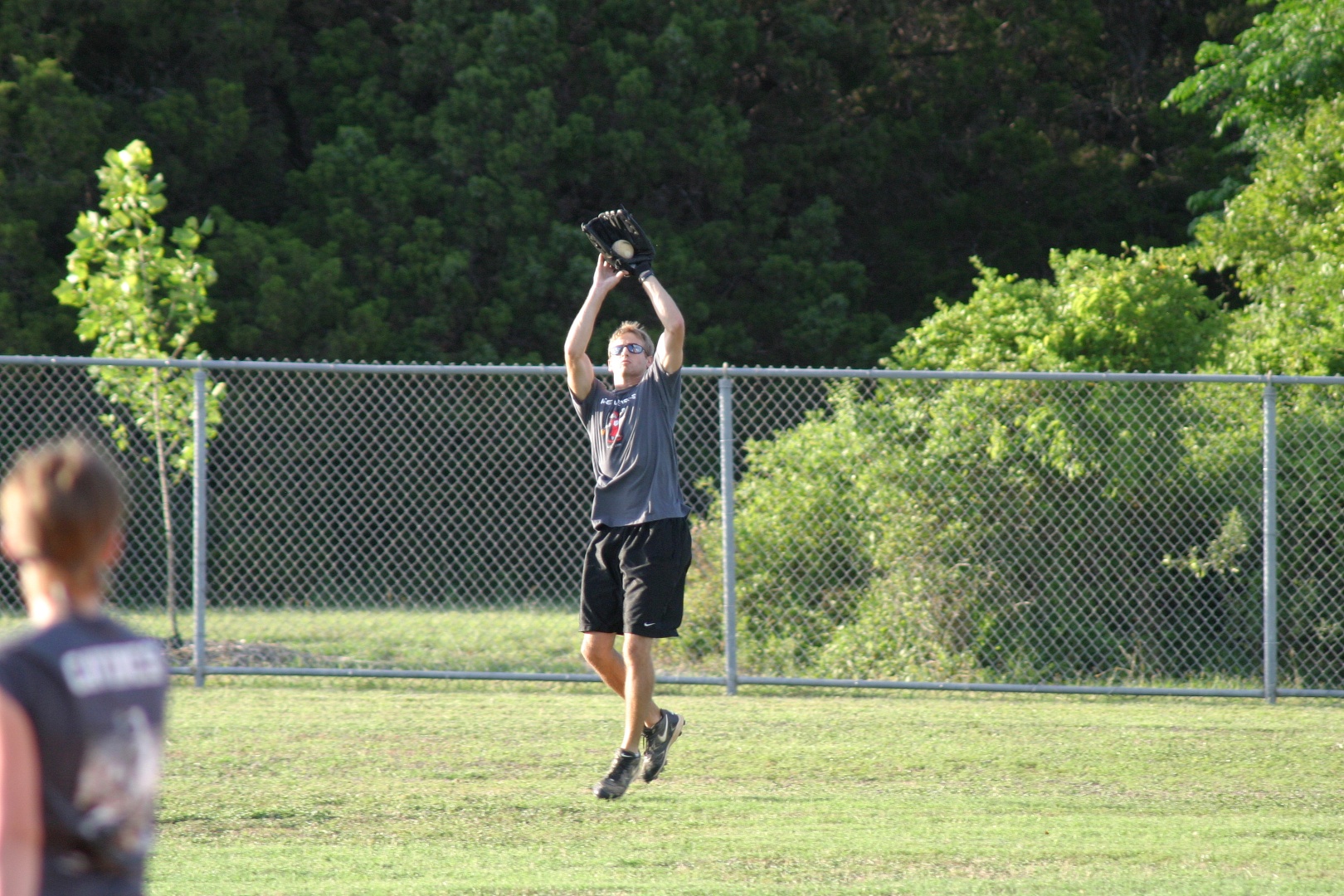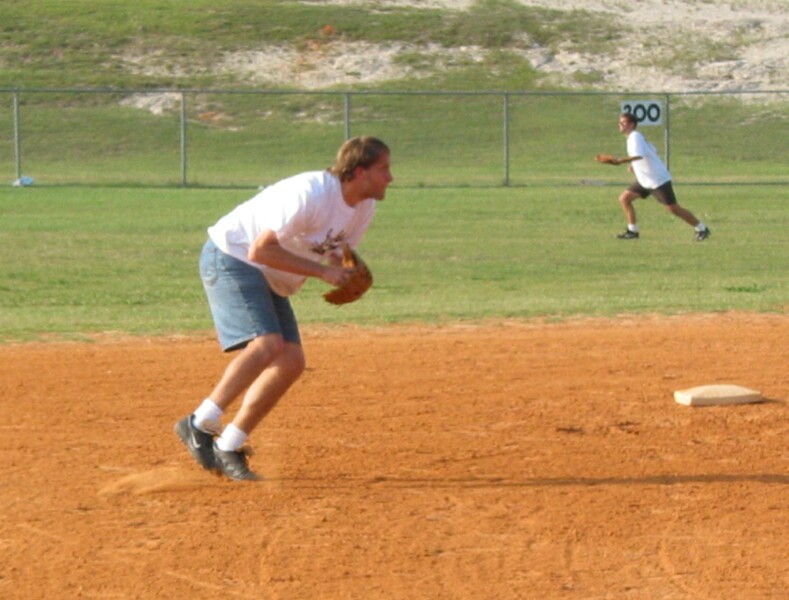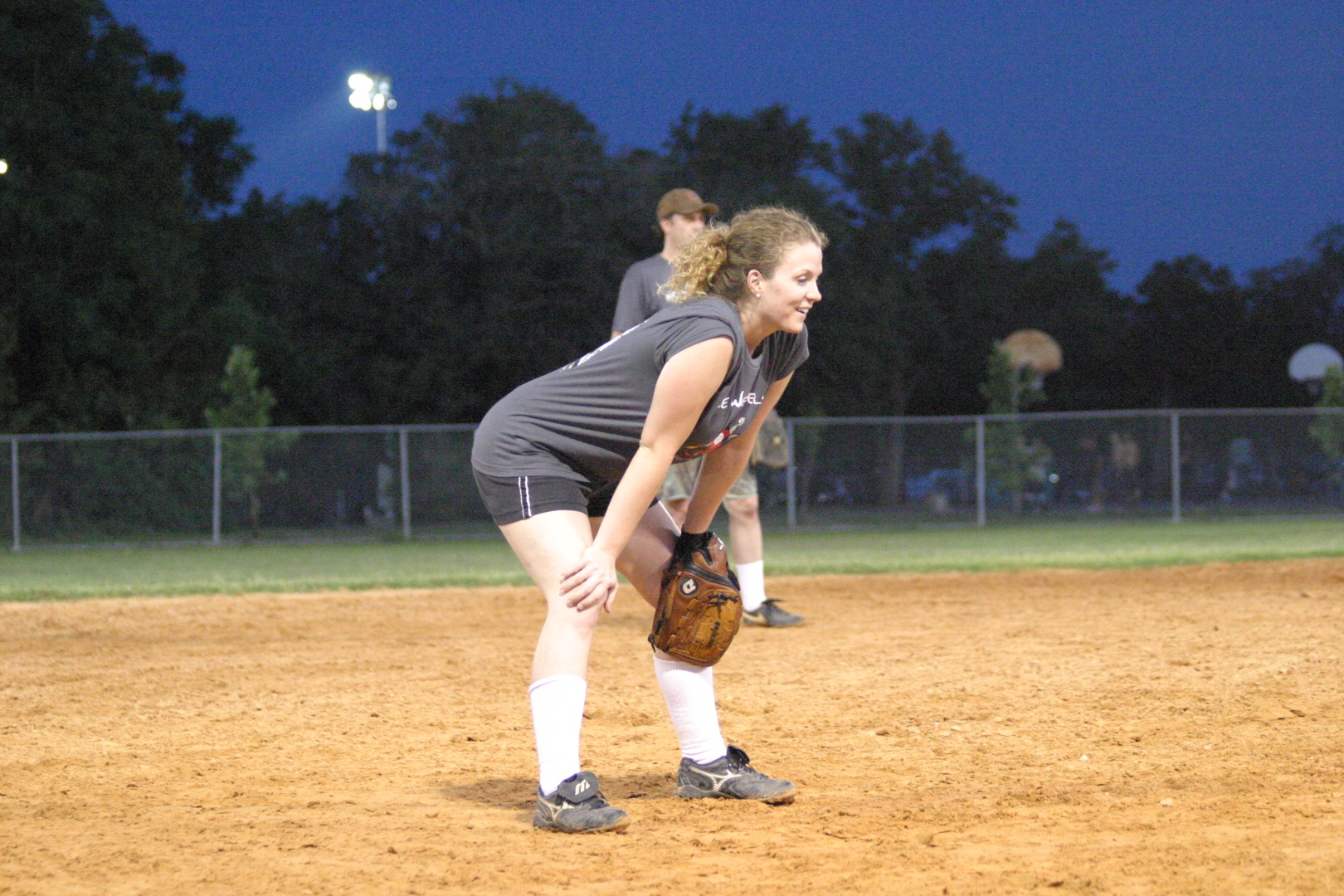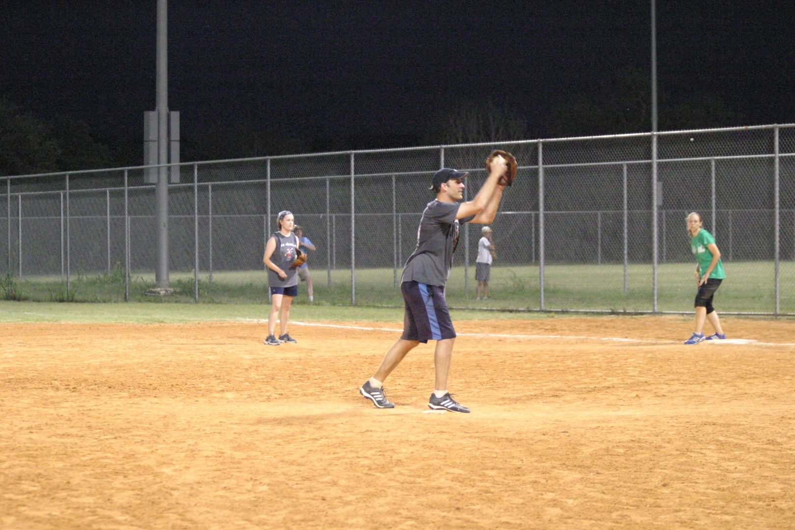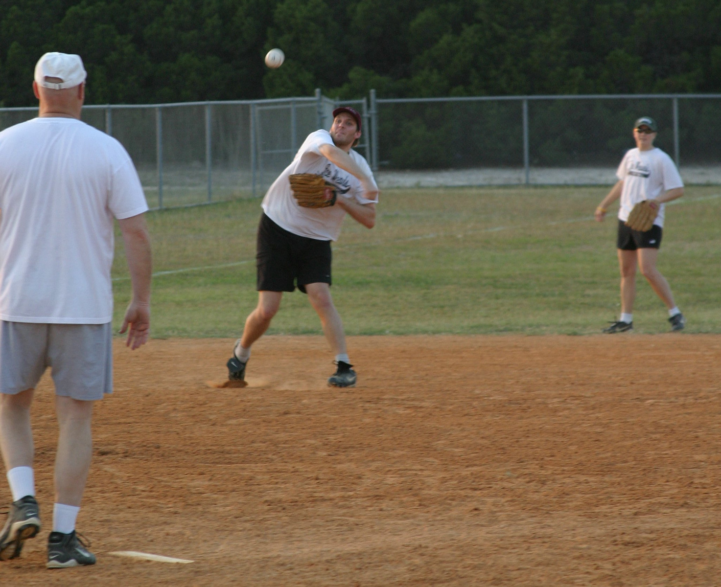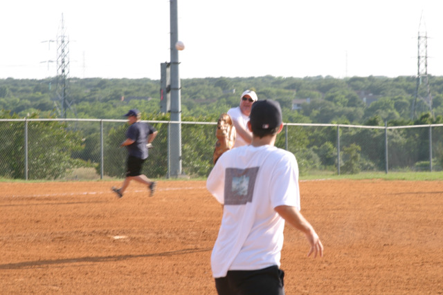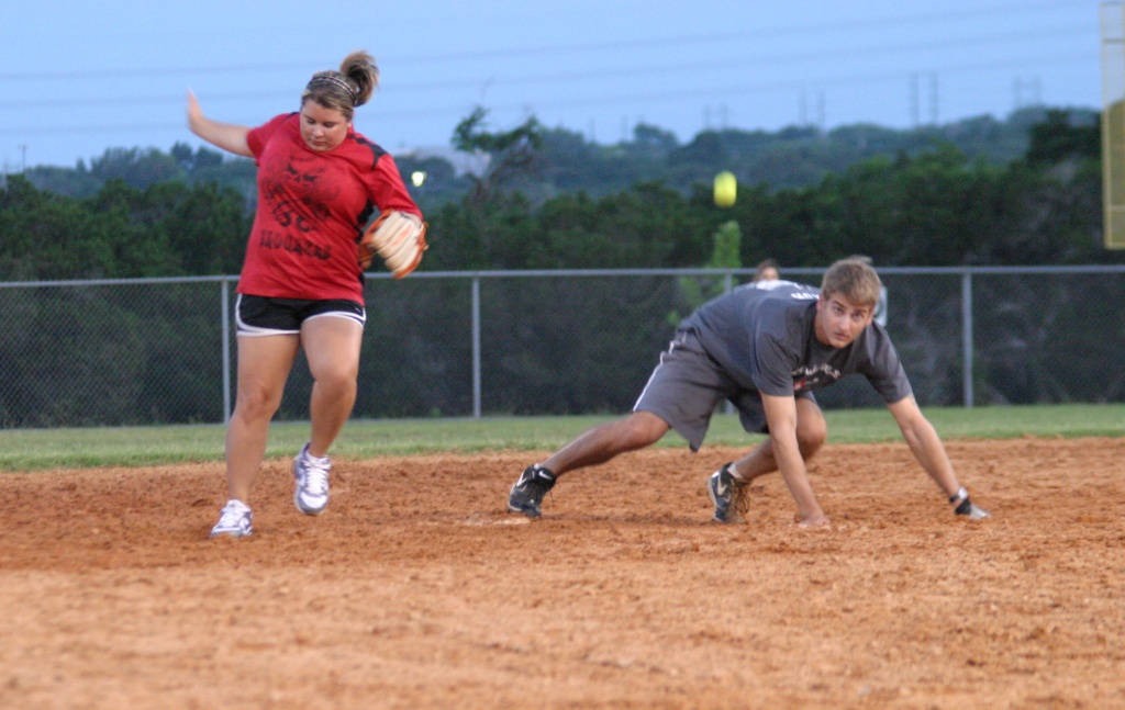 Aimee catches the ball at first base. Hawi (pitcher) and Matt (3b) can be seen in the background |