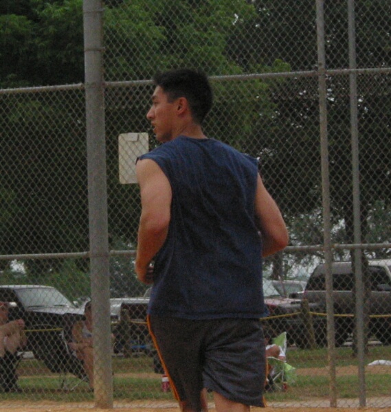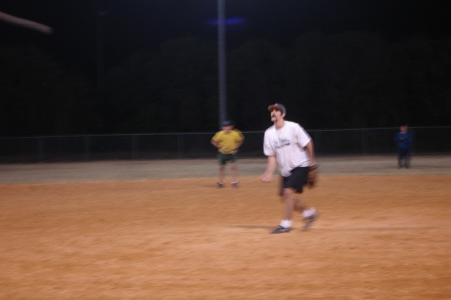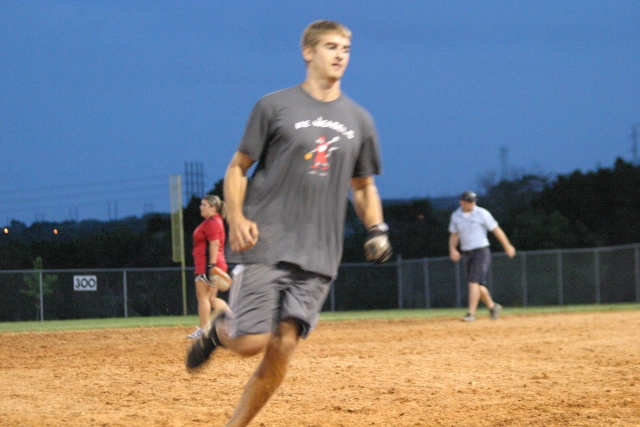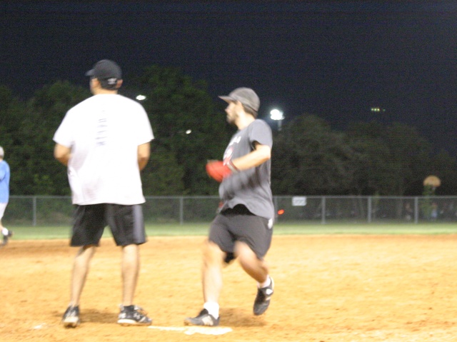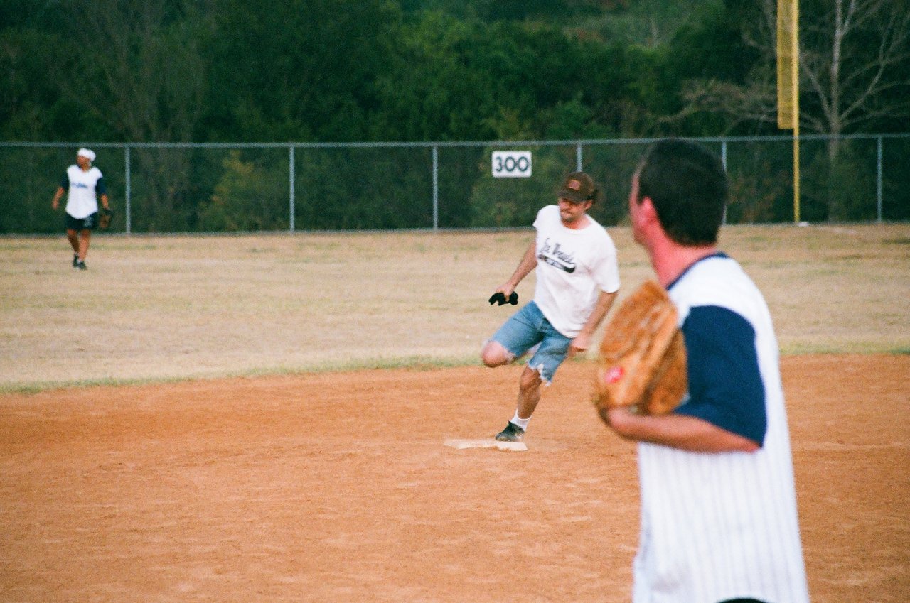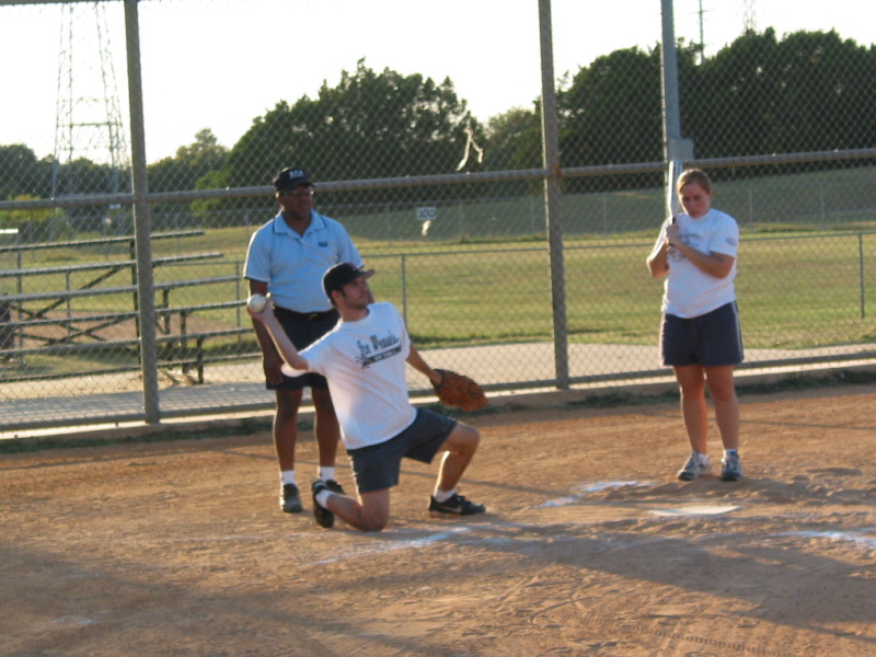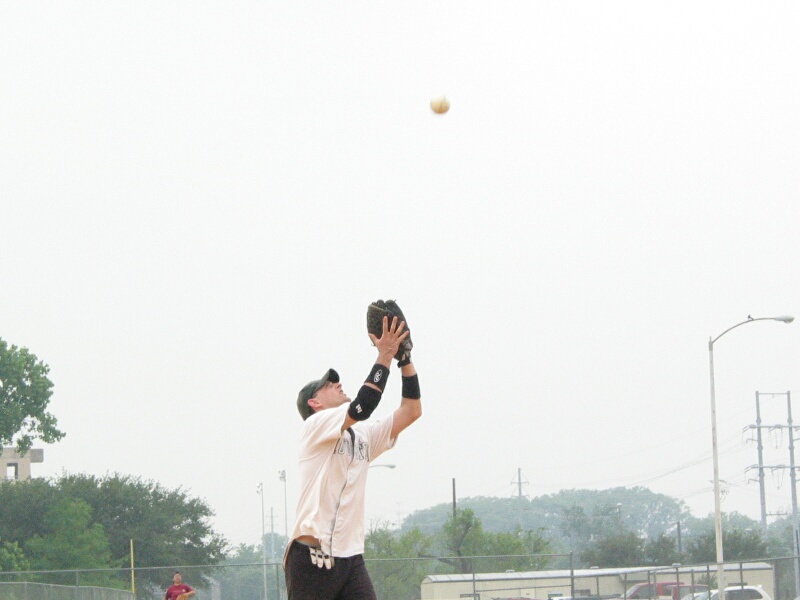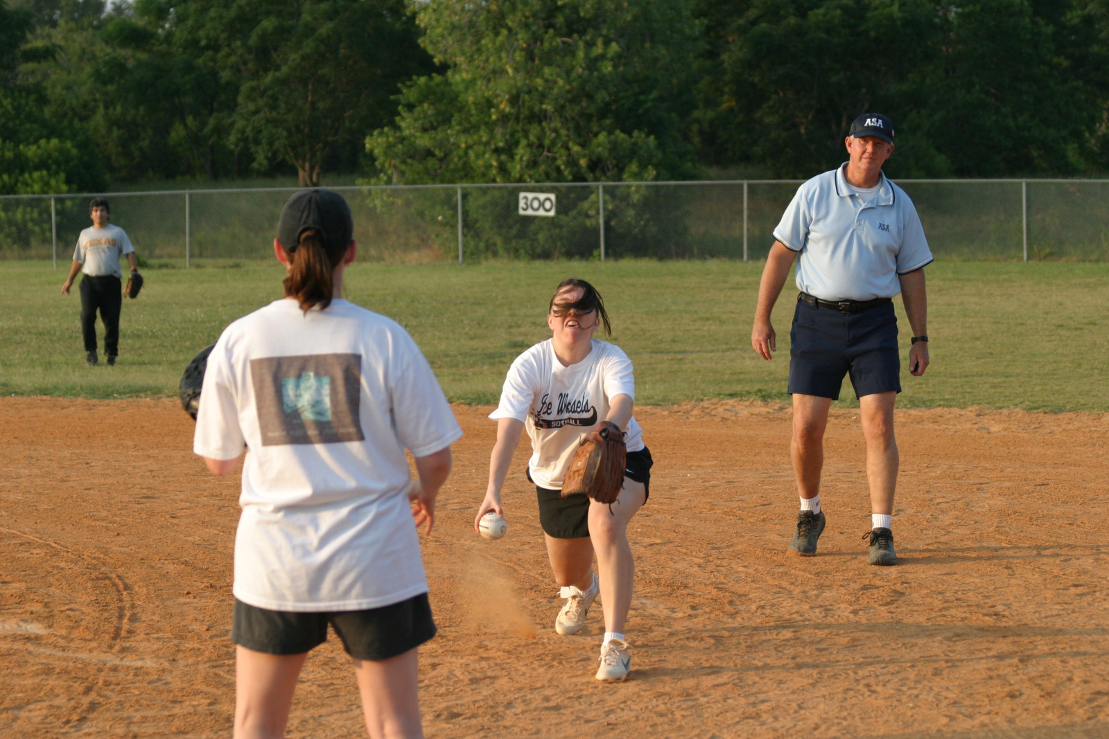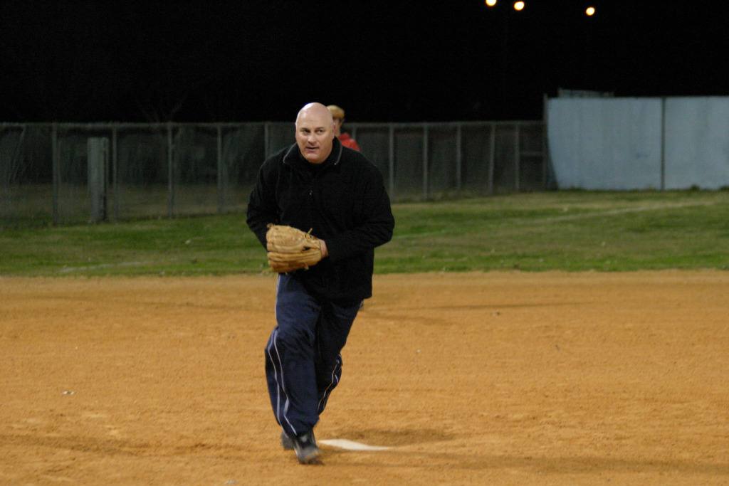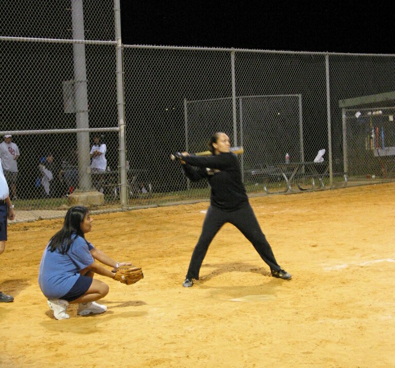 Aimee catches the ball at first base. Hawi (pitcher) and Matt (3b) can be seen in the background |