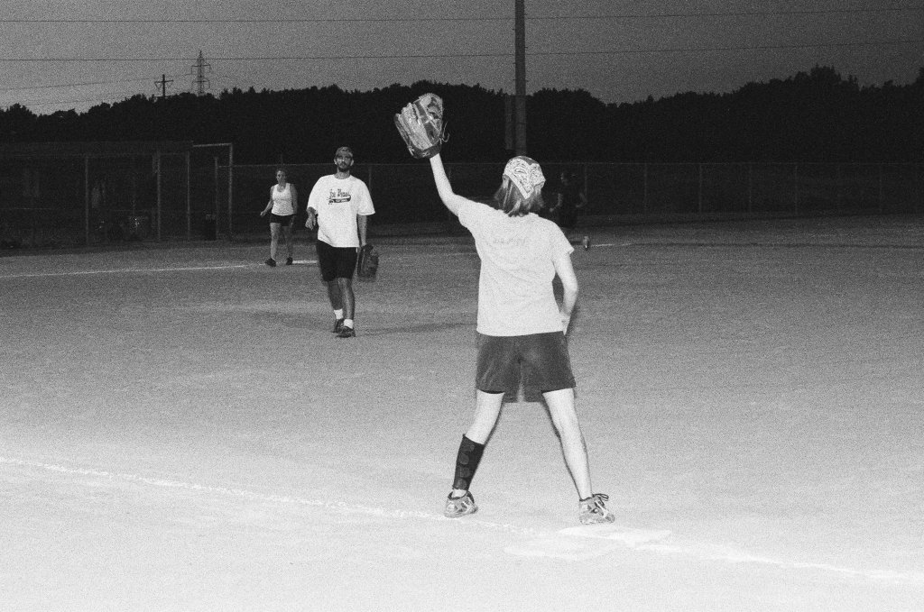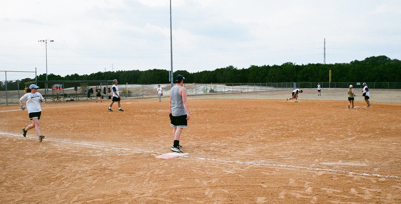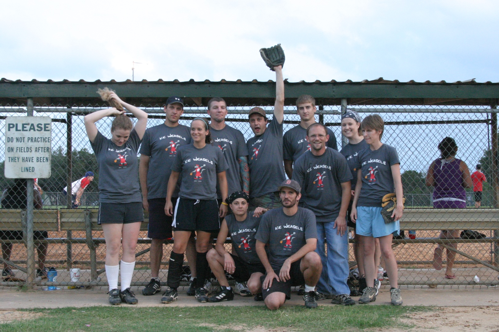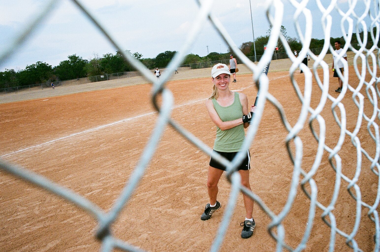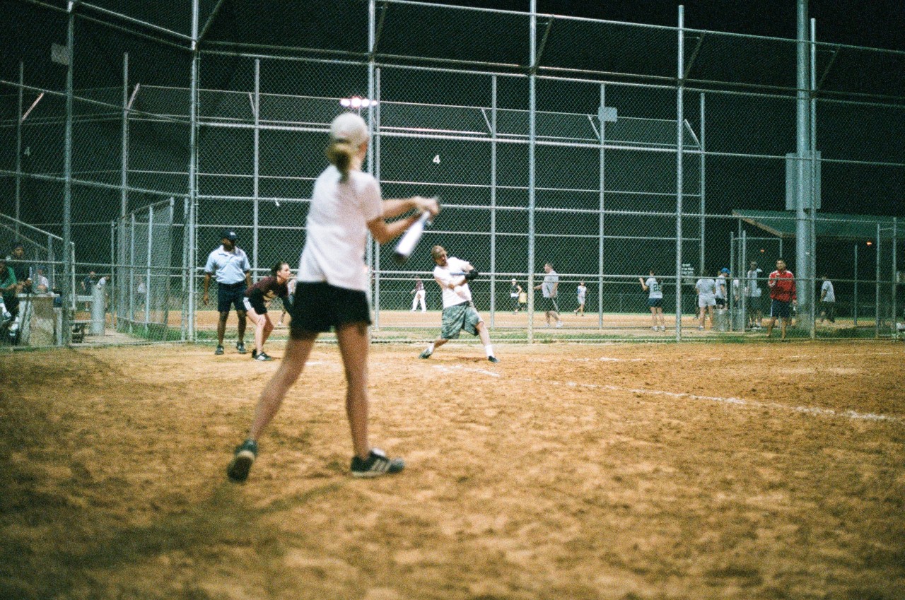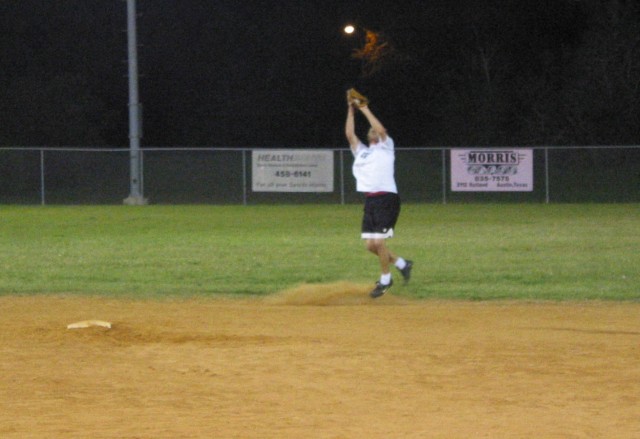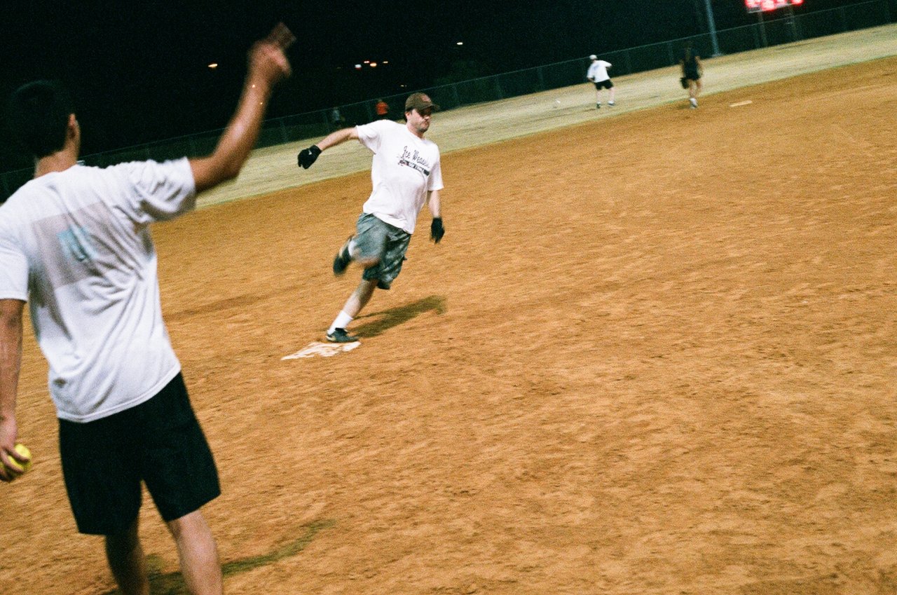 Aimee catches the ball at first base. Hawi (pitcher) and Matt (3b) can be seen in the background |