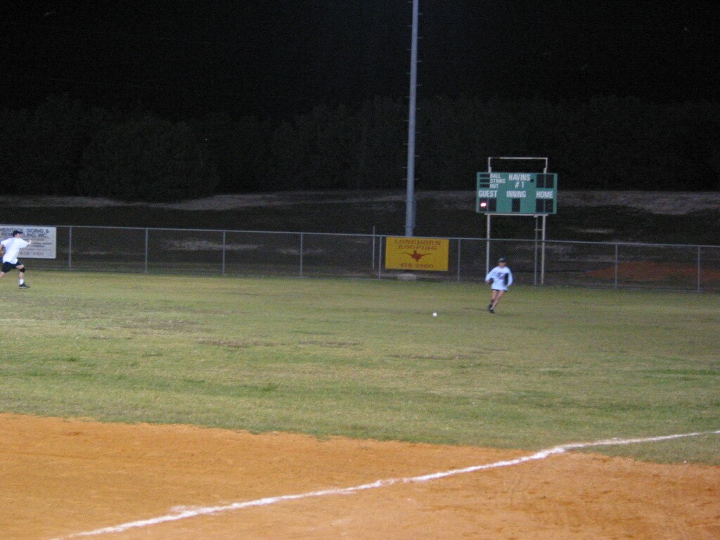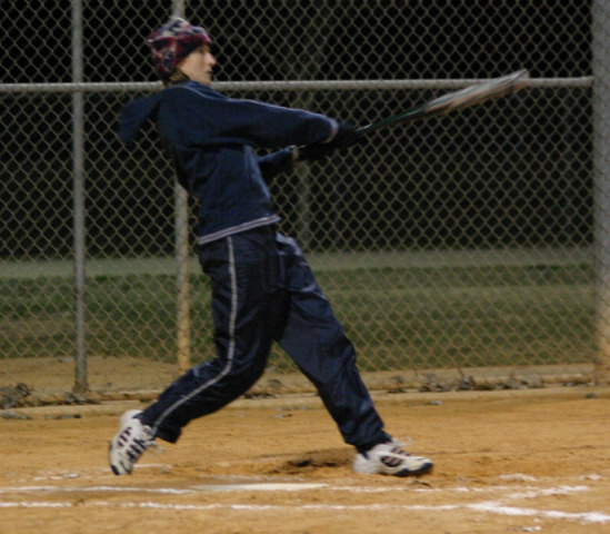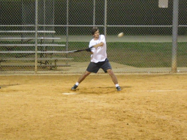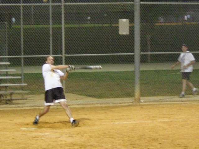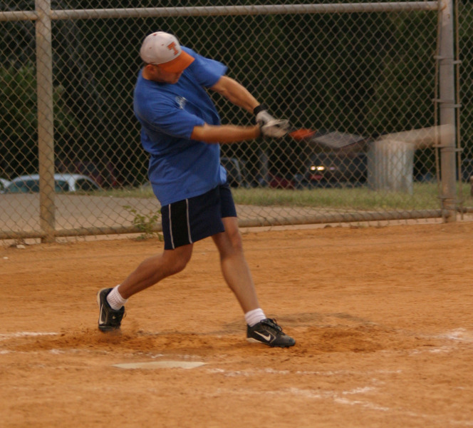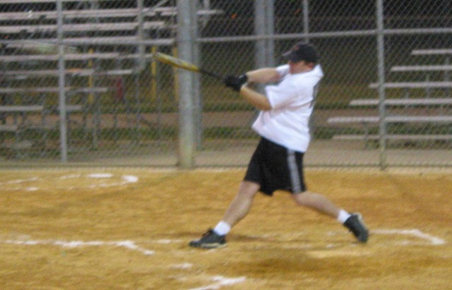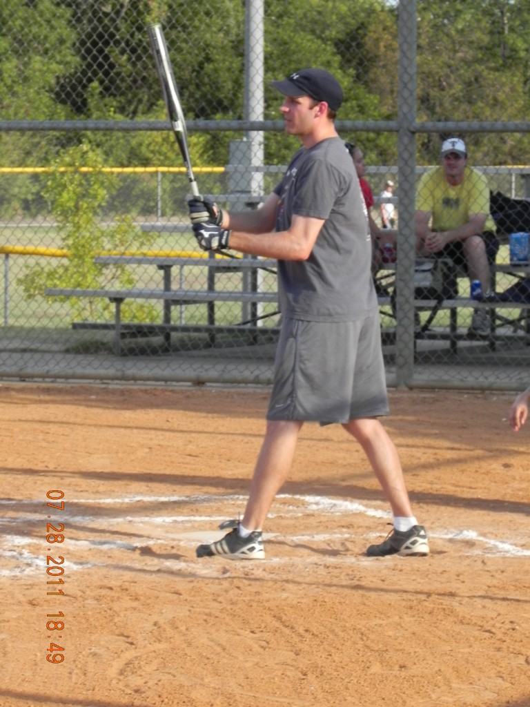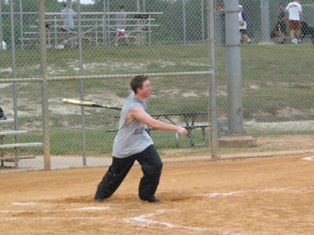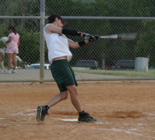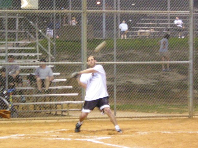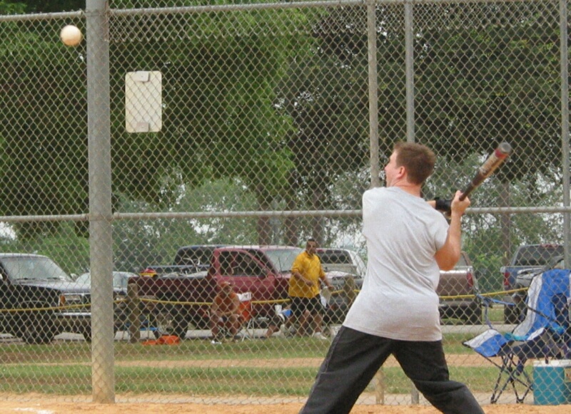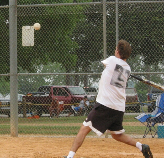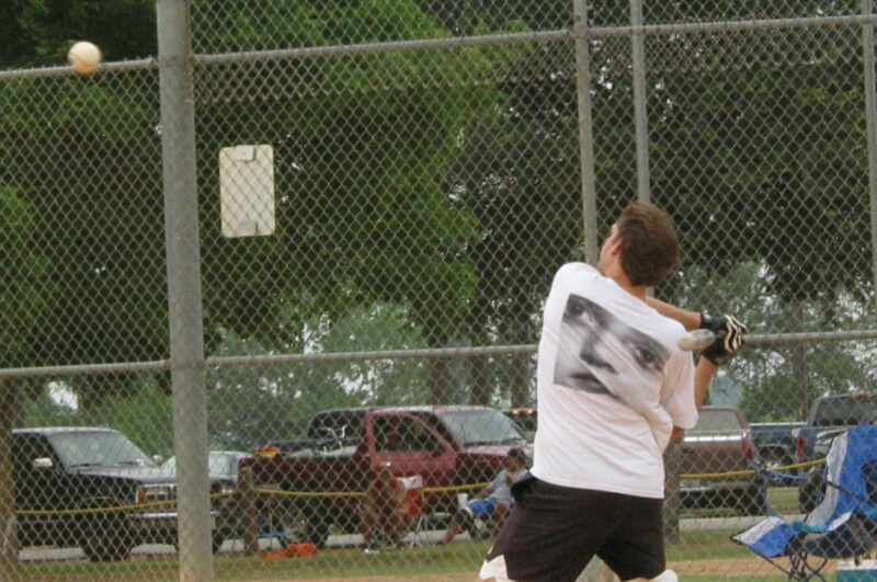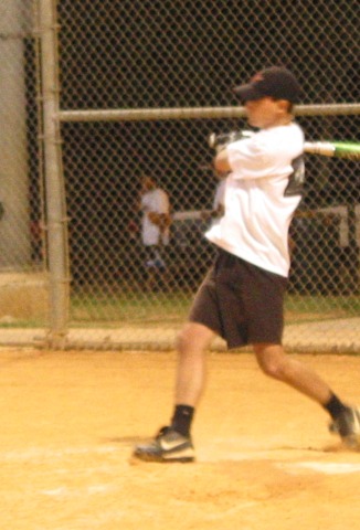 Chris E launches his 2-run triple in the top of the 4th inning. Tim R is visible on second base. |