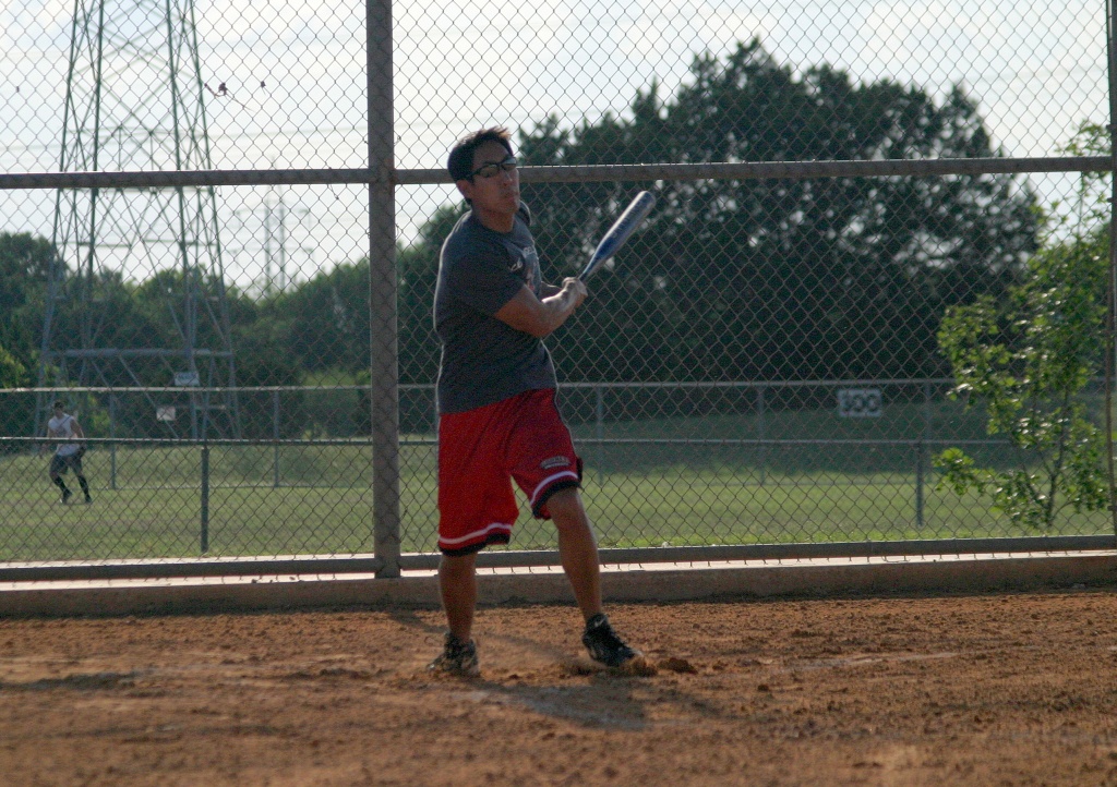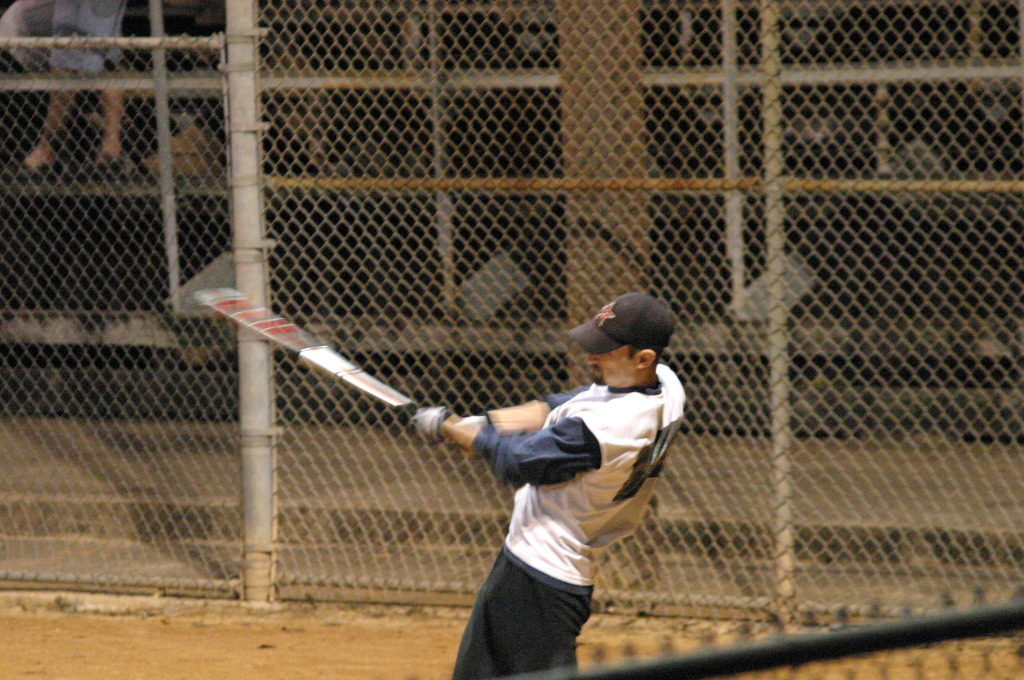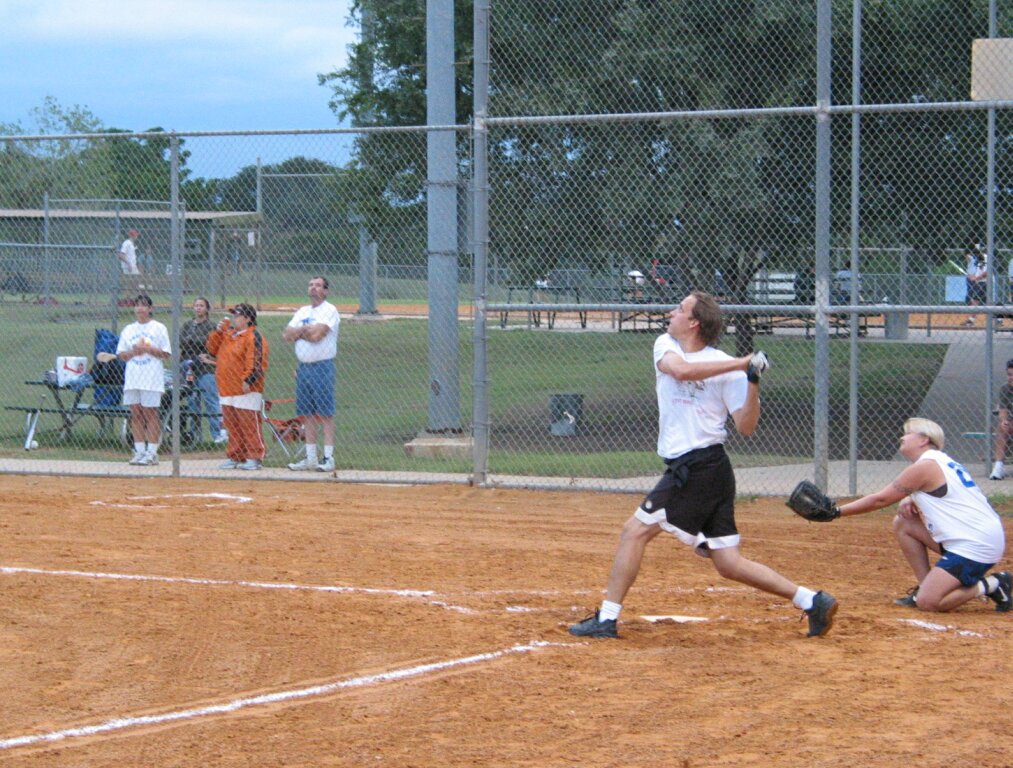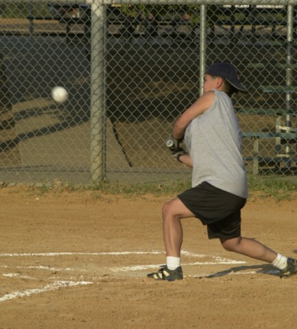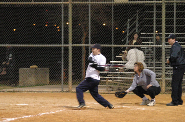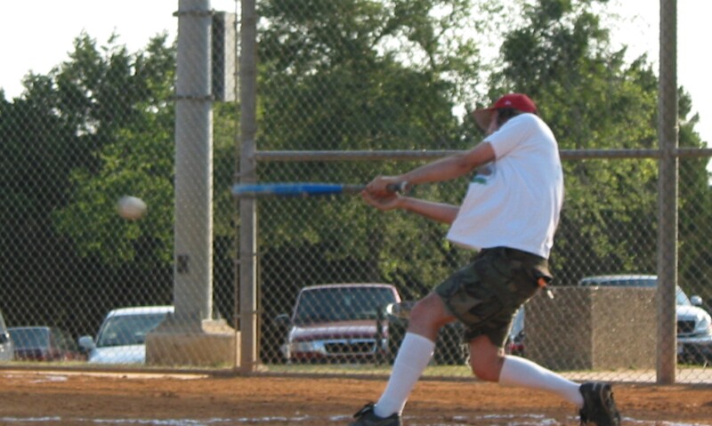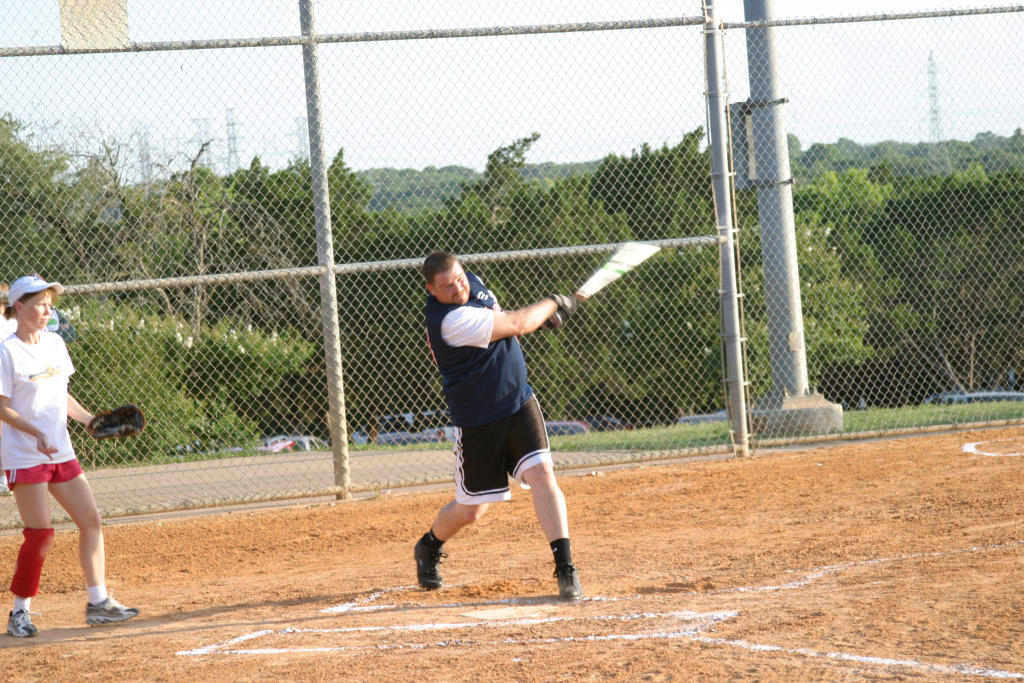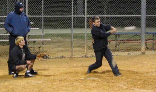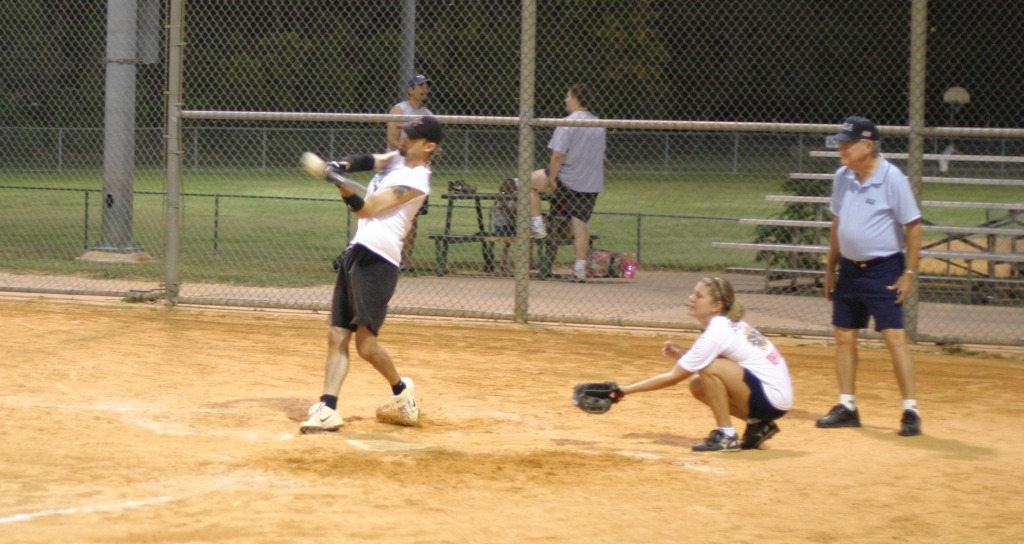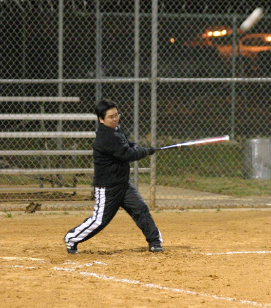 Chris E launches his 2-run triple in the top of the 4th inning. Tim R is visible on second base. |
