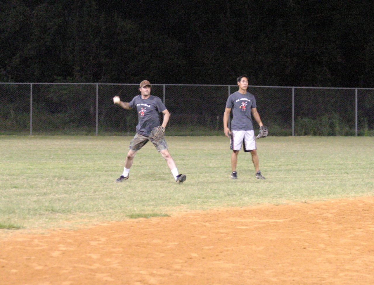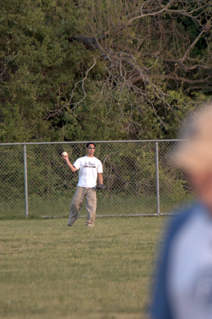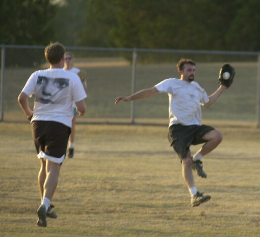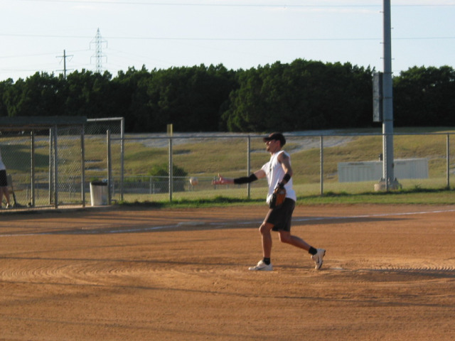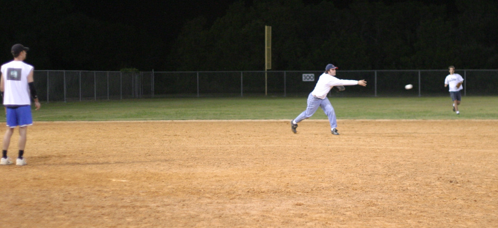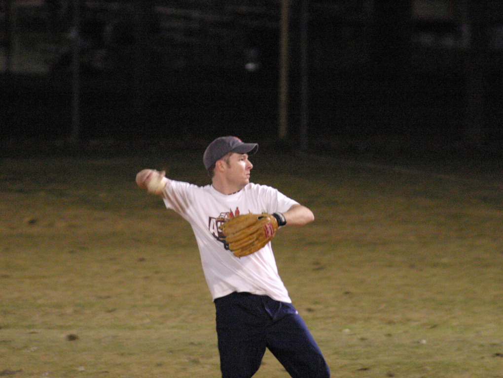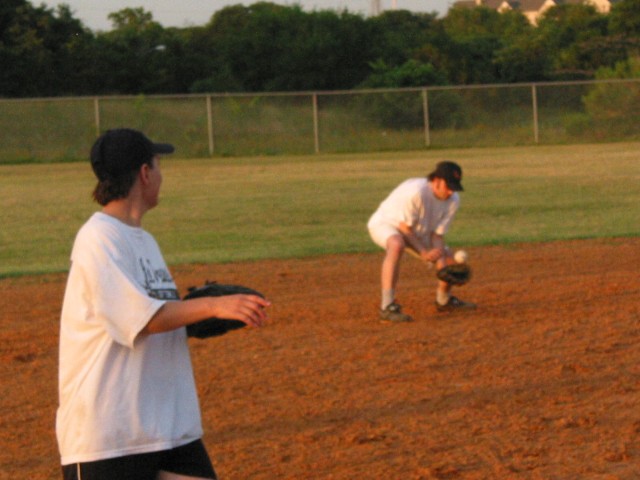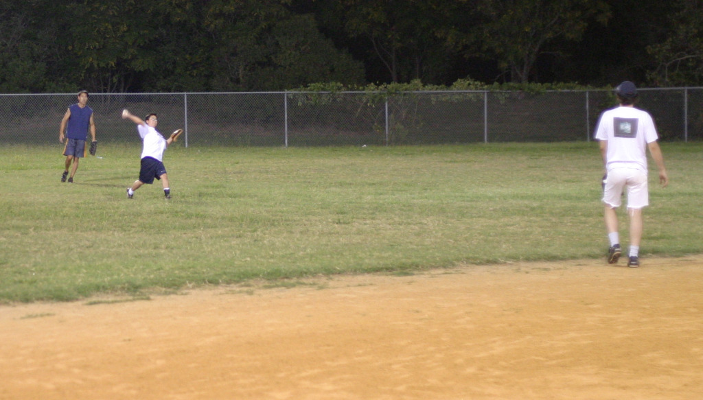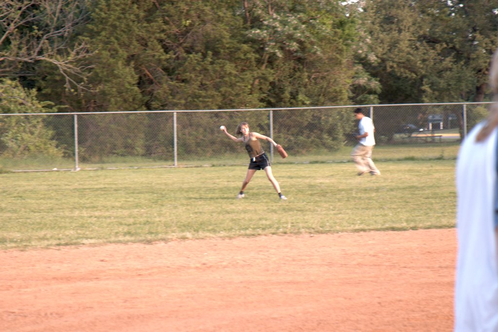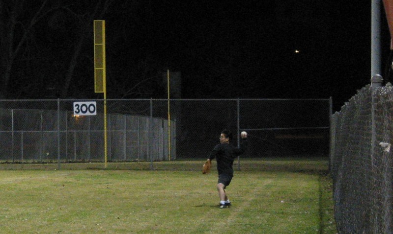 Neil unleashes a strange-looking throw. Patrick O is visible in the outfield. |