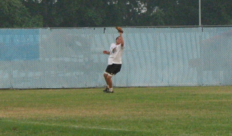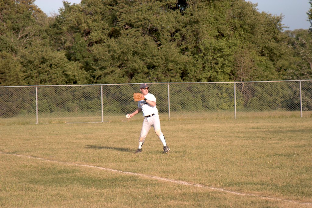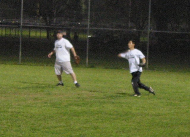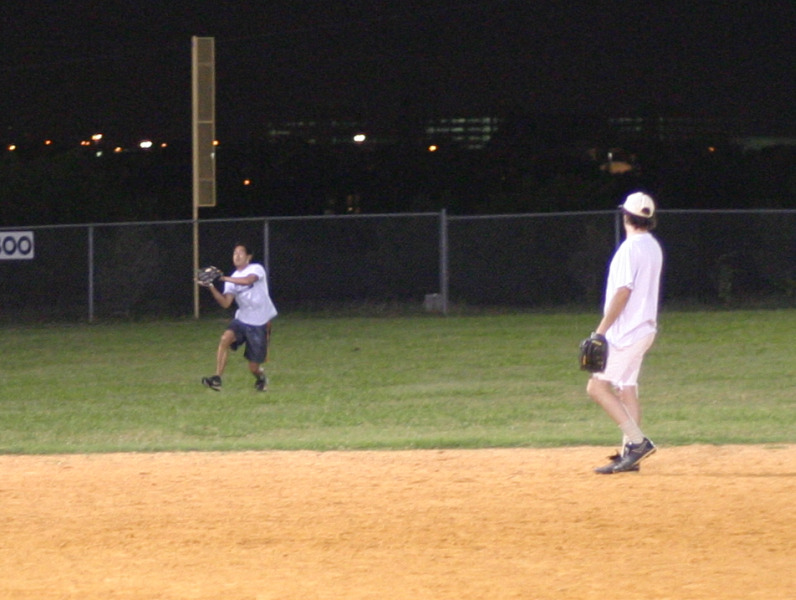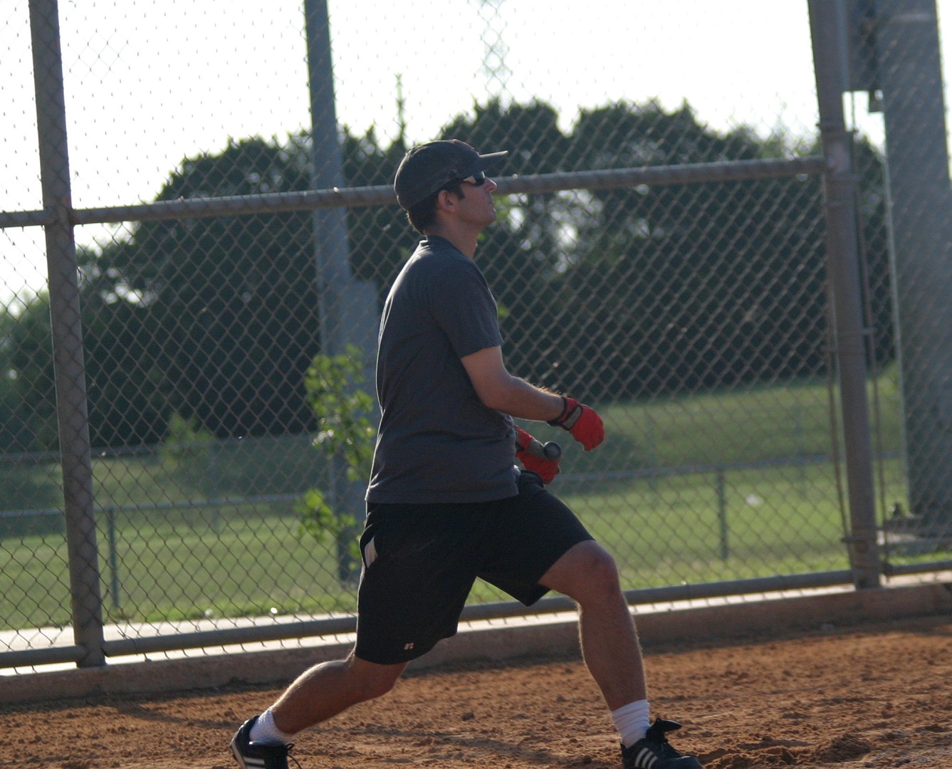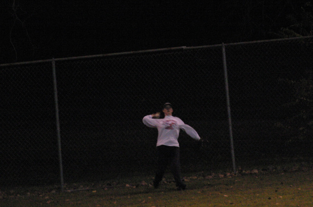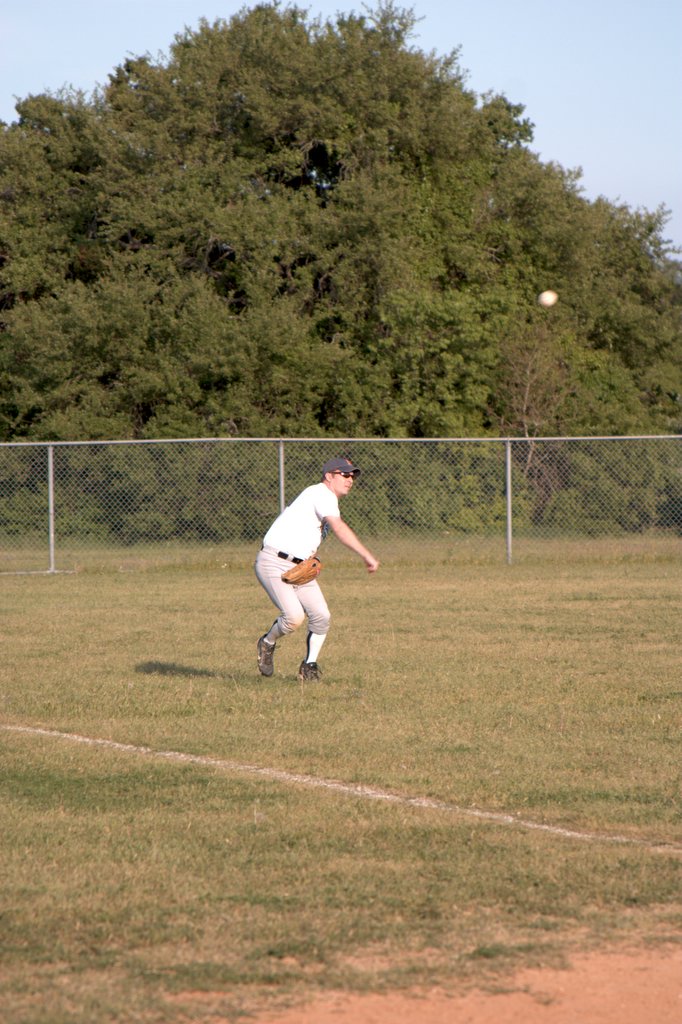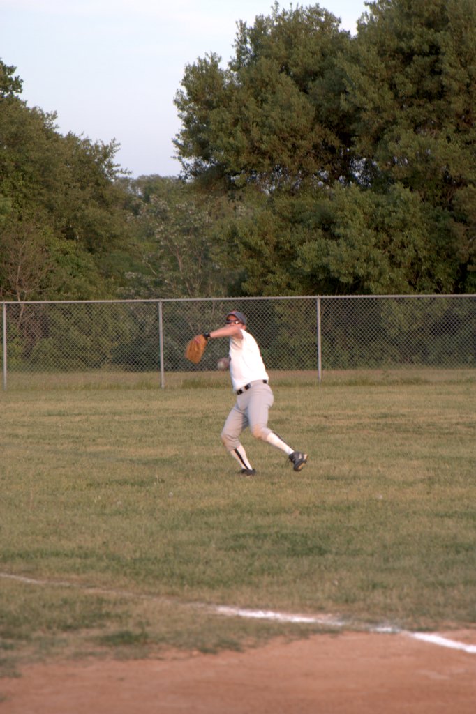 Neil unleashes a strange-looking throw. Patrick O is visible in the outfield. |