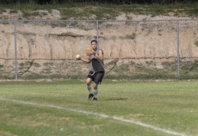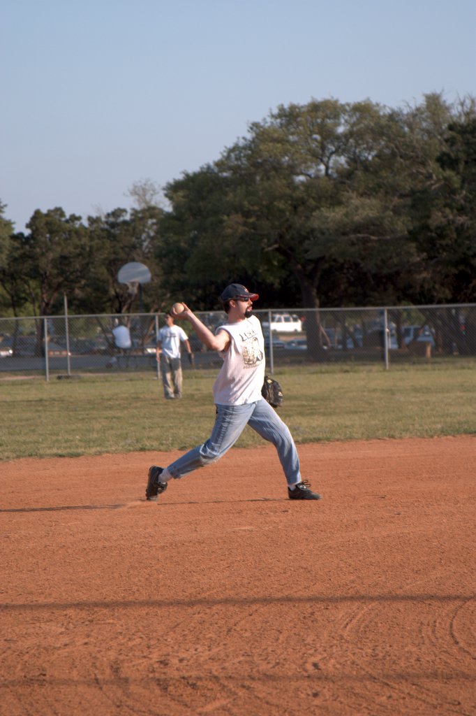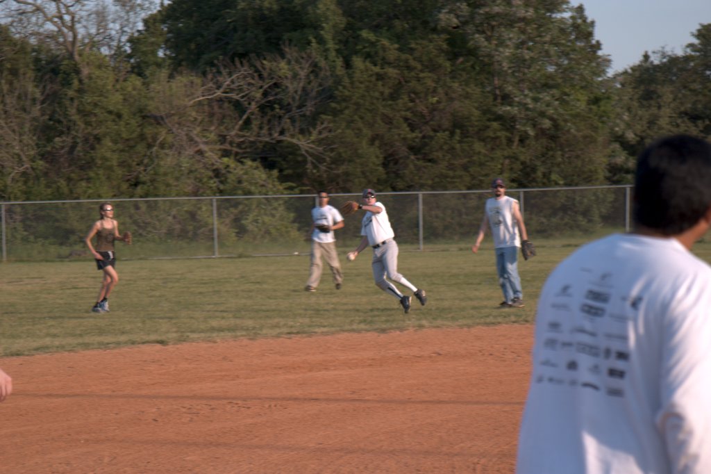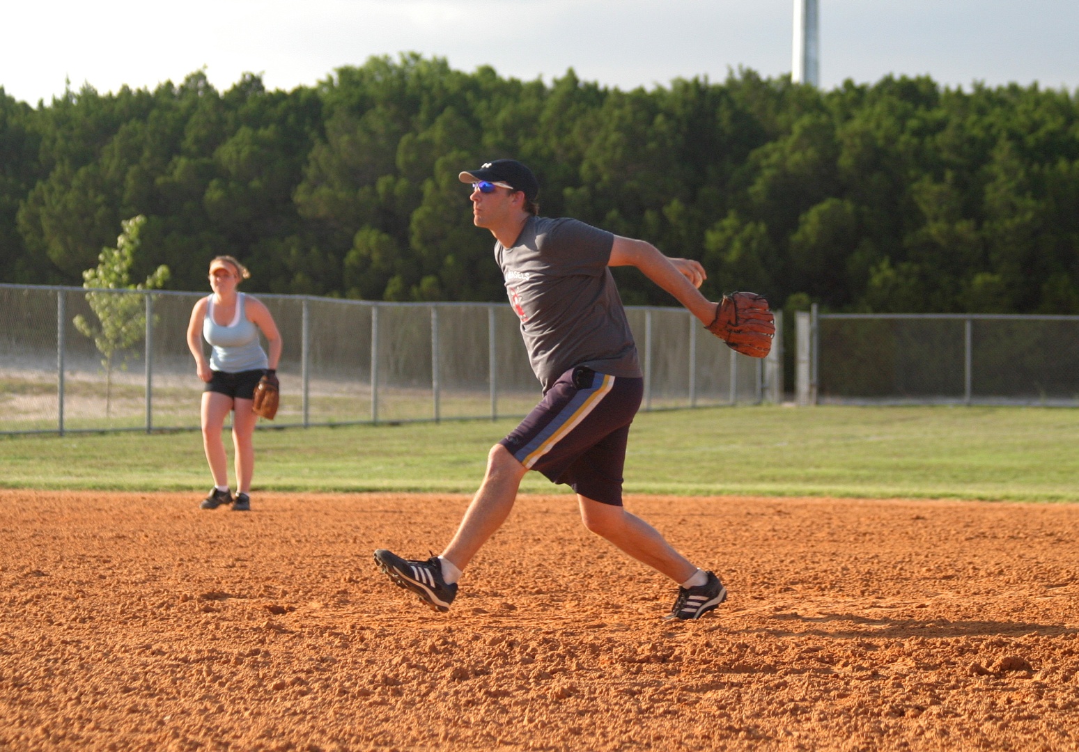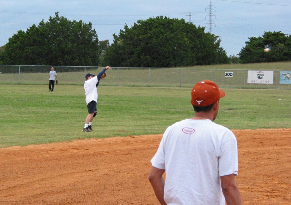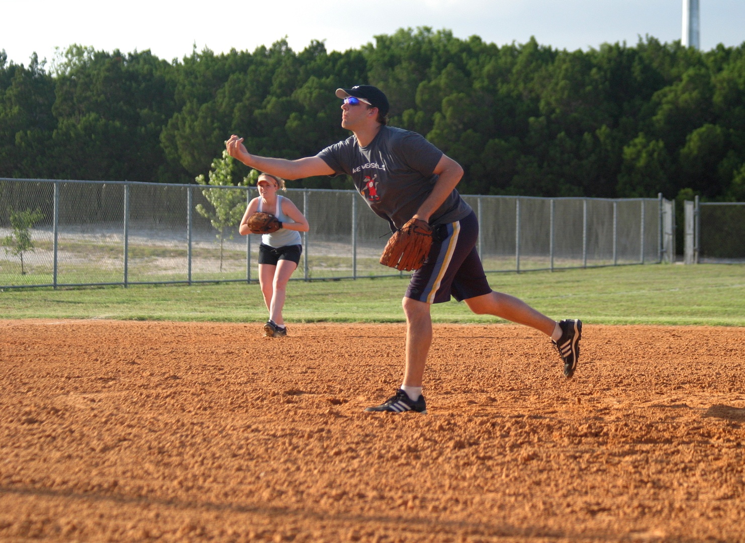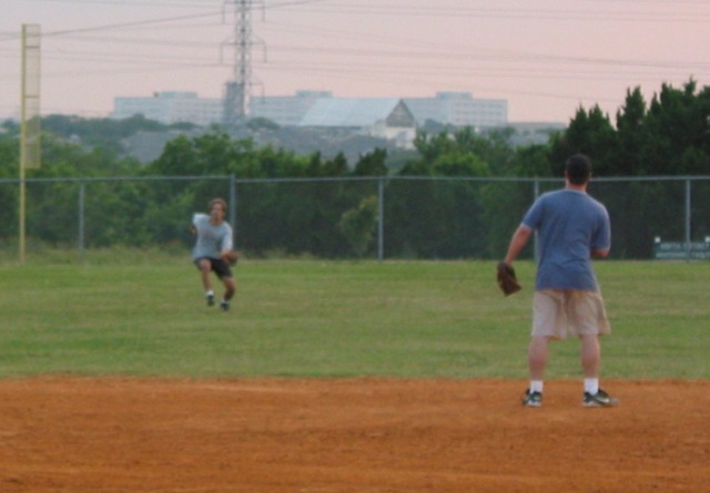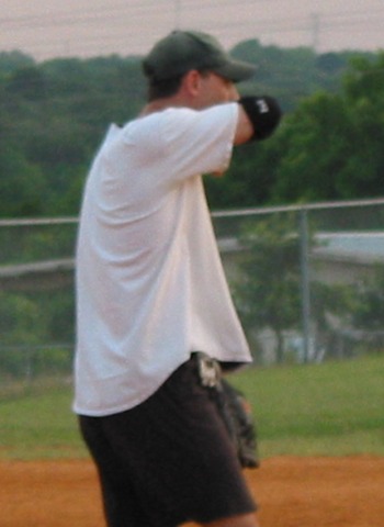 Neil unleashes a strange-looking throw. Patrick O is visible in the outfield. |