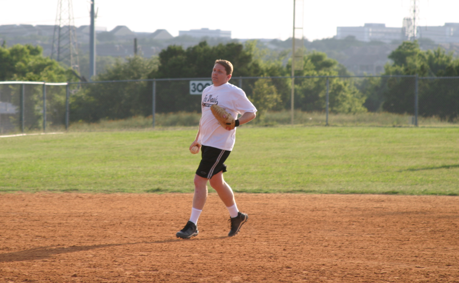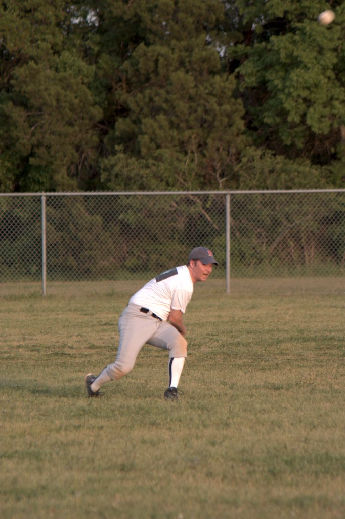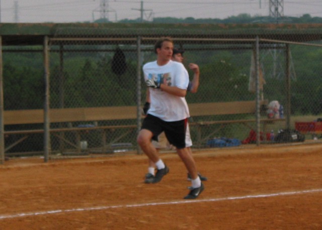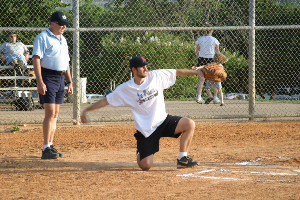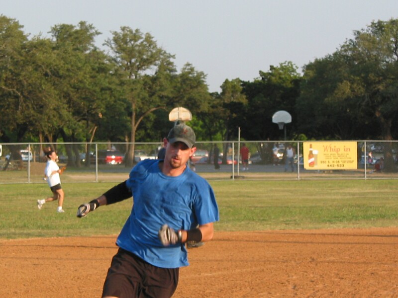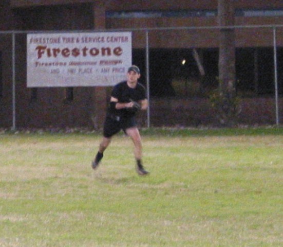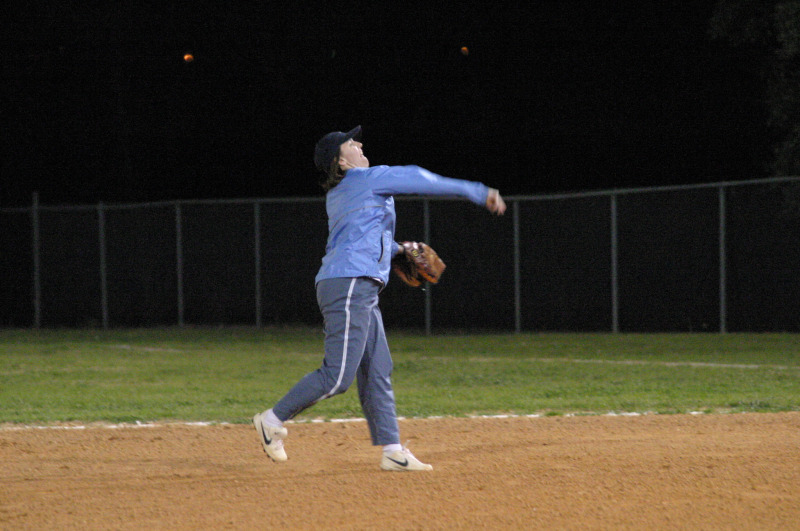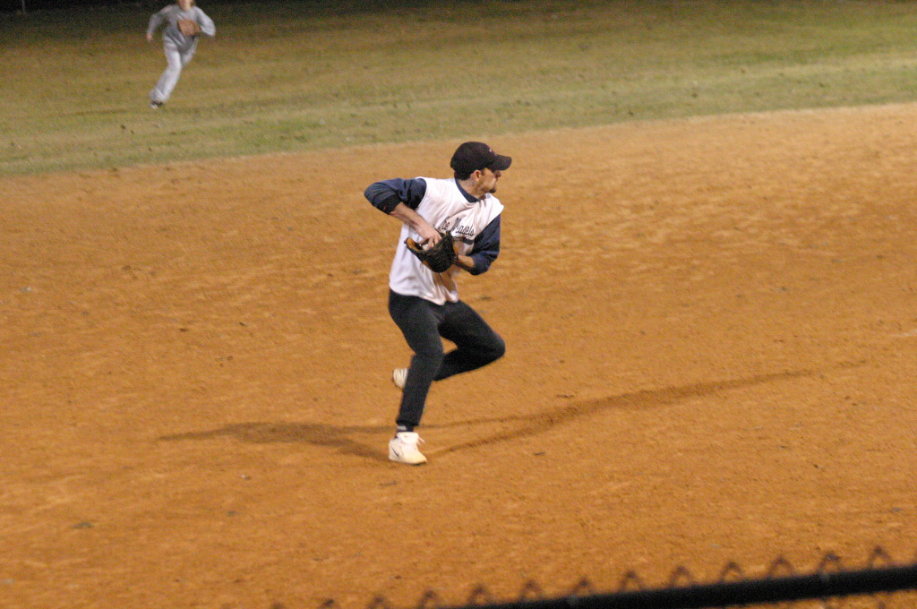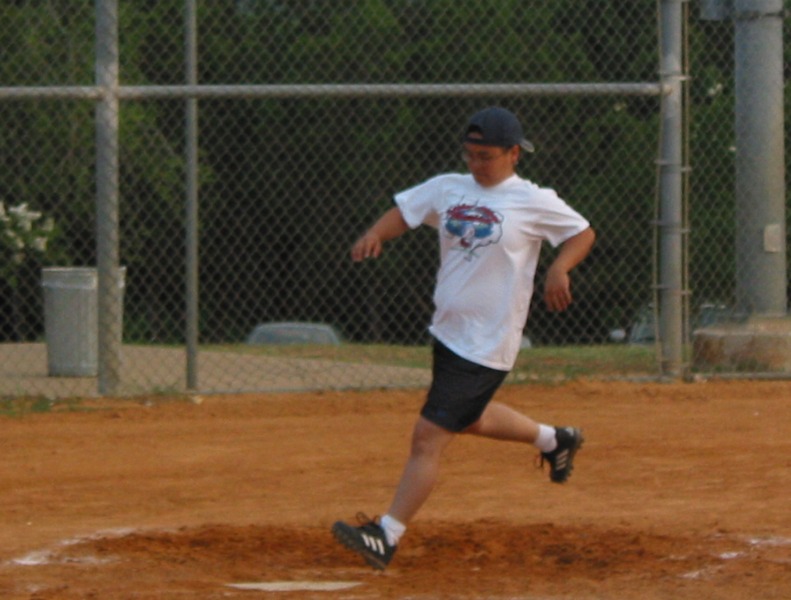 Neil unleashes a strange-looking throw. Patrick O is visible in the outfield. |