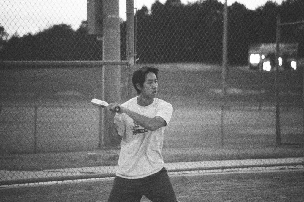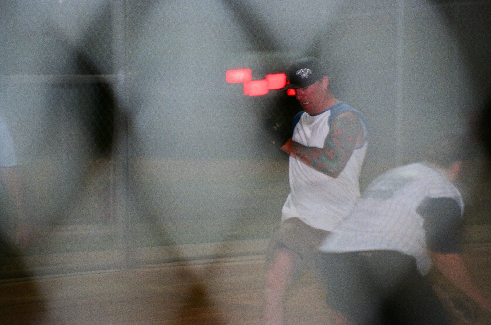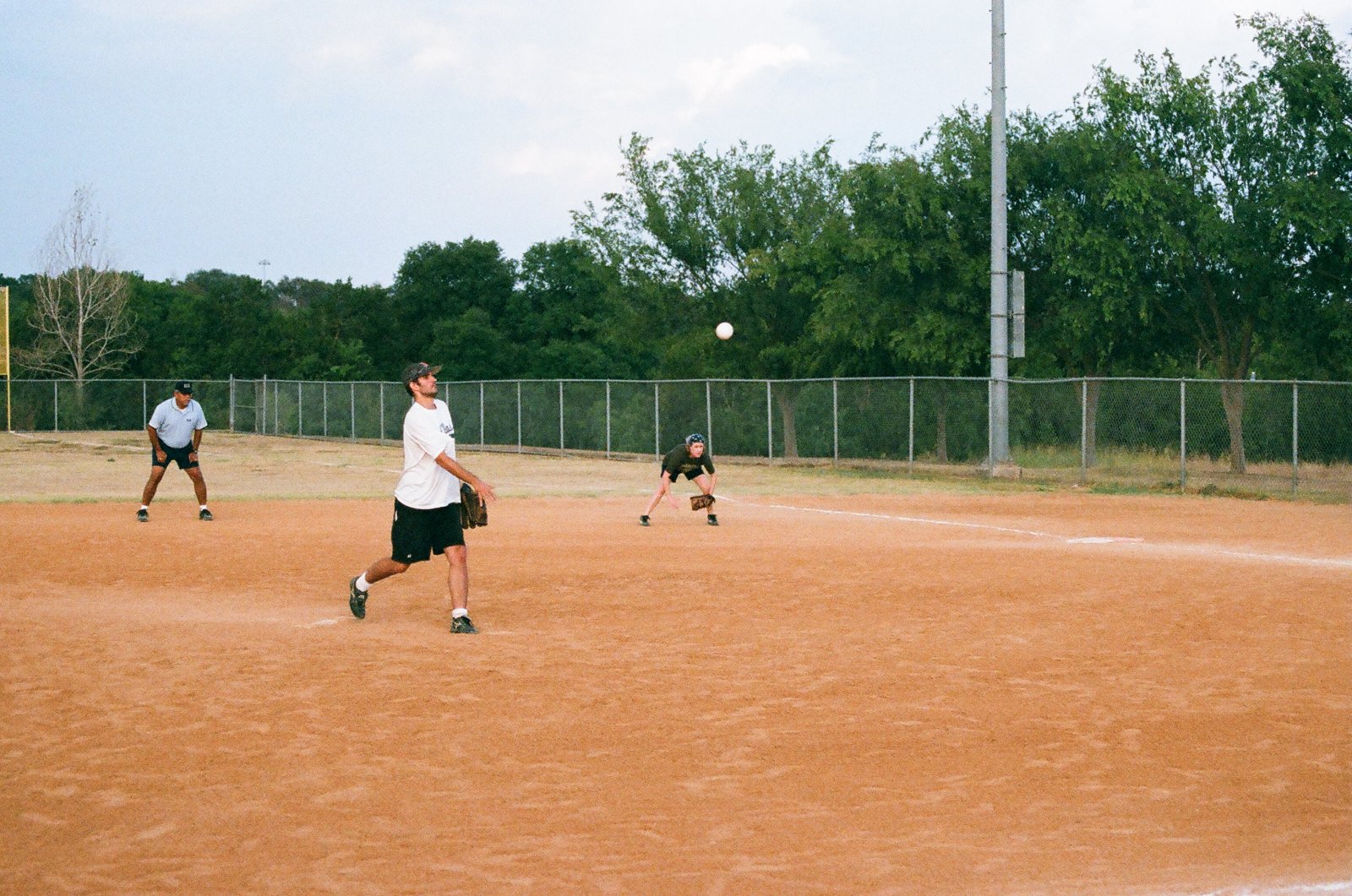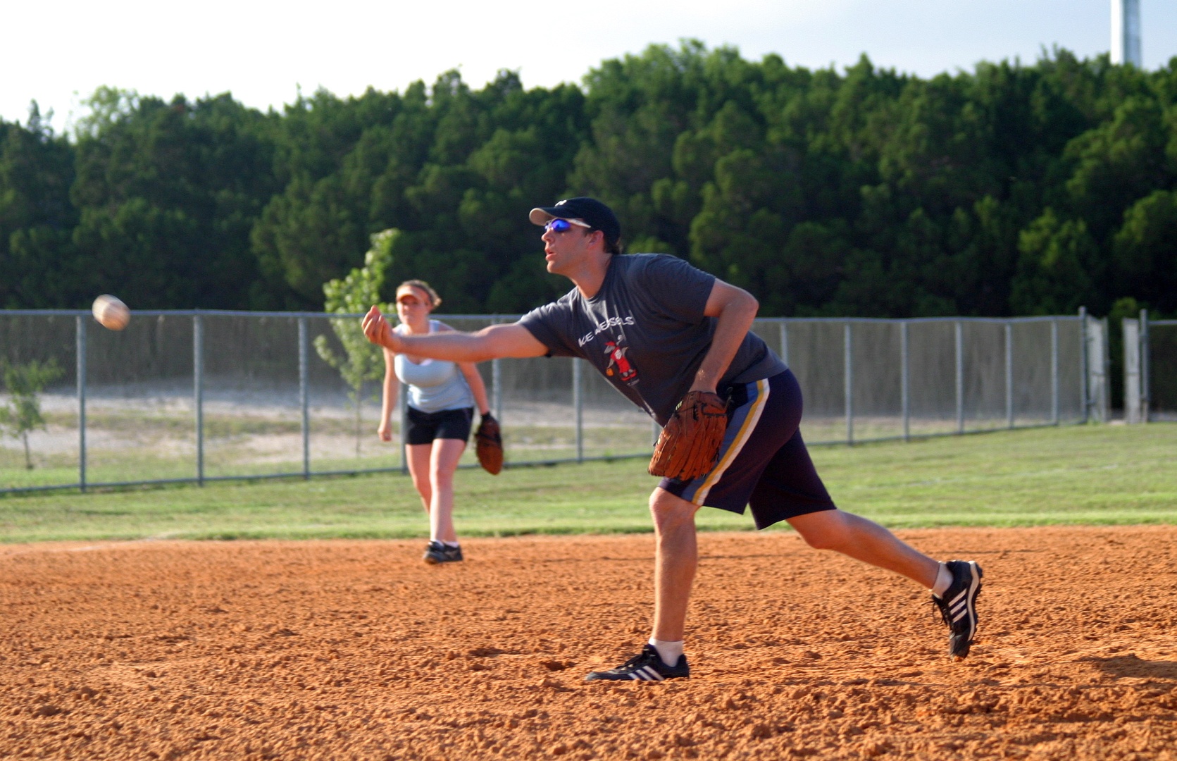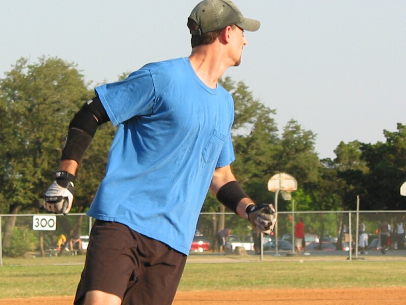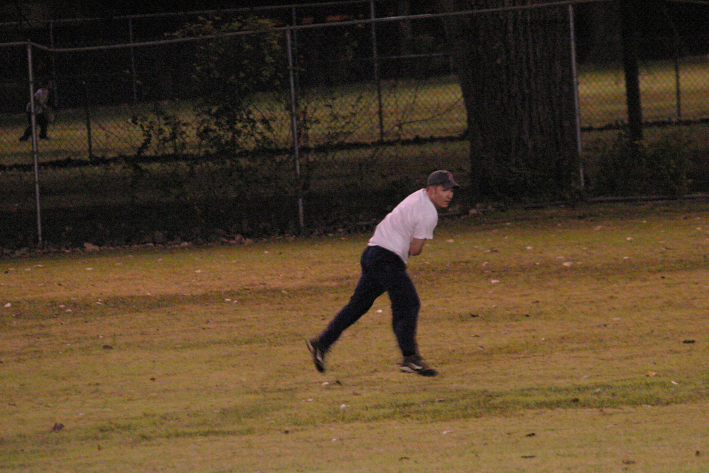 Neil unleashes a strange-looking throw. Patrick O is visible in the outfield. |