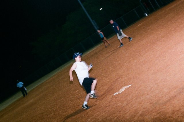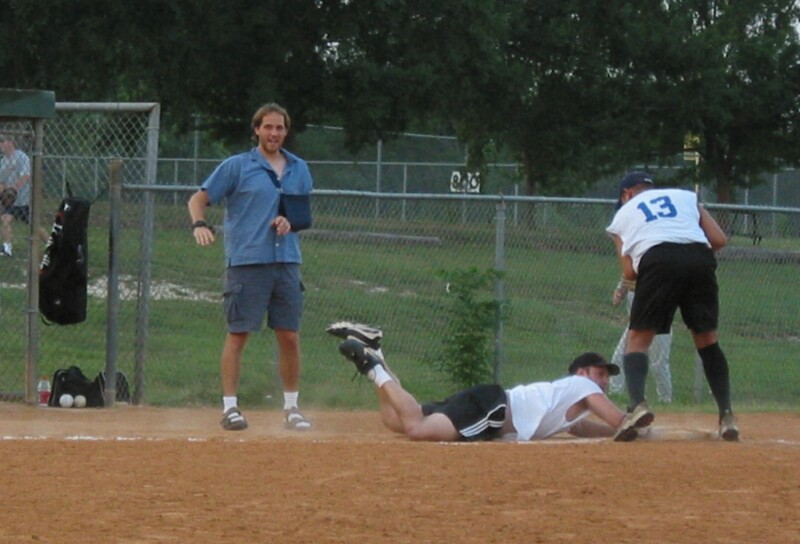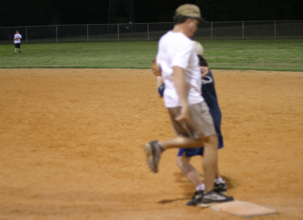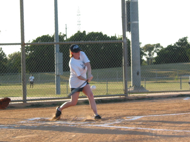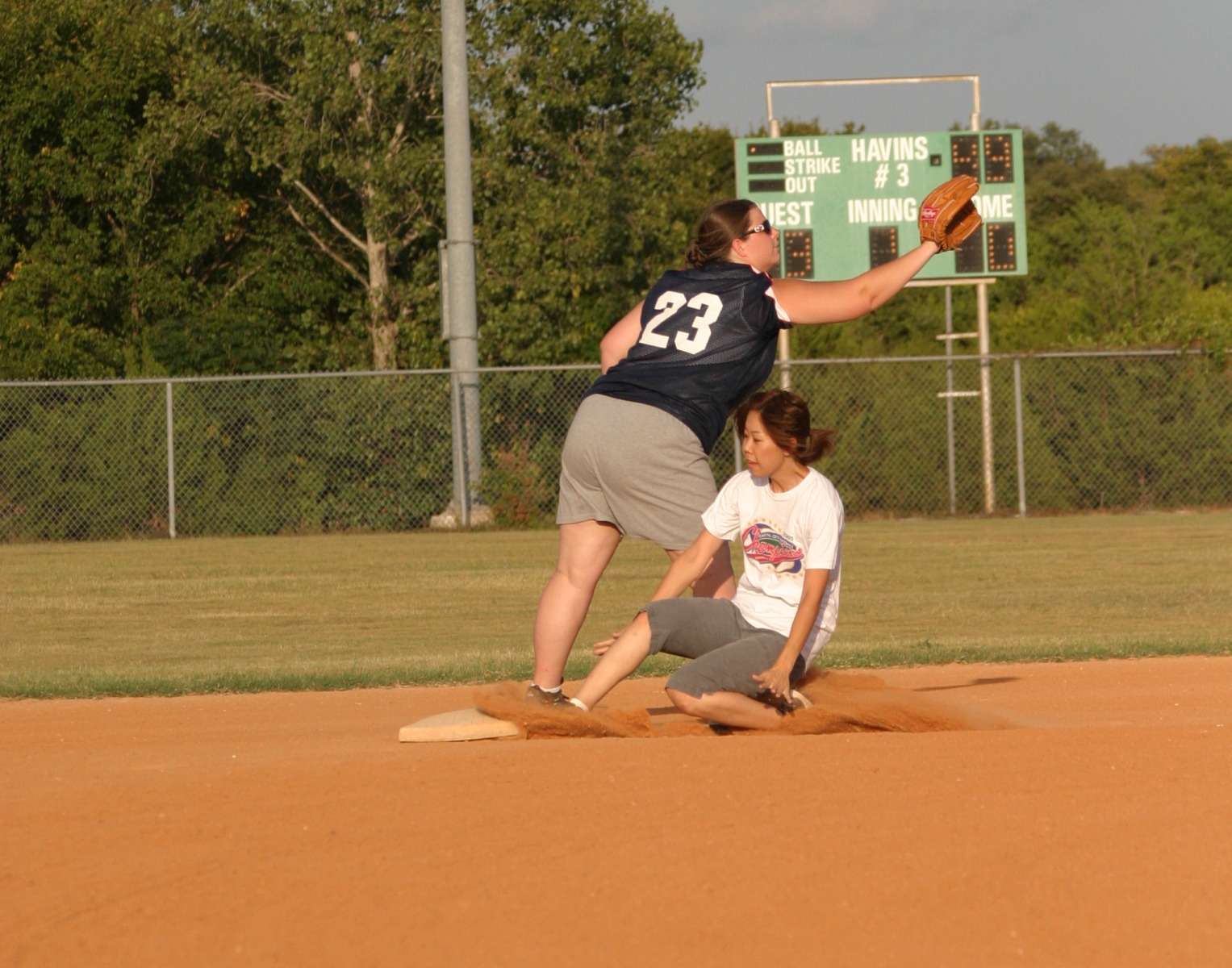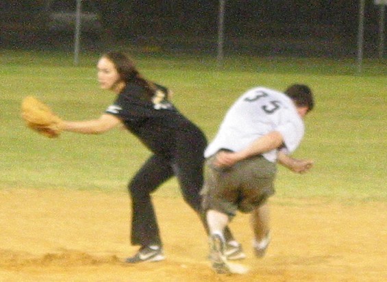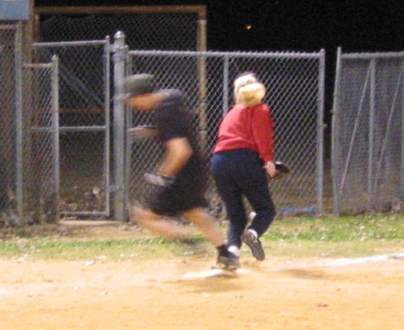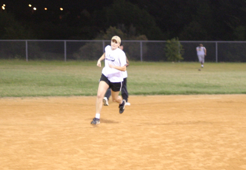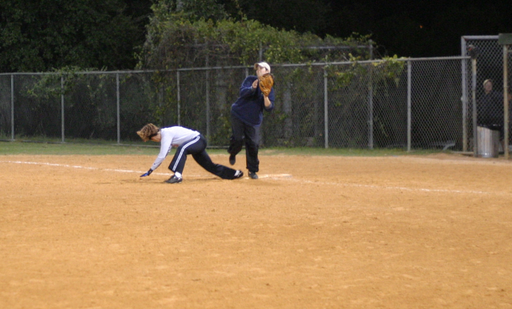 Aimee appears to be reaching first base in this photo. This photo, as well as all other photos of this game, were taken by Eric, Laurie S's fiance. We all love him for it. |