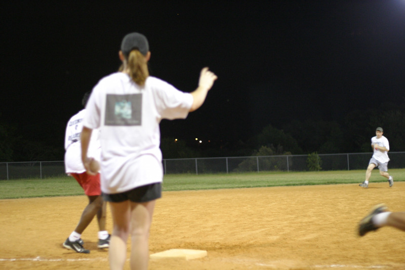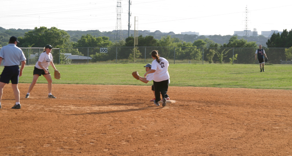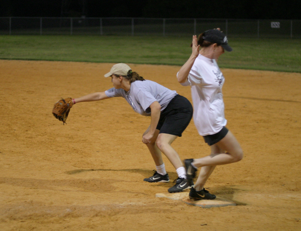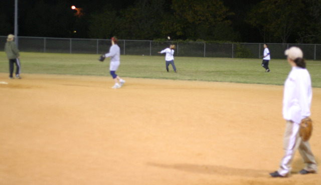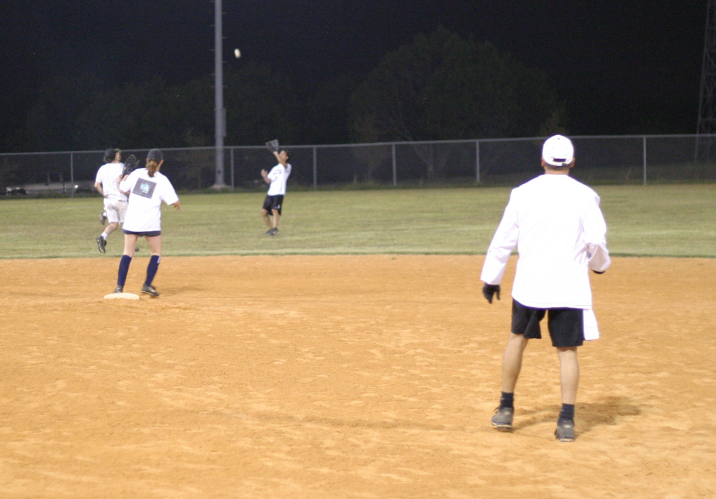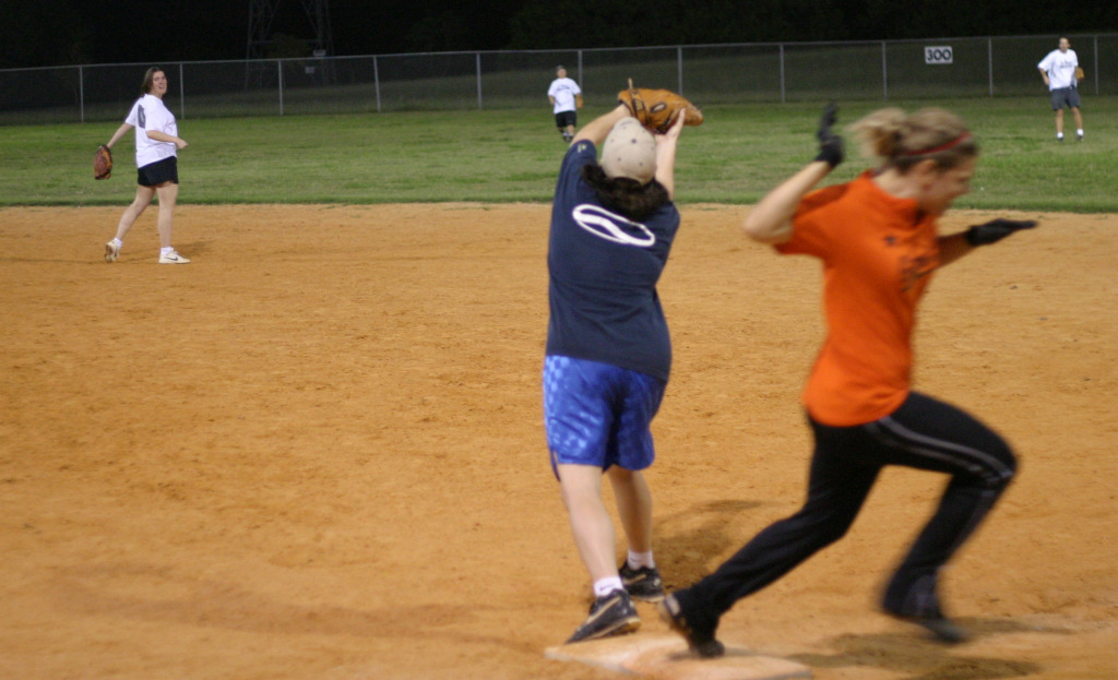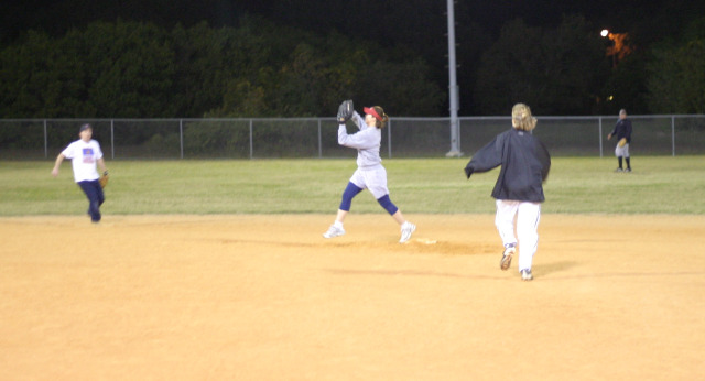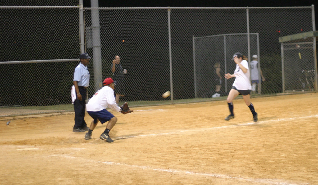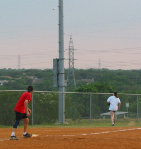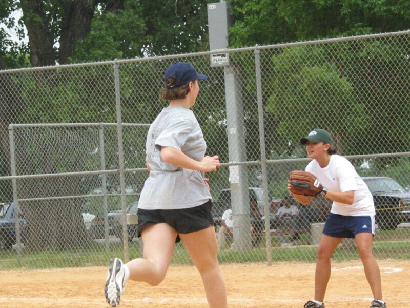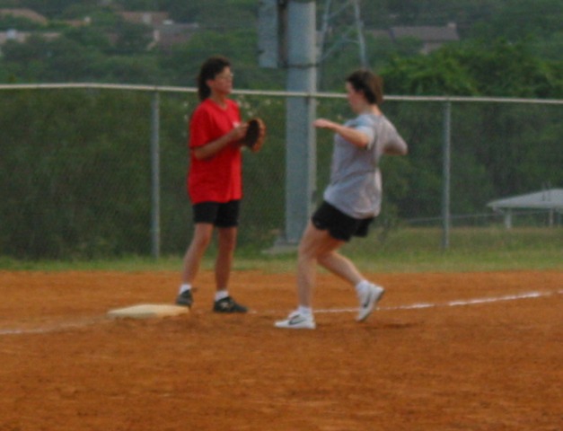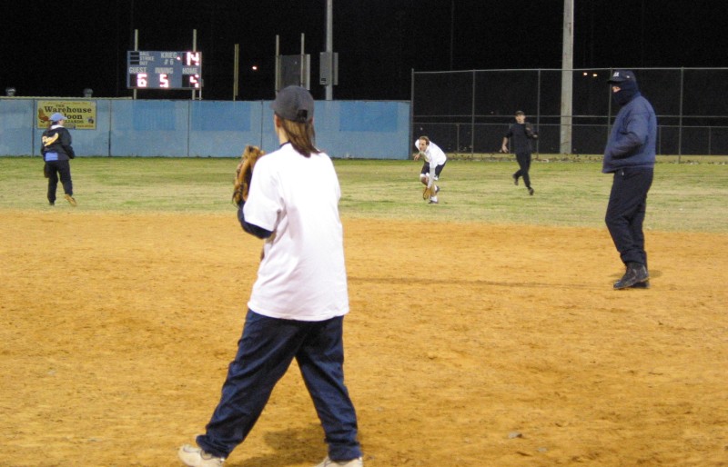 Neil has thrown the ball to Michelle F at first base as the runner nears the bag (she was out to end the bottom of the 1st inning). |