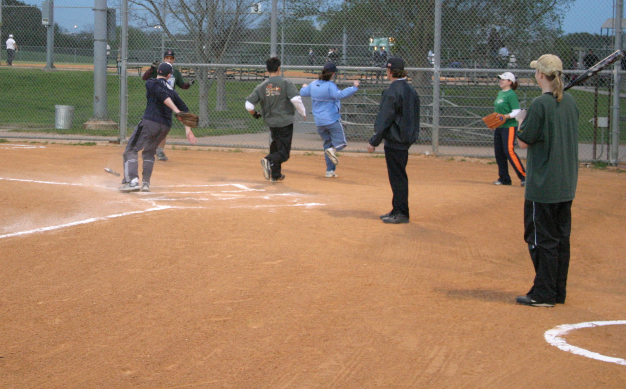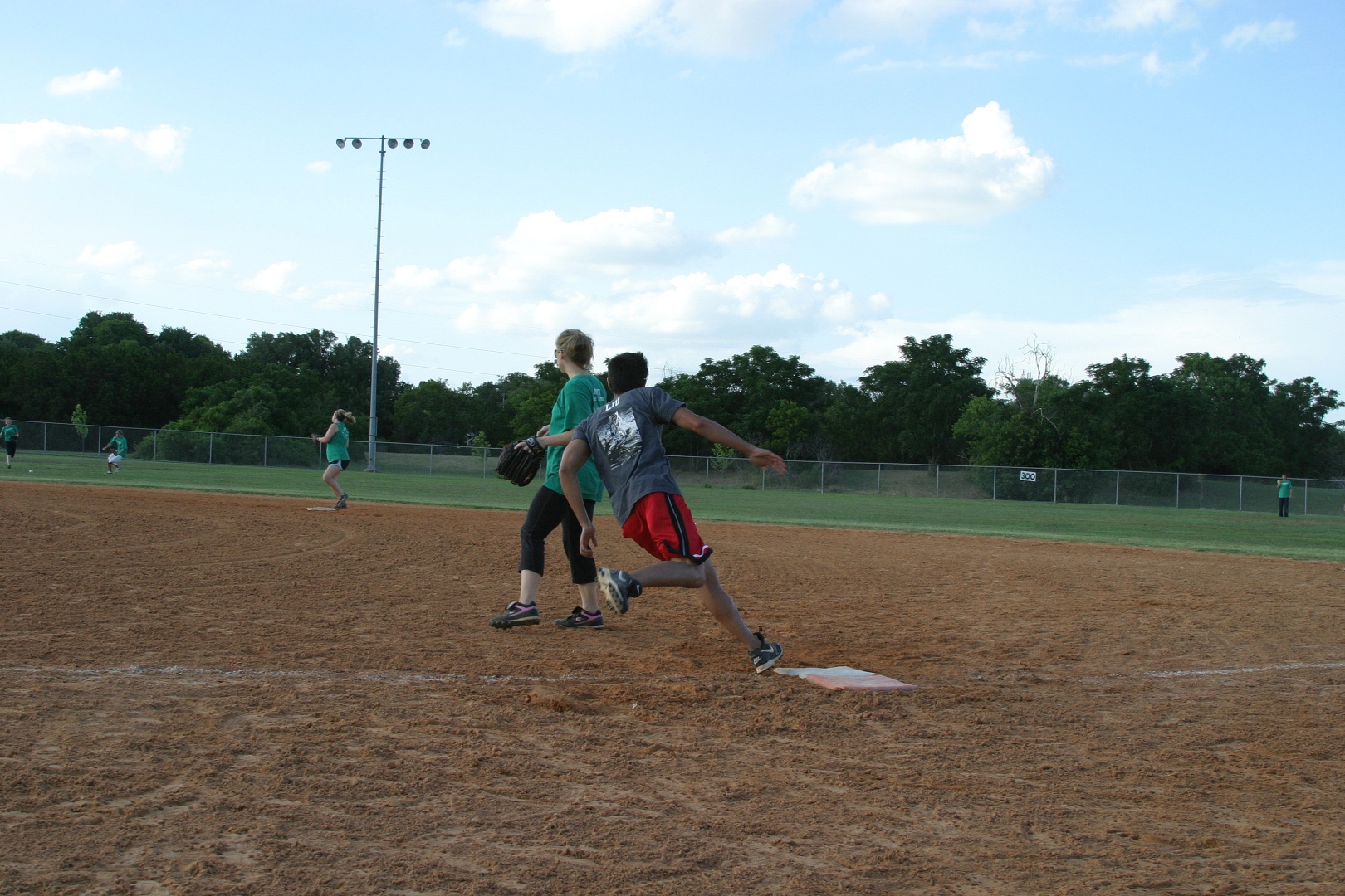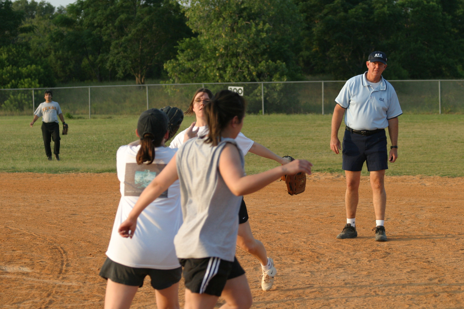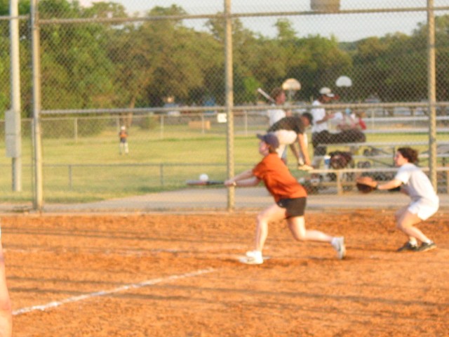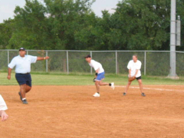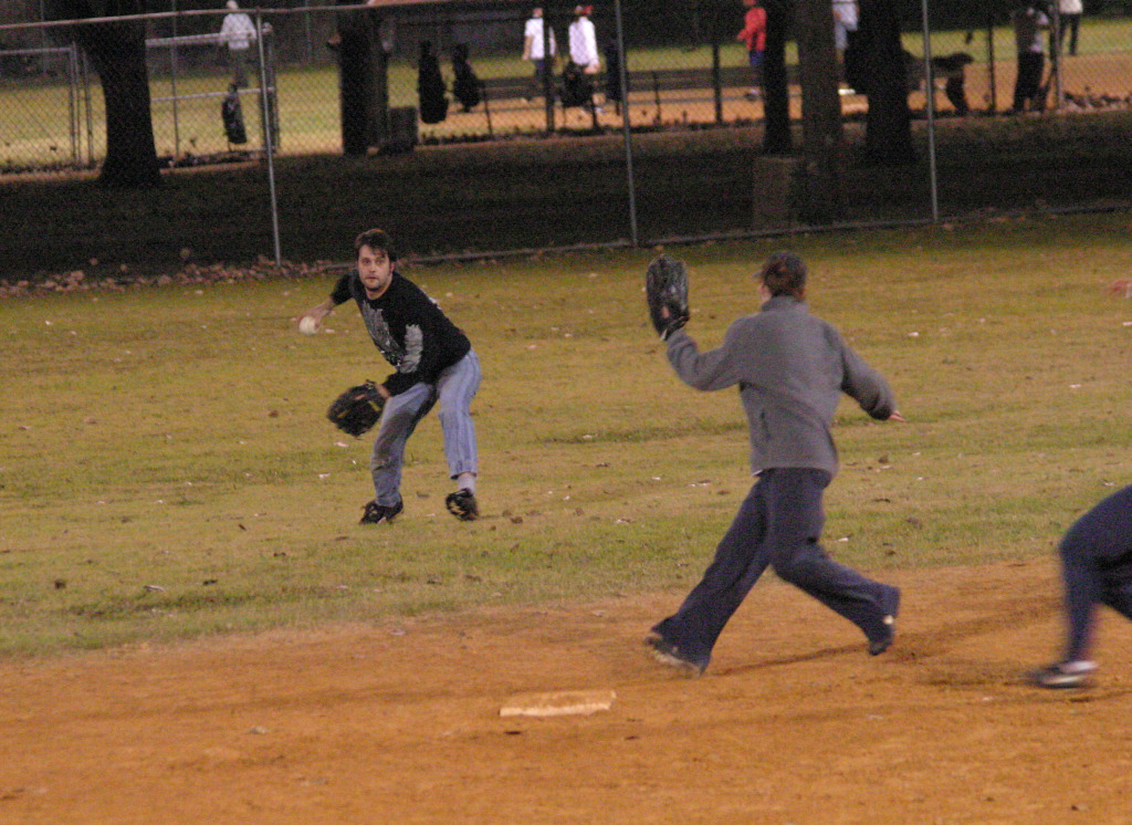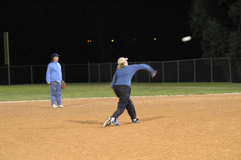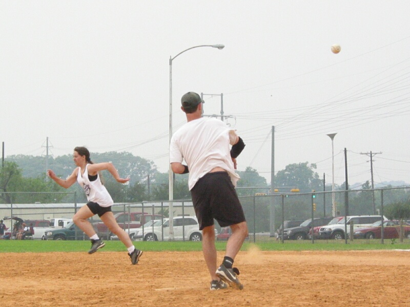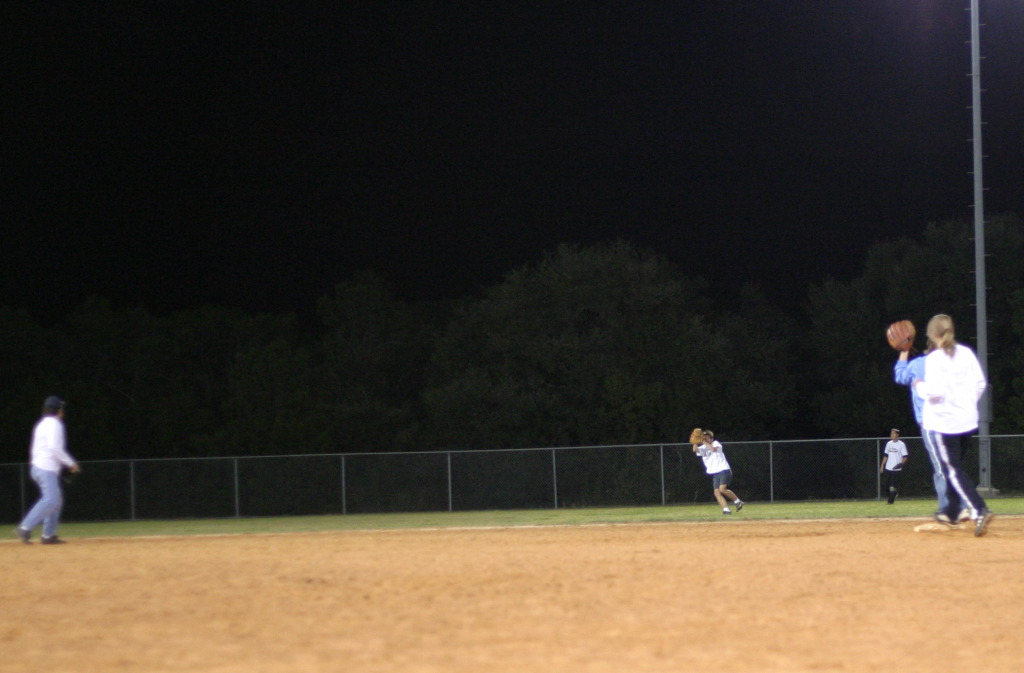 Neil has thrown the ball to Michelle F at first base as the runner nears the bag (she was out to end the bottom of the 1st inning). |