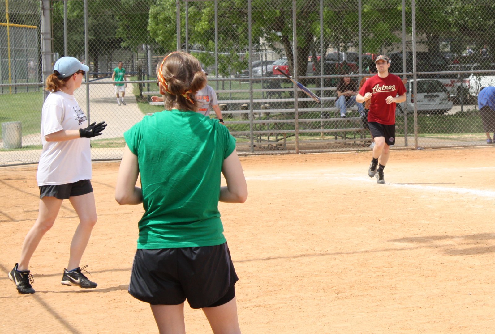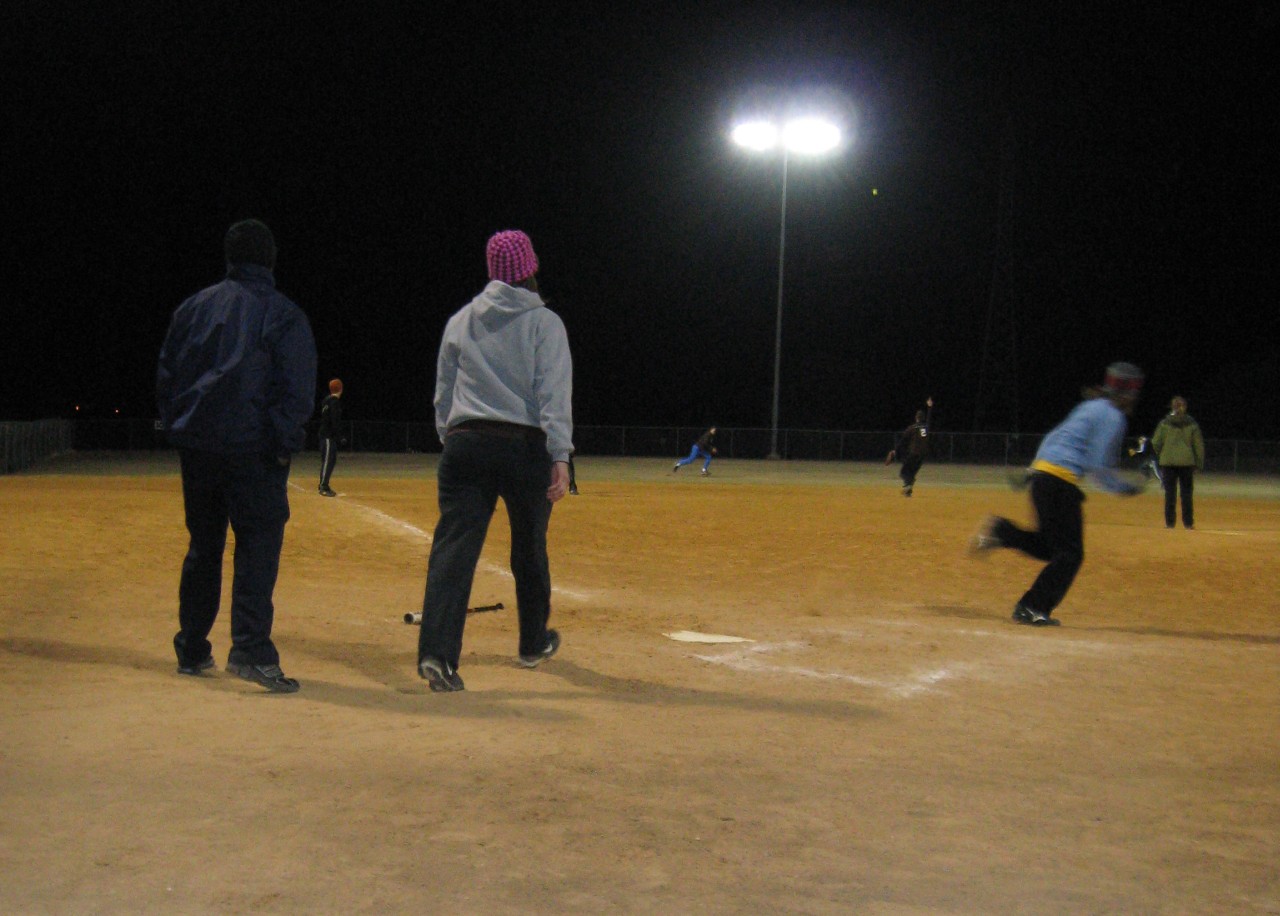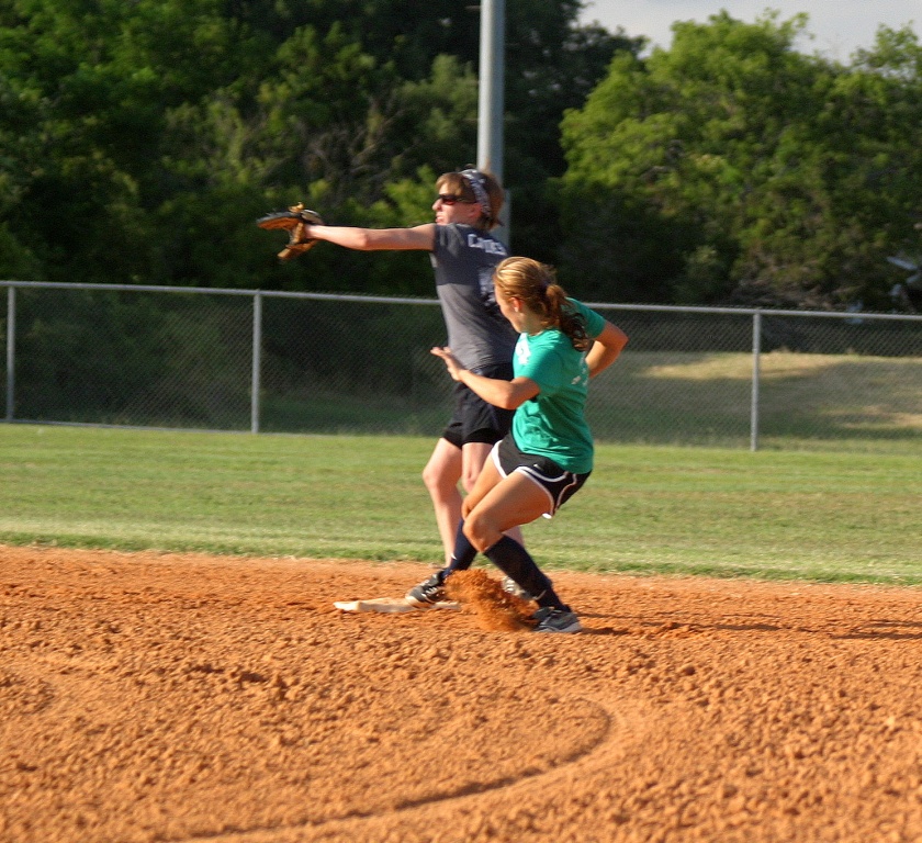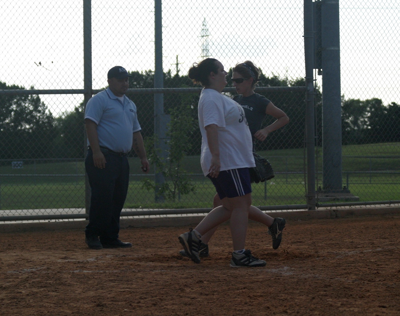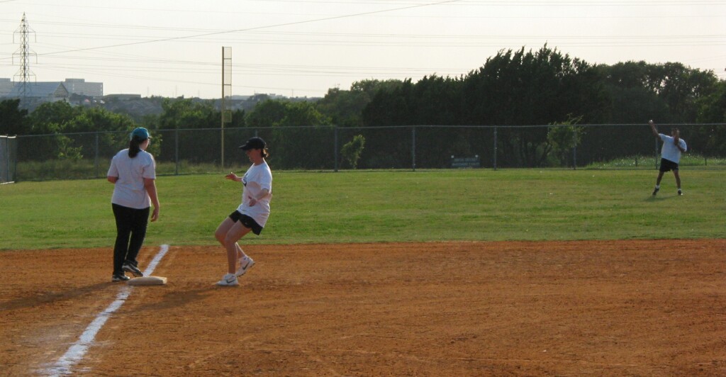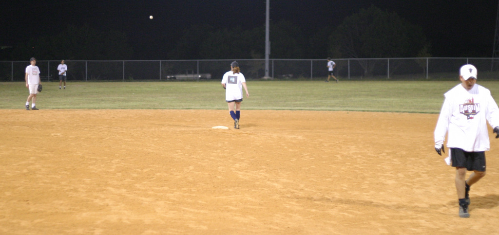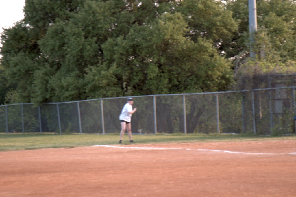 Neil has thrown the ball to Michelle F at first base as the runner nears the bag (she was out to end the bottom of the 1st inning). |