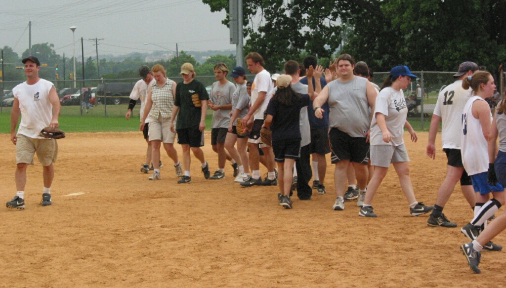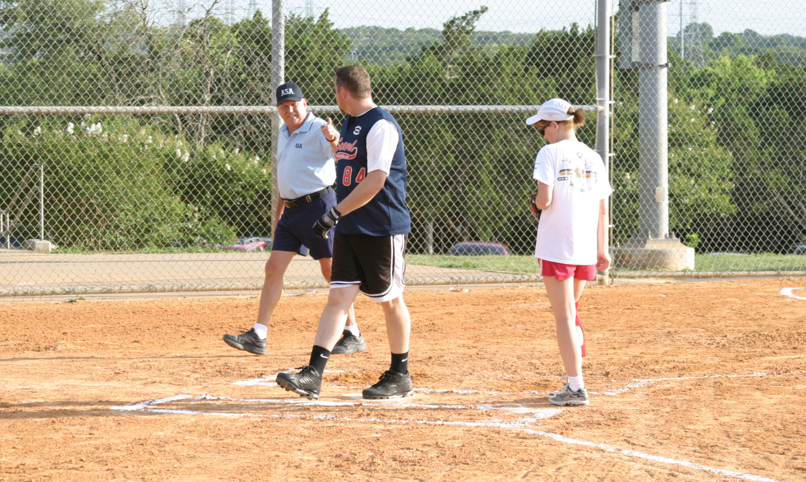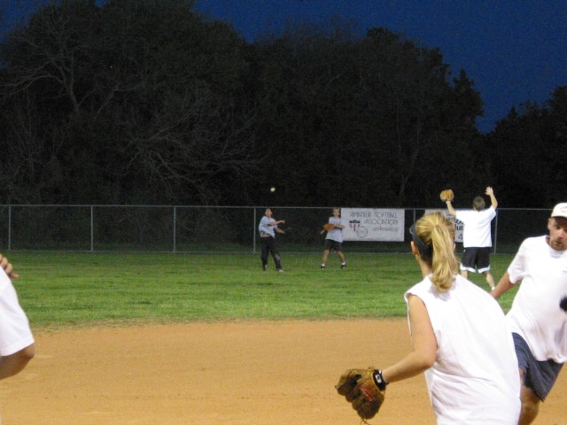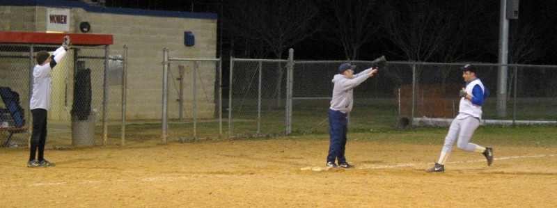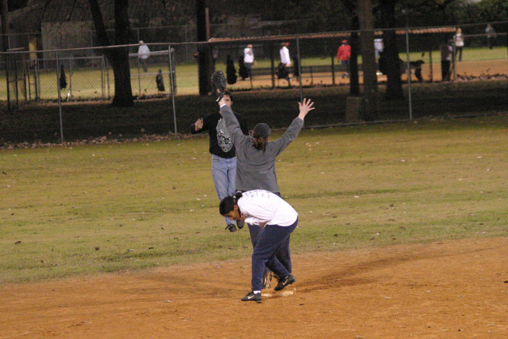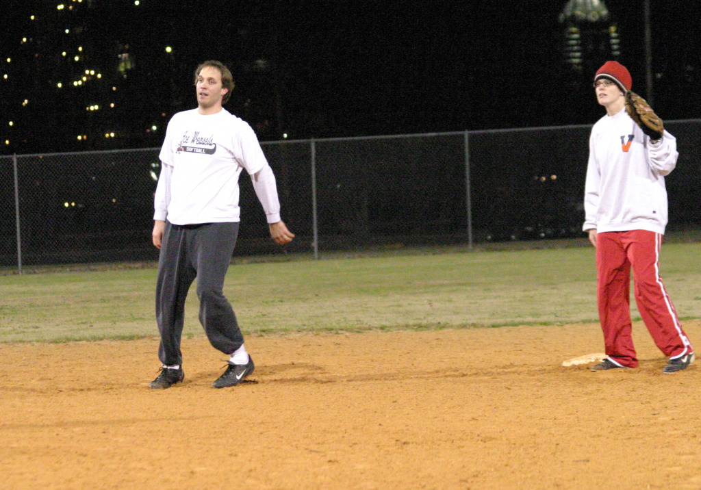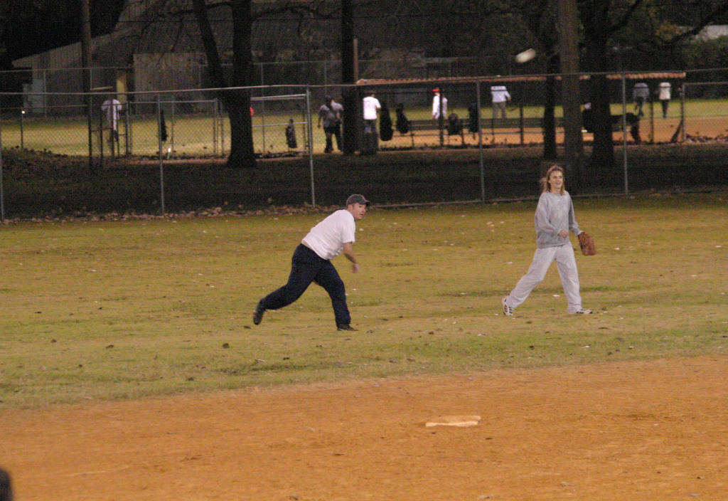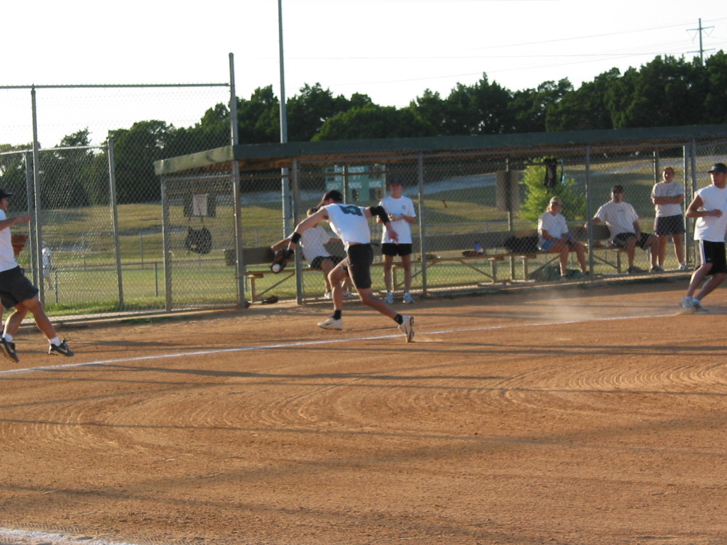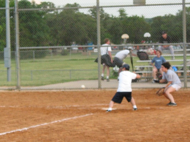 Neil has thrown the ball to Michelle F at first base as the runner nears the bag (she was out to end the bottom of the 1st inning). |
