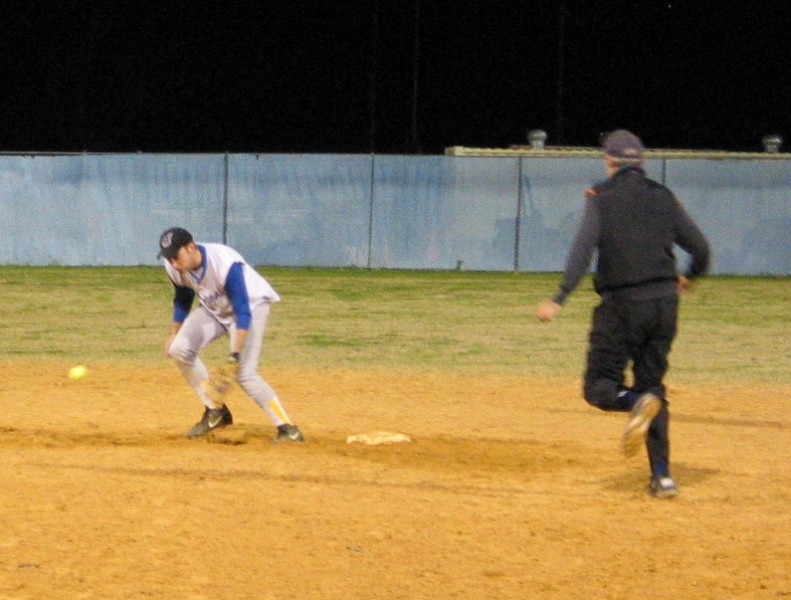 Matt arrives at second base as the thrown comes into the infield on his 4th inning double (he ended up reaching third base on an error by the pitcher). |