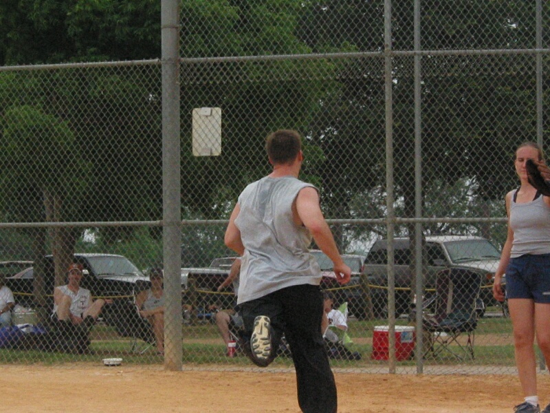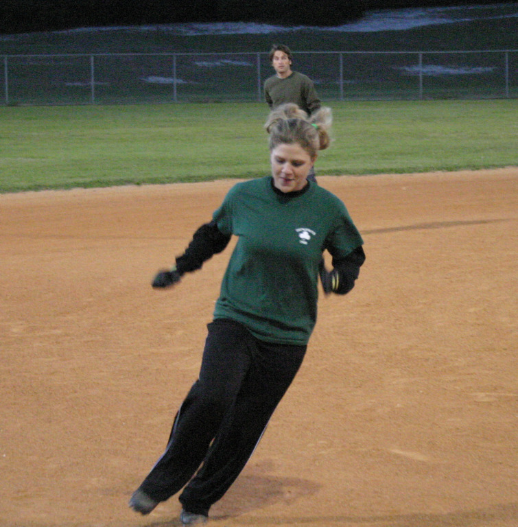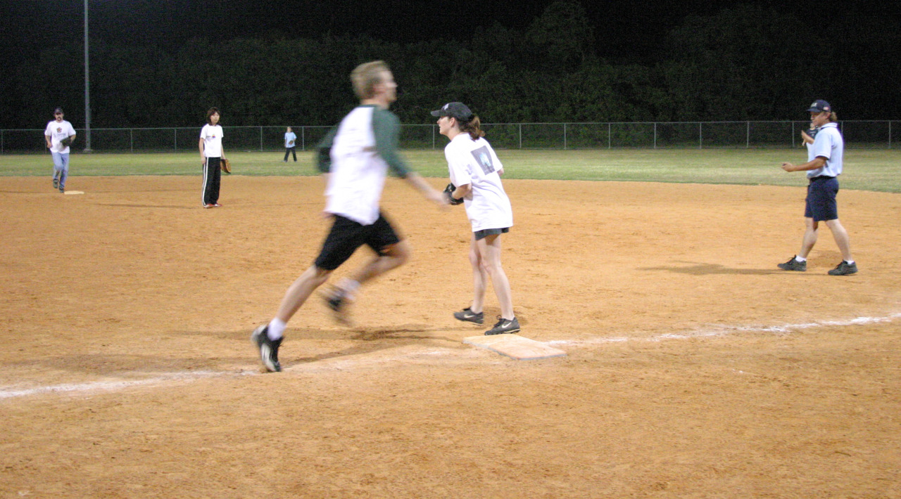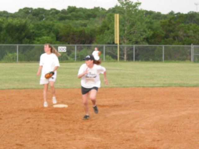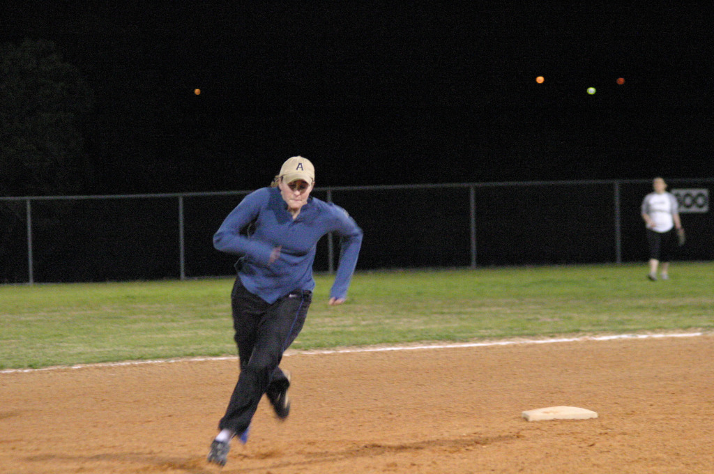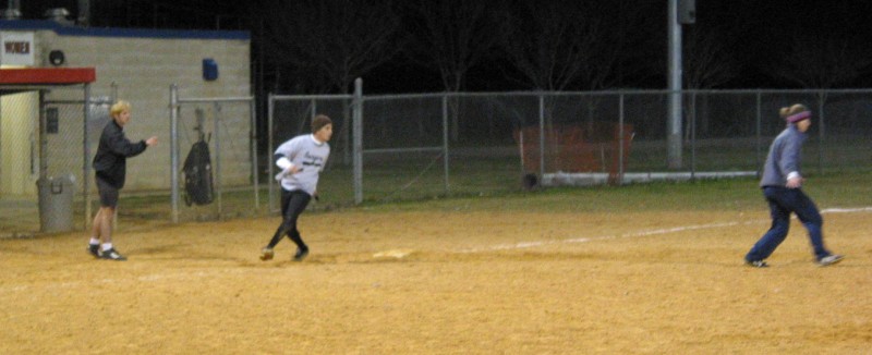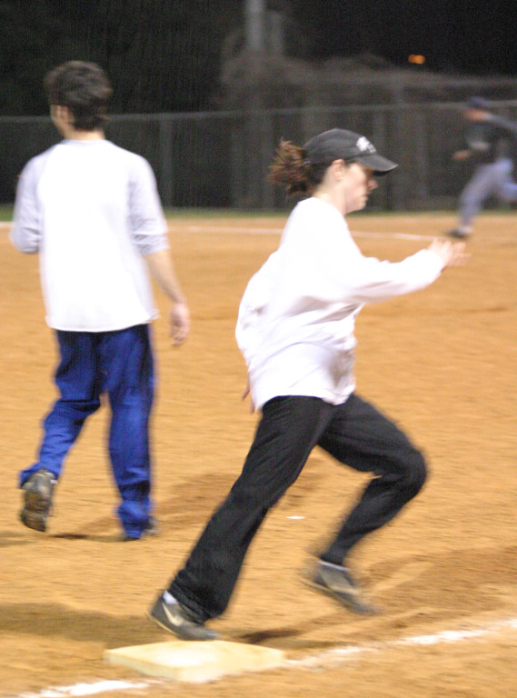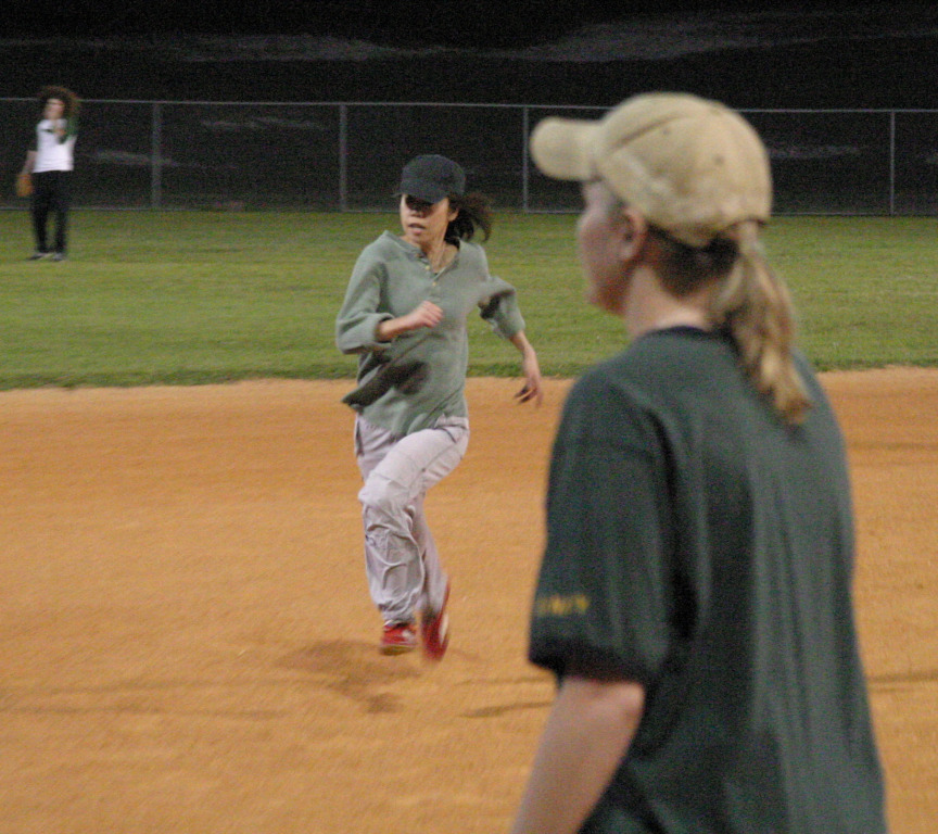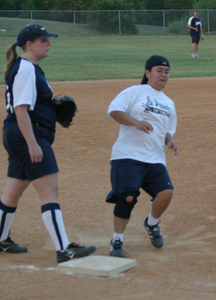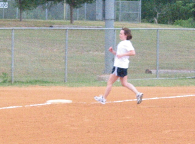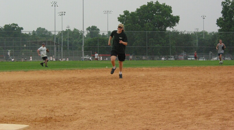 Carrie M approaching first base. In the background, Matt appears to be scoring. |