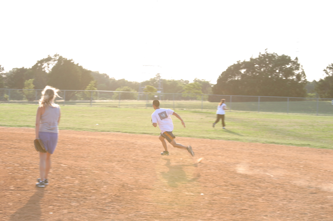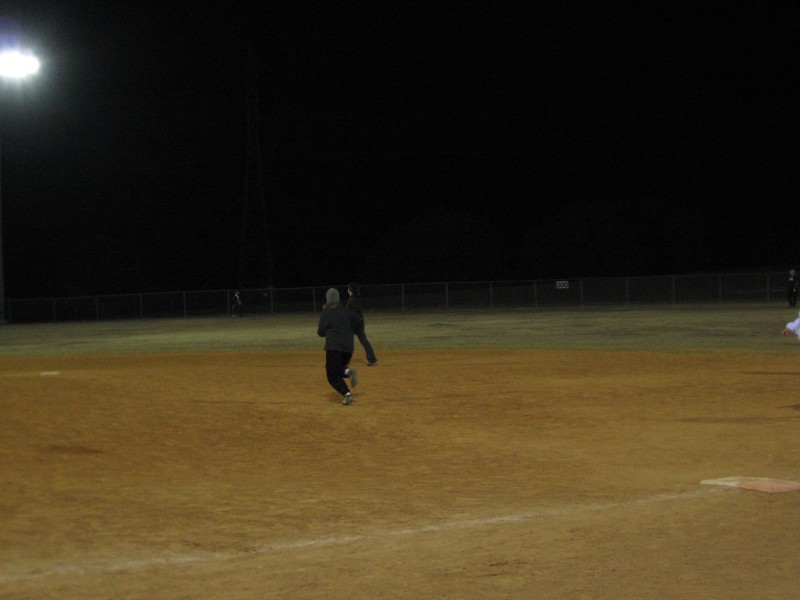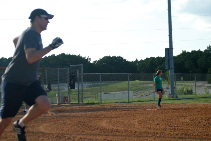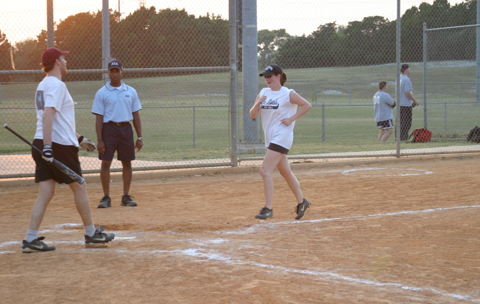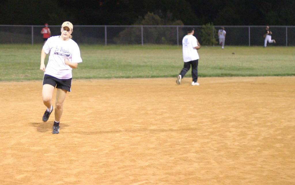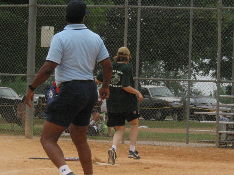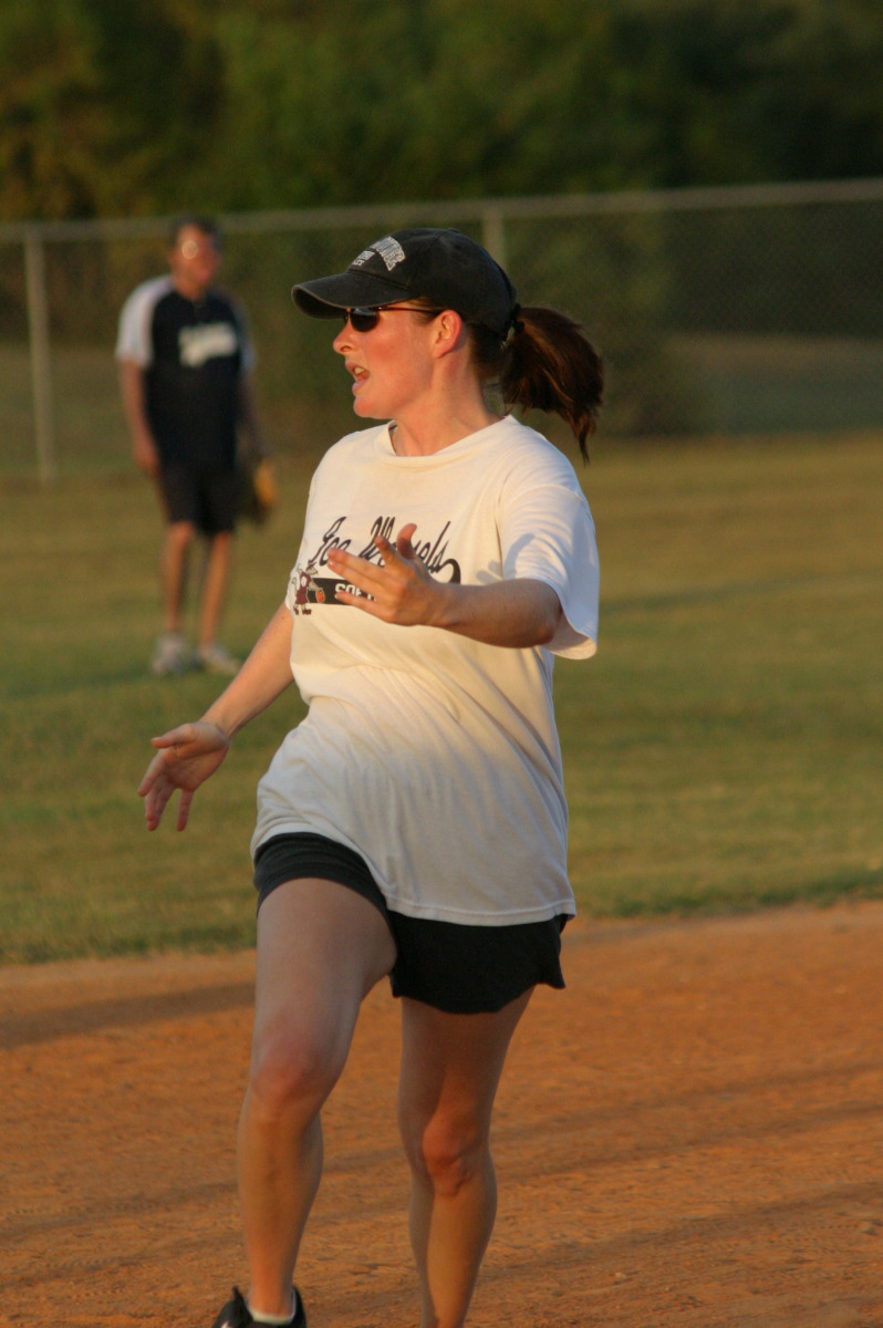 Carrie M approaching first base. In the background, Matt appears to be scoring. |
