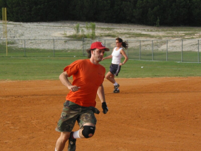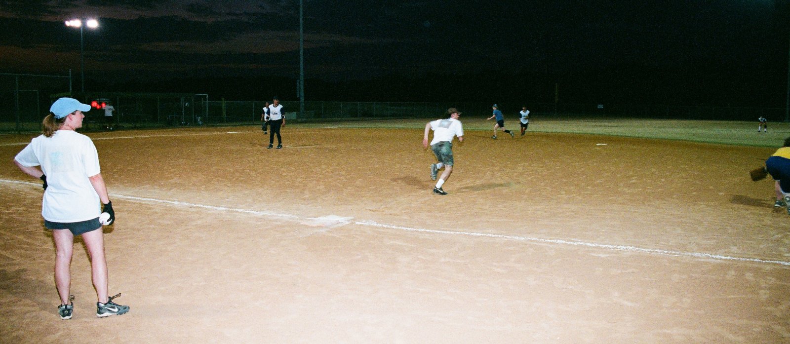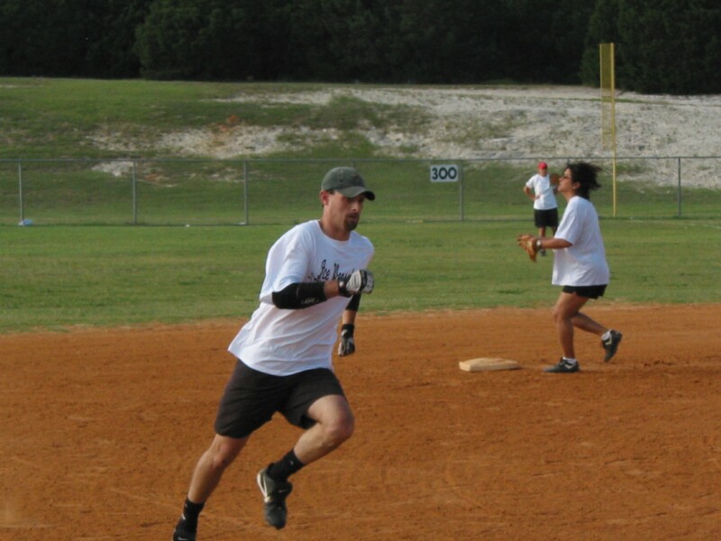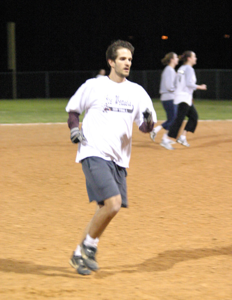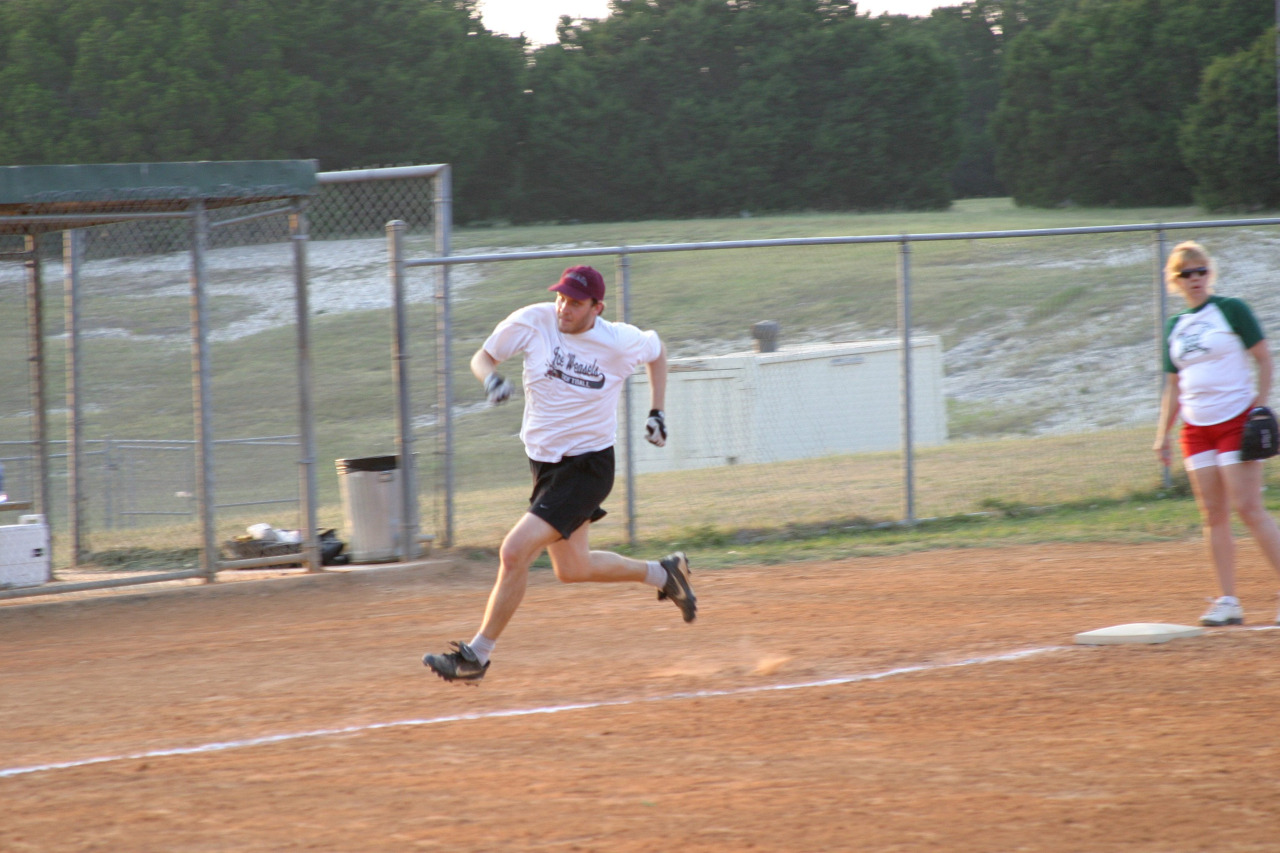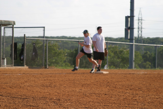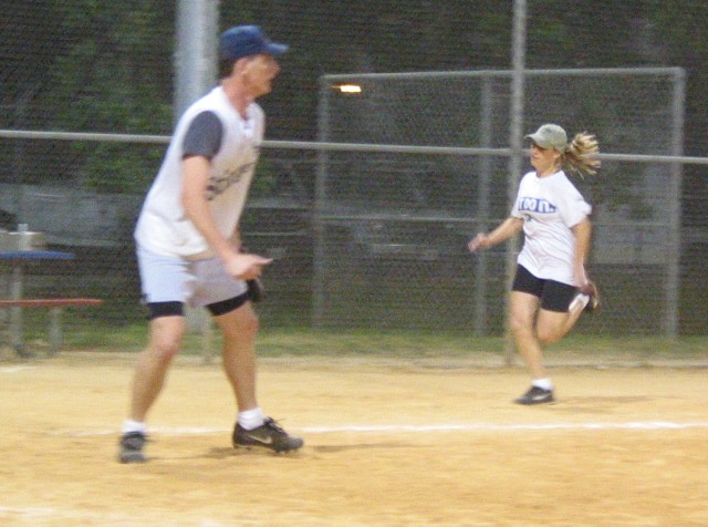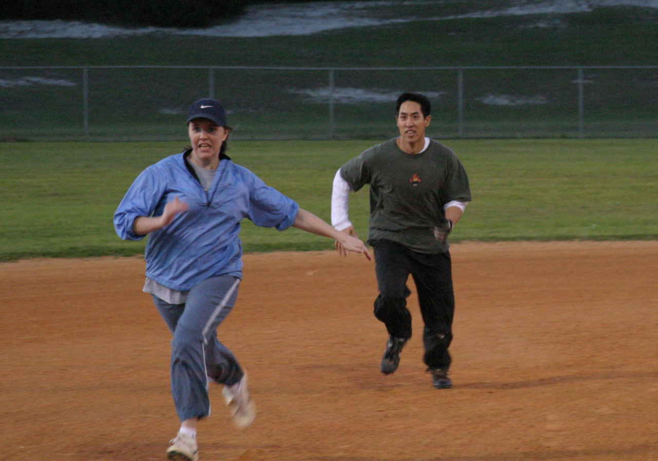 Carrie M approaching first base. In the background, Matt appears to be scoring. |