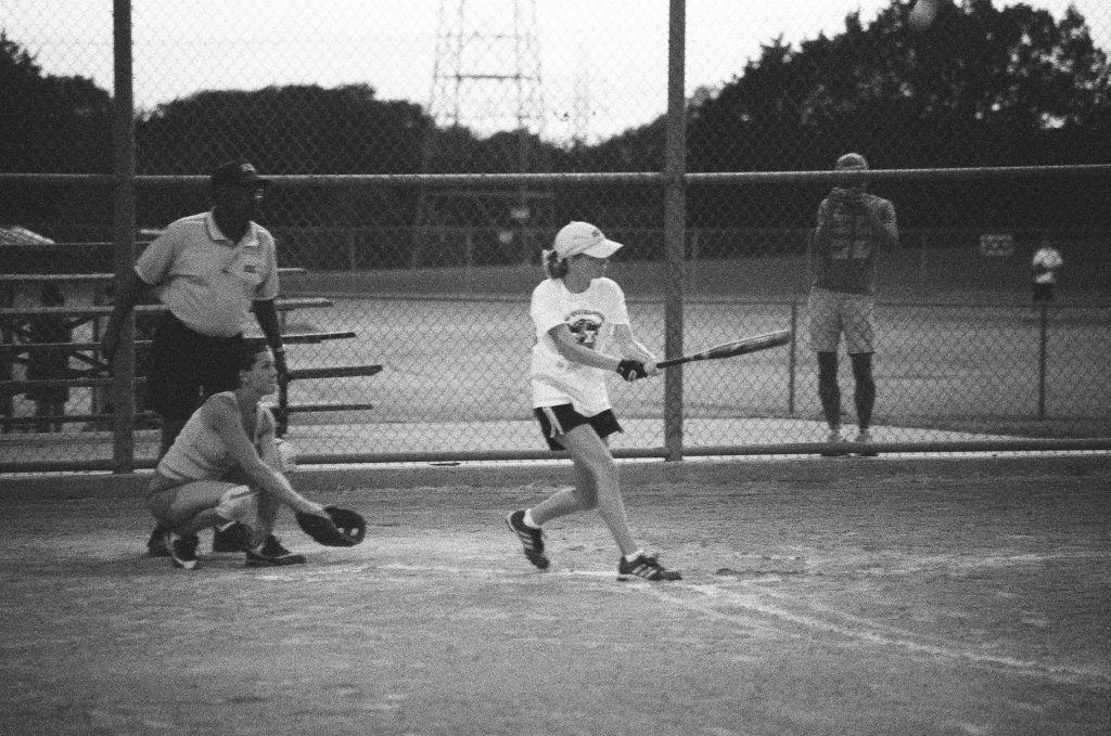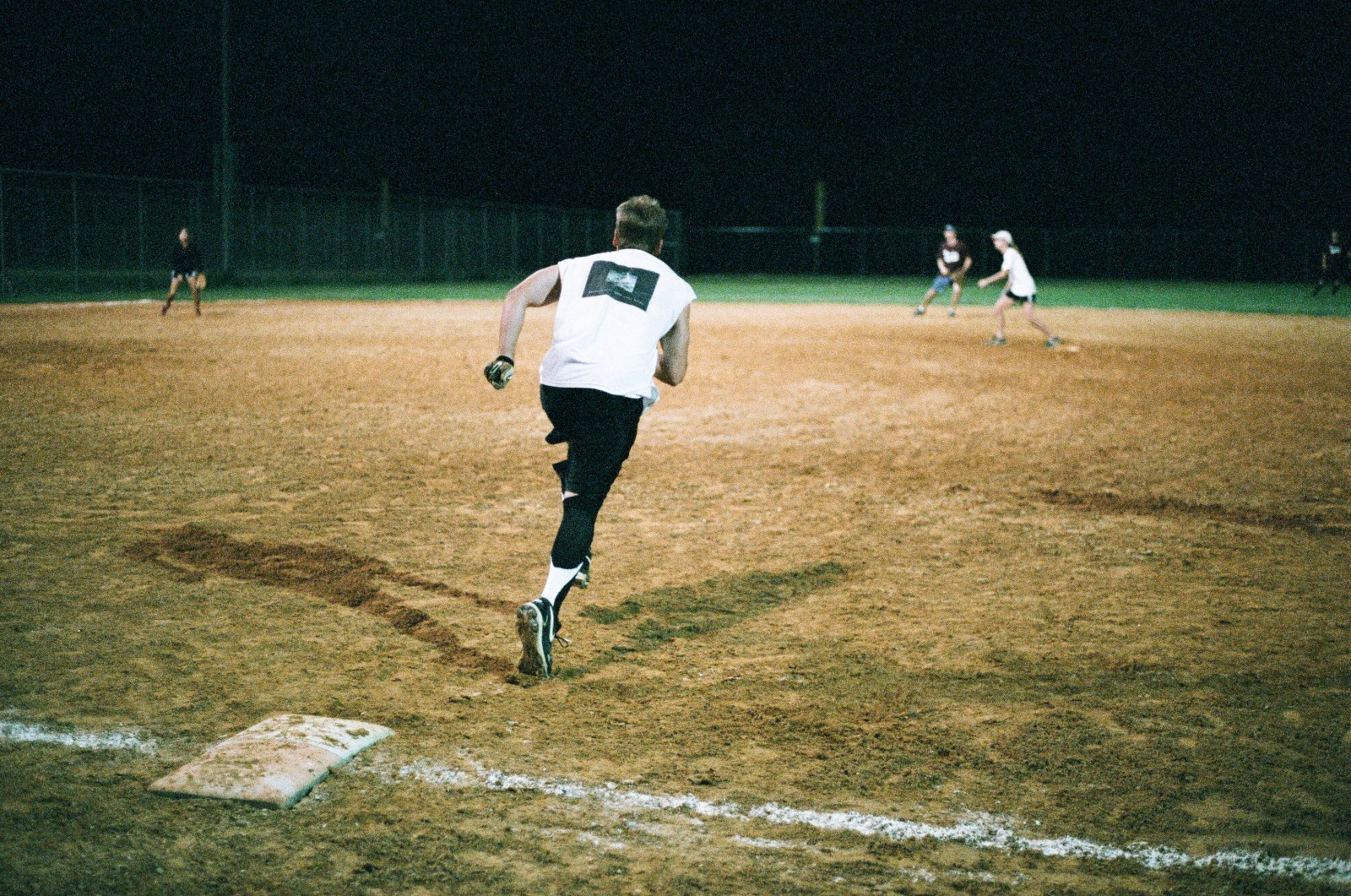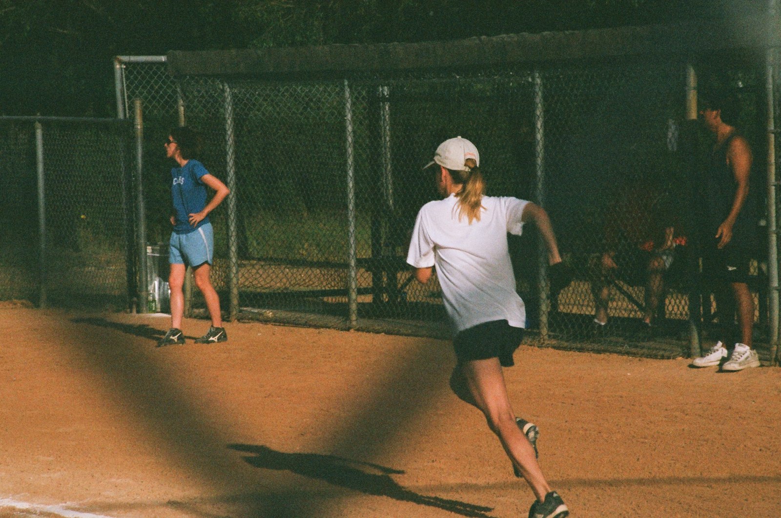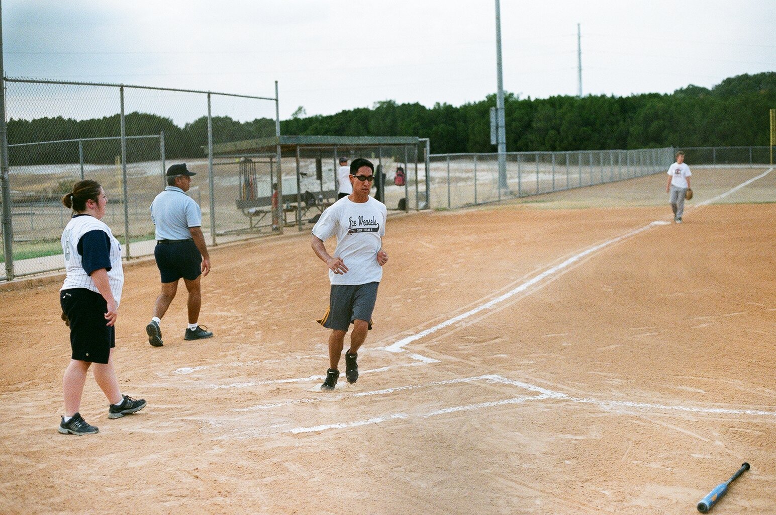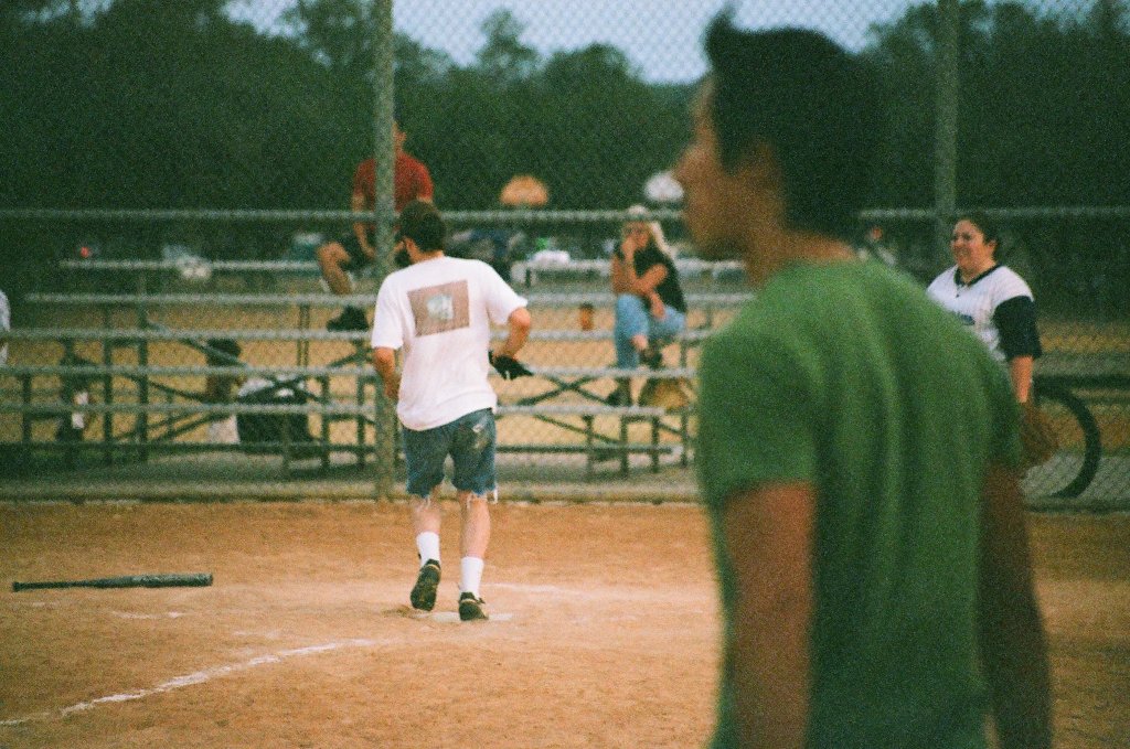 Carrie M approaching first base. In the background, Matt appears to be scoring. |