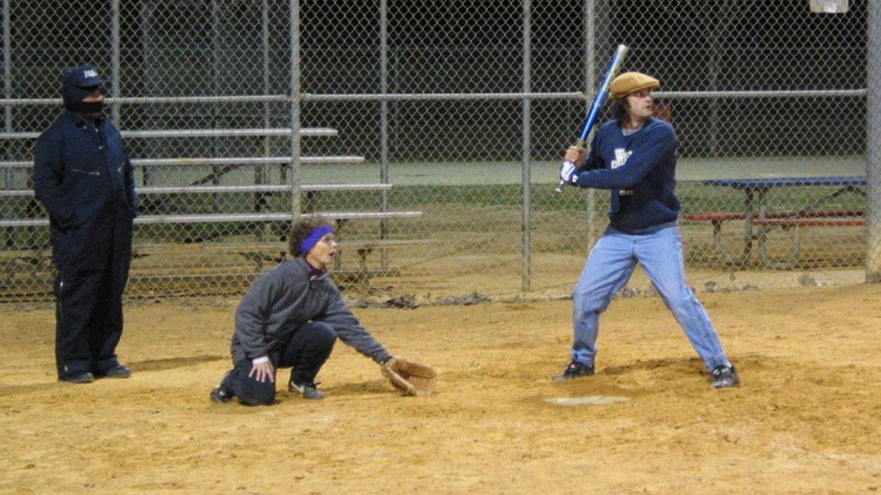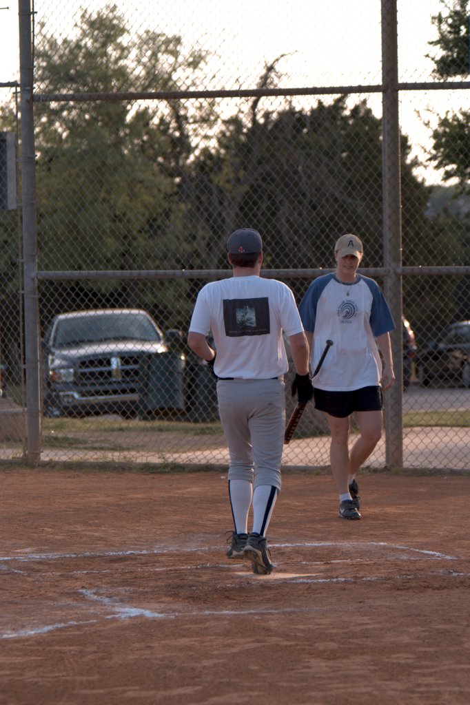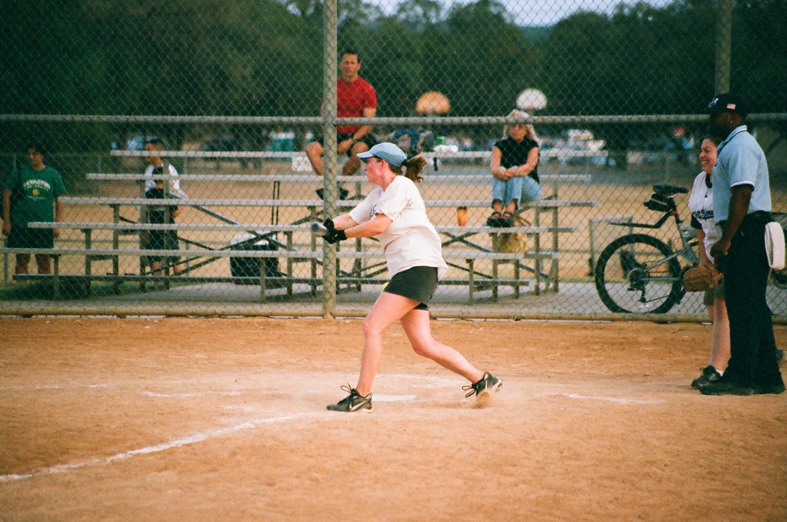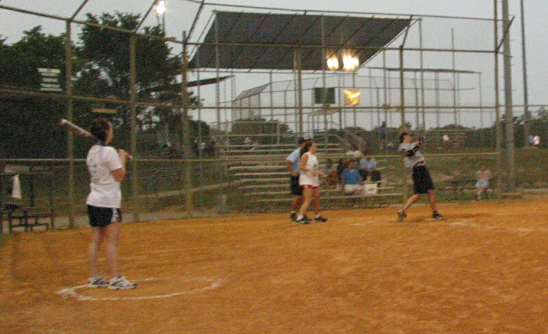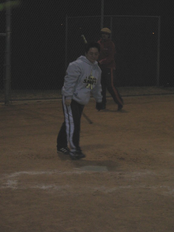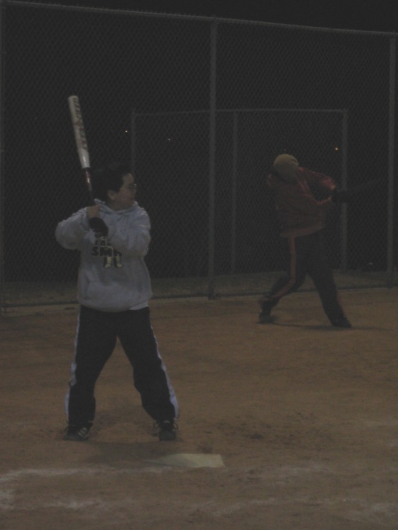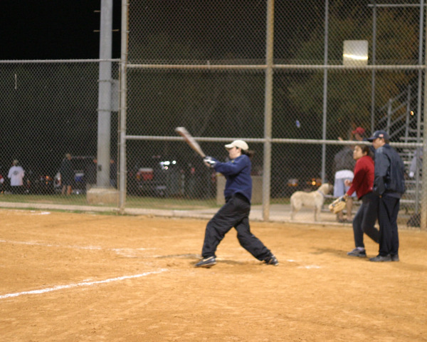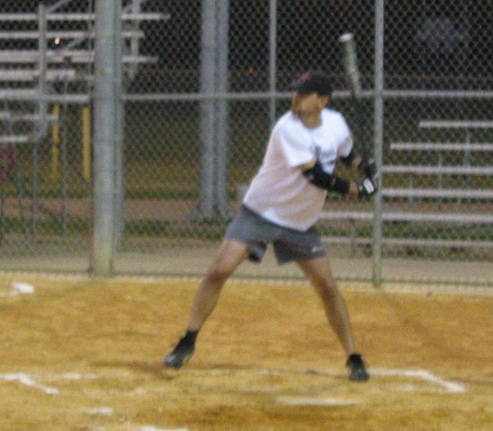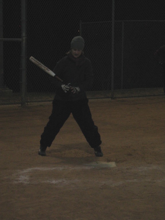 Becky at the plate in the top of the 2nd inning, looking back at the catcher and/or umpire. Neil is on deck. In the dugout from left to right are Lacey (sitting), Mitch (keeping score in the dugout door), Michelle F (sitting), Kelly B (walking toward the dugout door), Newton, Azzy, and Lindsay H (yellow socks). |