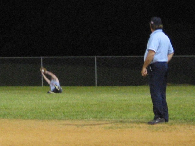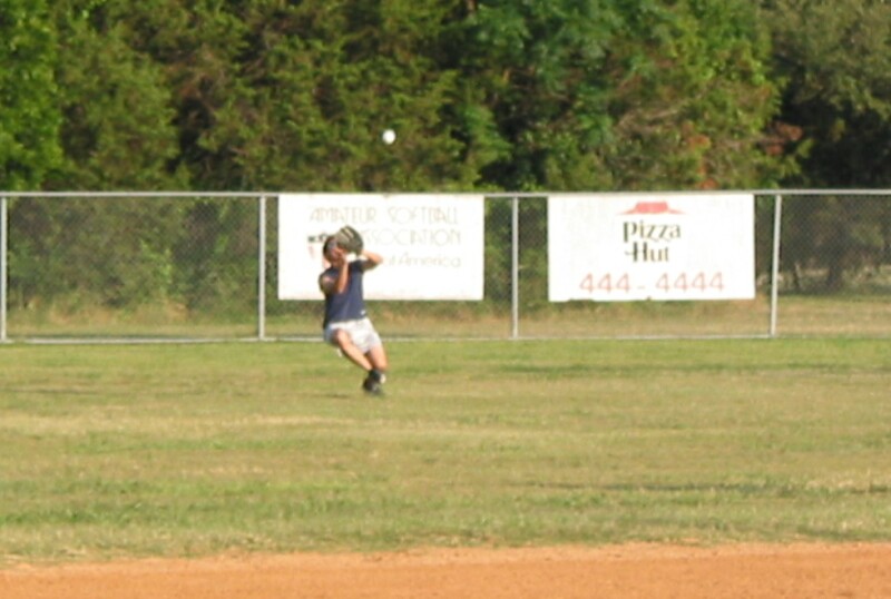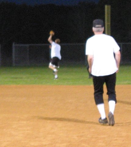 Carrie M and Cory in the outfield. Carrie M jumps like a ballerina for the ball as Cory backs her up. I think, although I can't be sure, that the ball is in her glove in this photo. |
