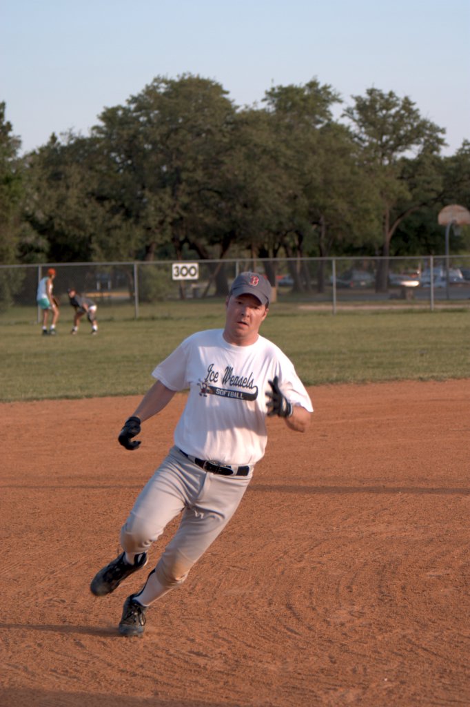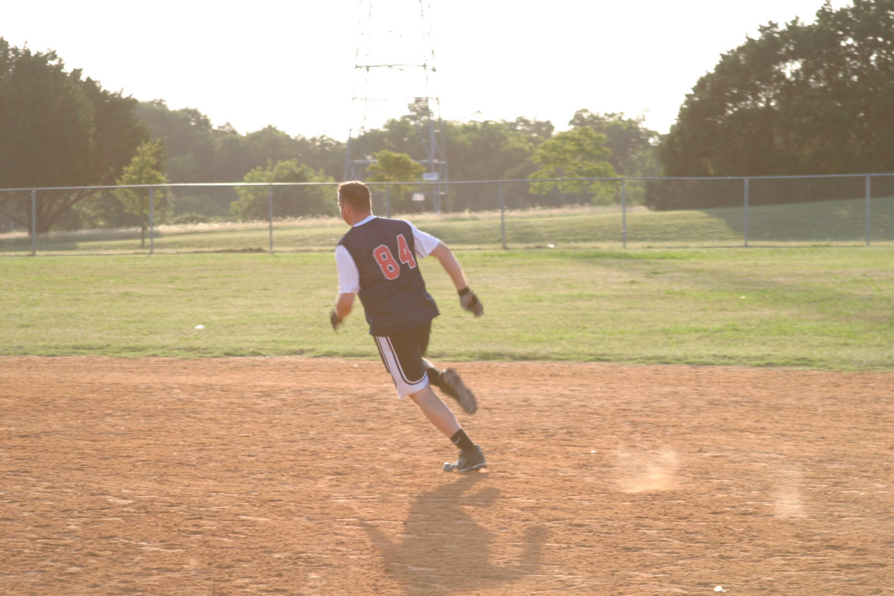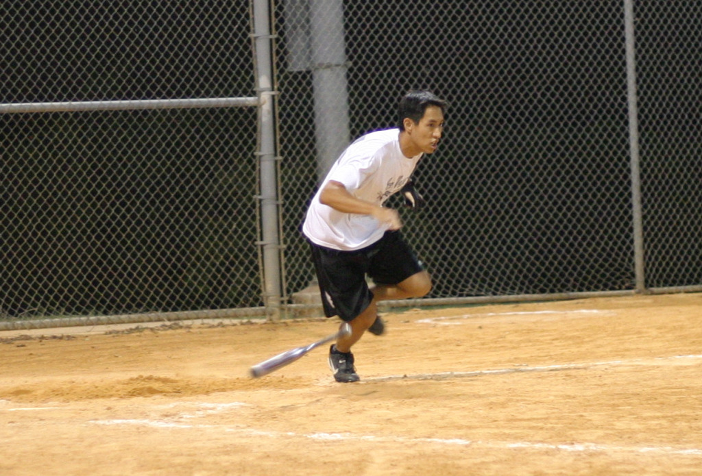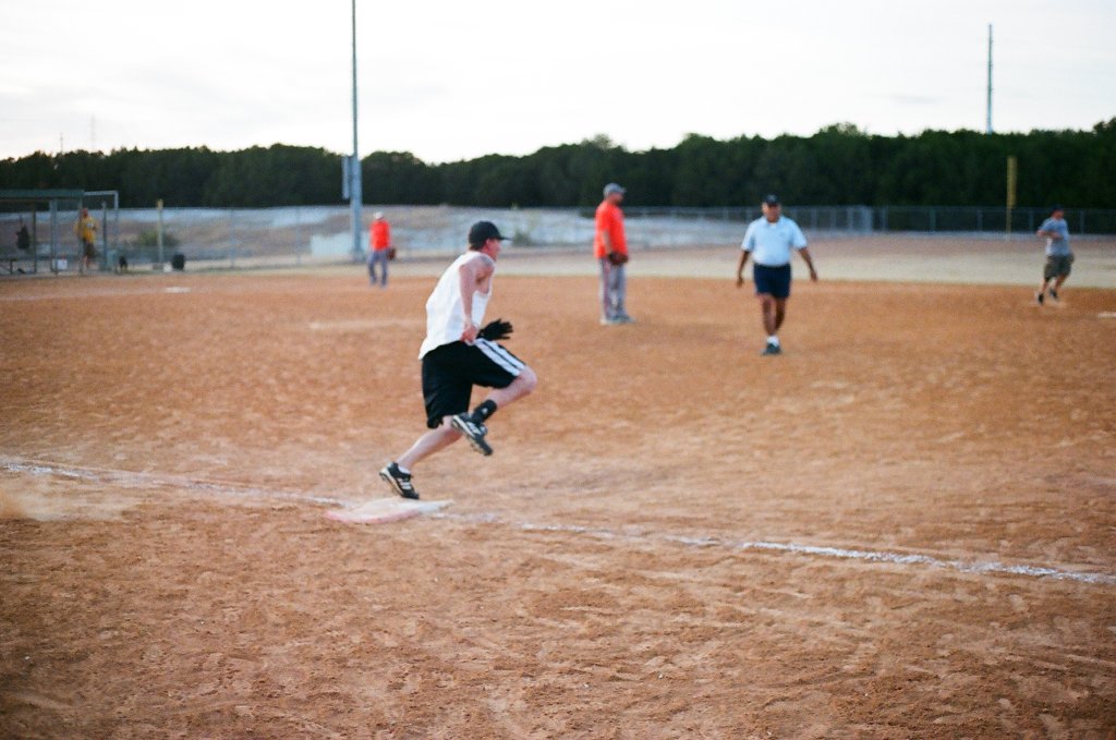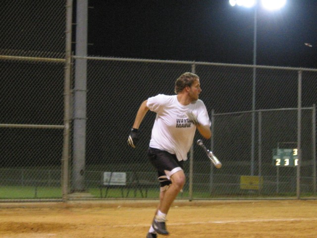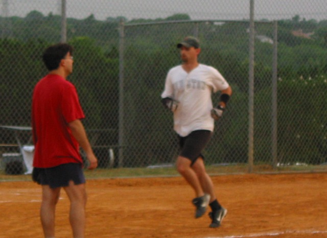 Matt has hit the ball and begins running toward first base in the top of the 4th inning. |