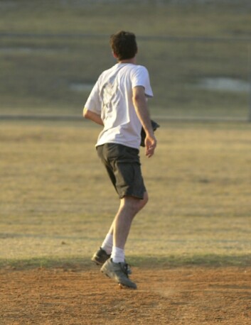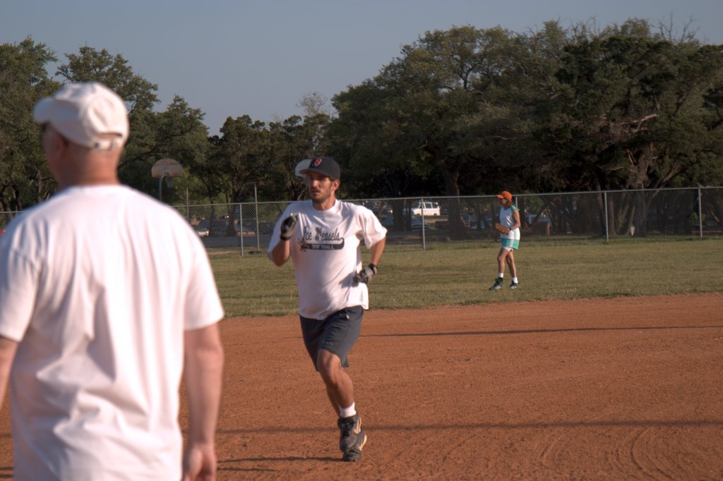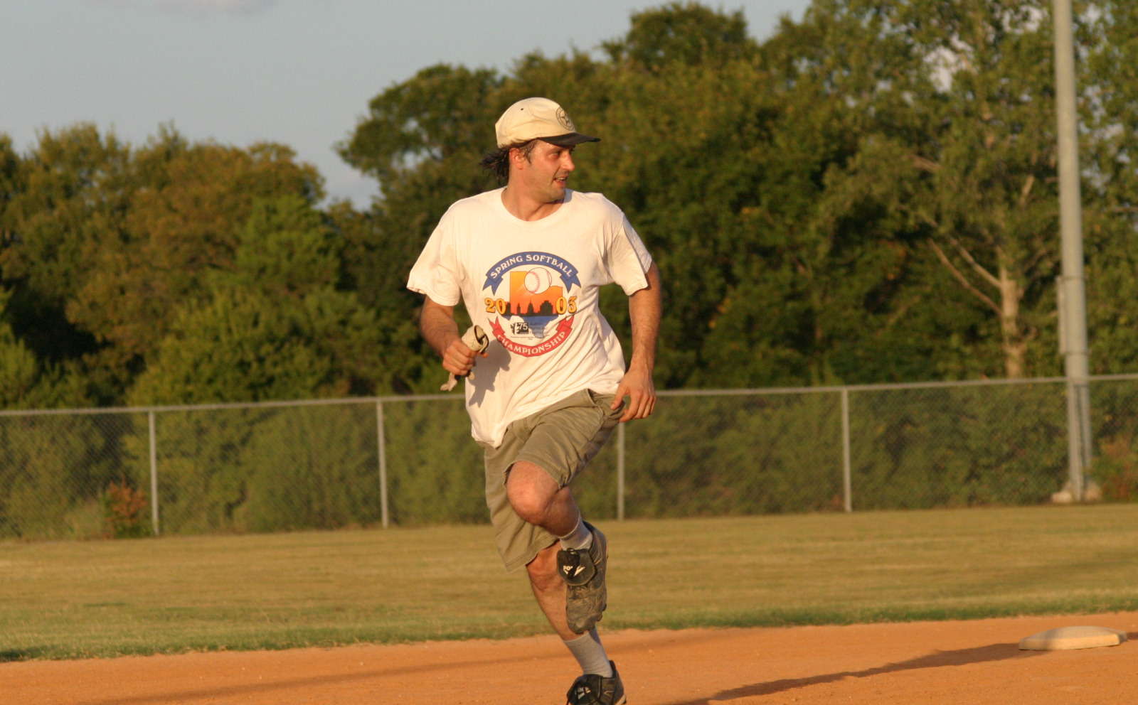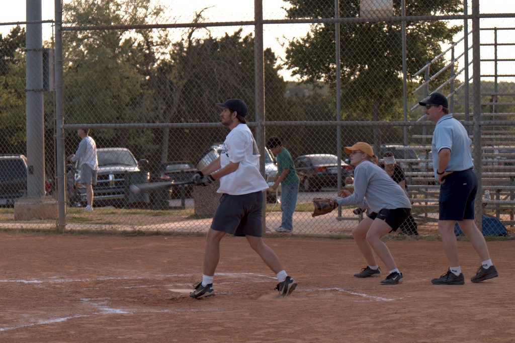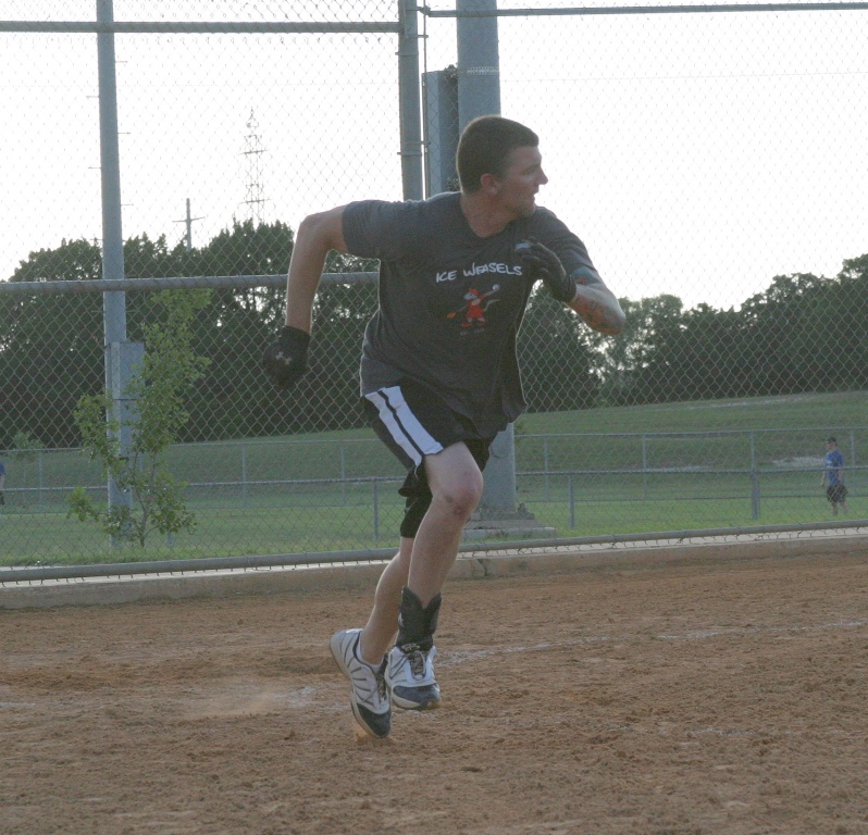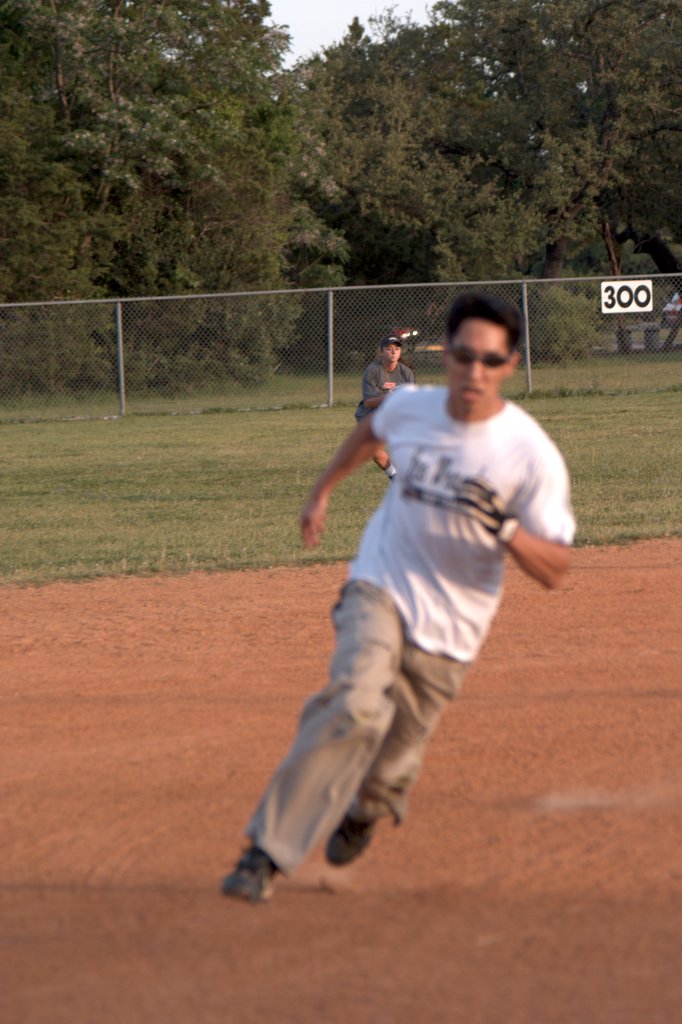 Matt has hit the ball and begins running toward first base in the top of the 4th inning. |
