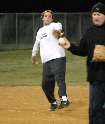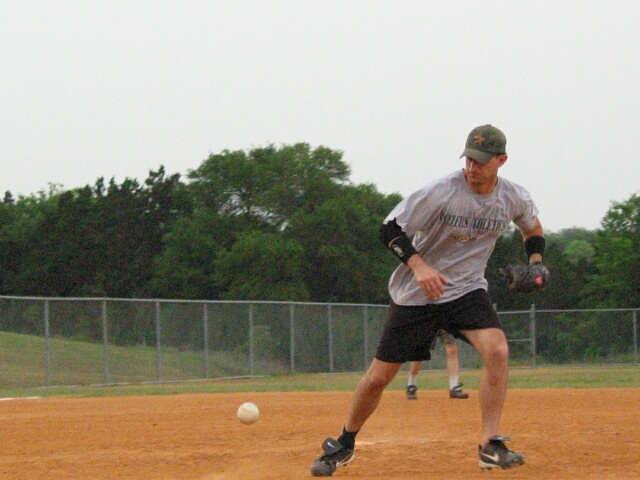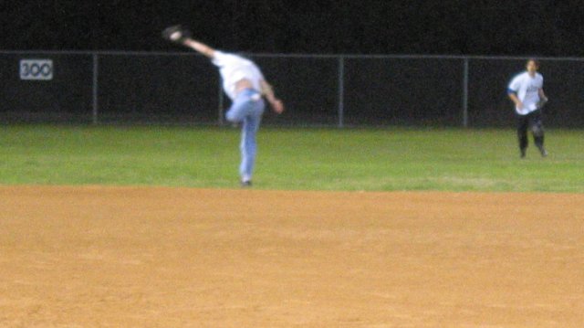 Chris E fielding a ground ball. Newton can be seen running in from the outfield in the background. |