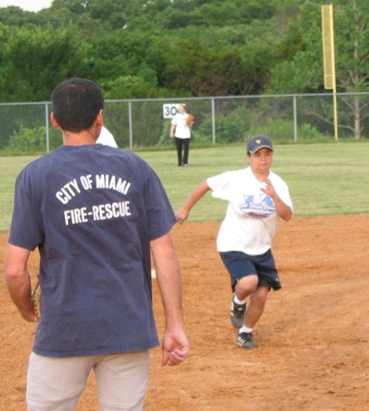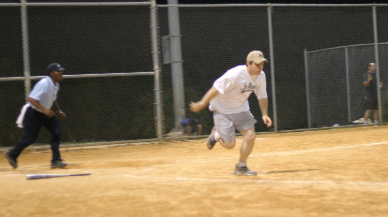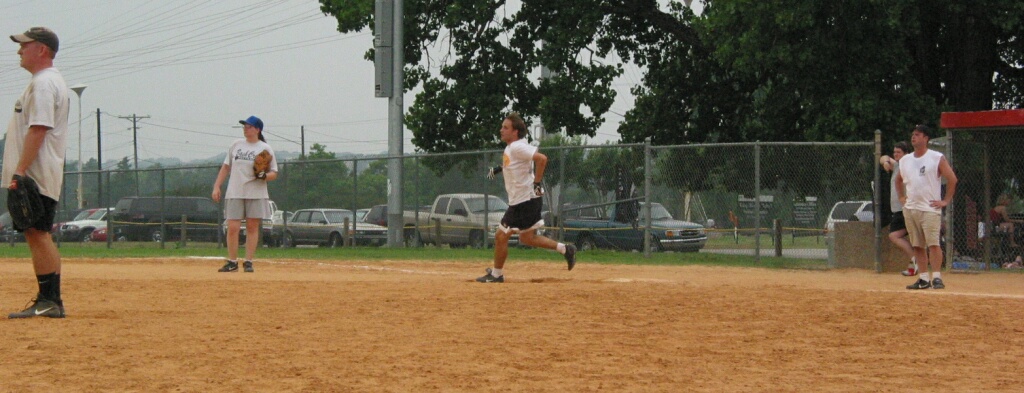 Newton about to score standing up on his inside-the-park home run. Mitch is standing beyond home plate, having scored from third on the homer. |