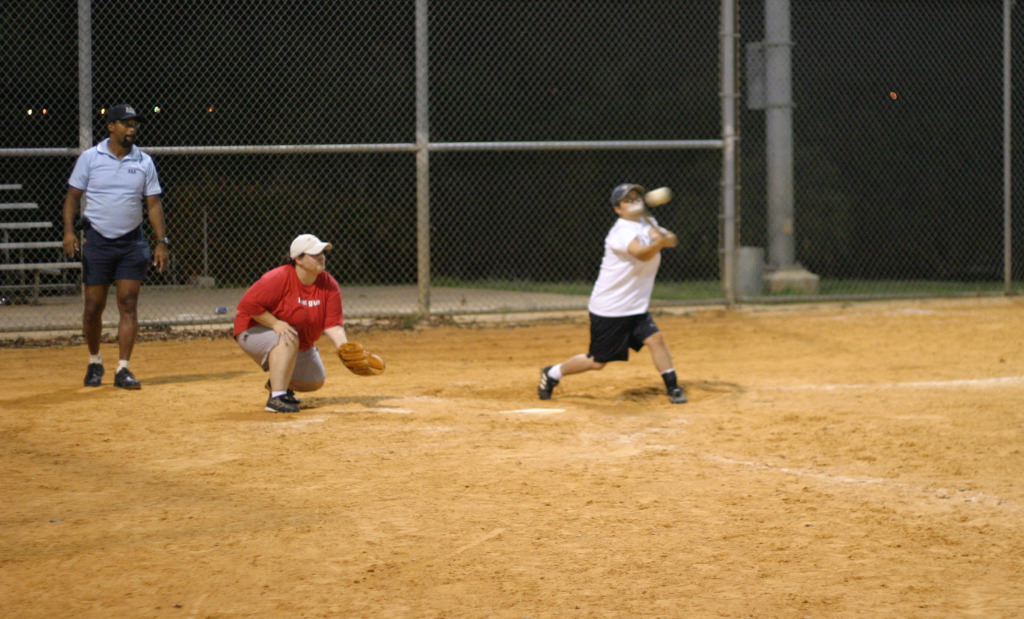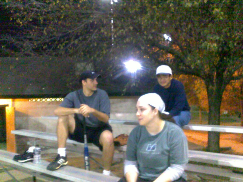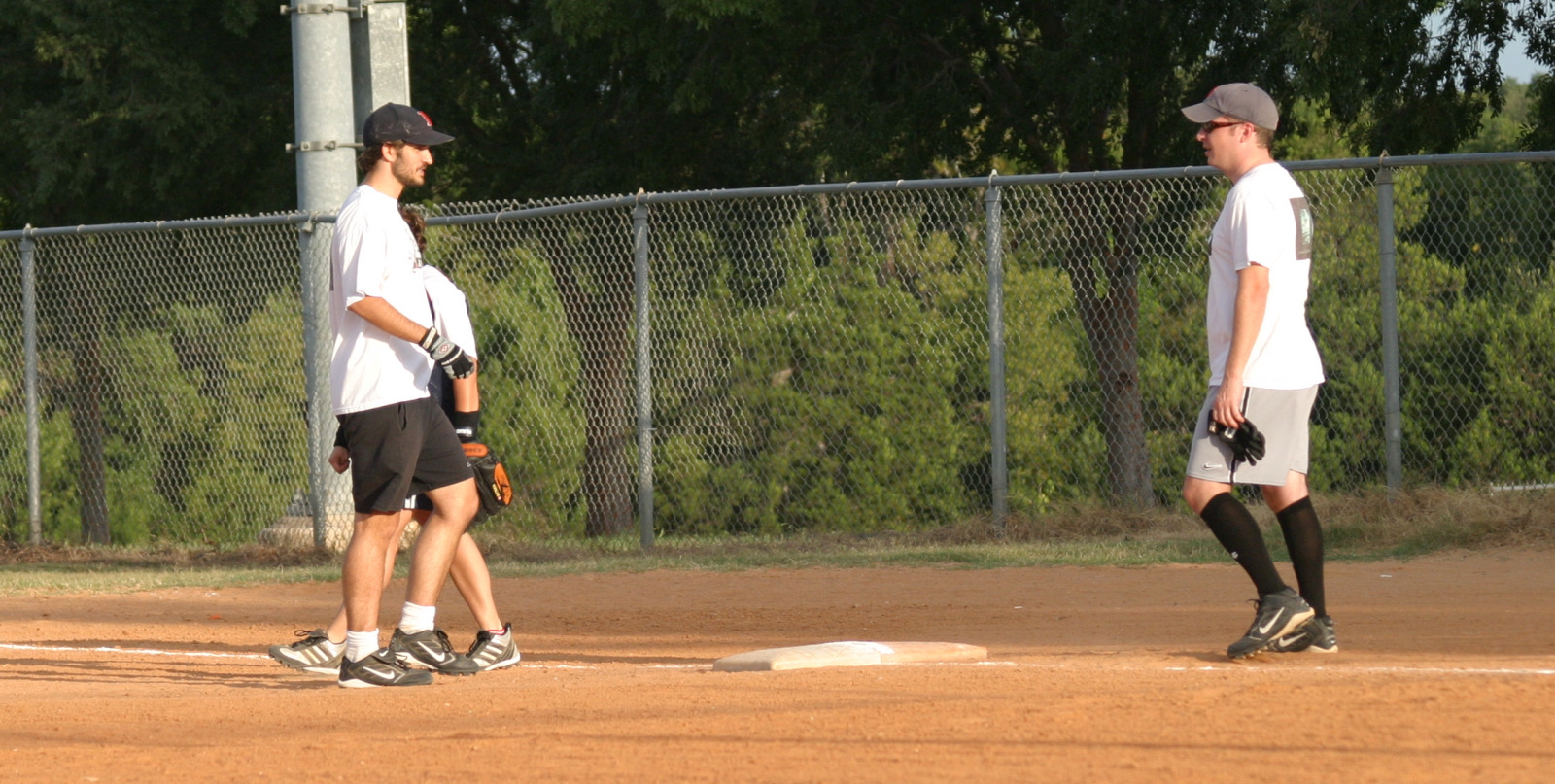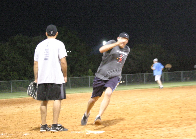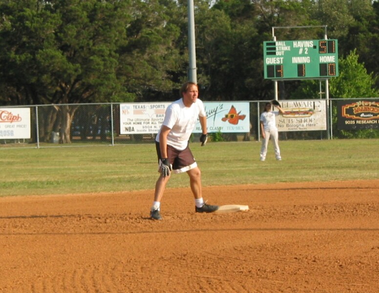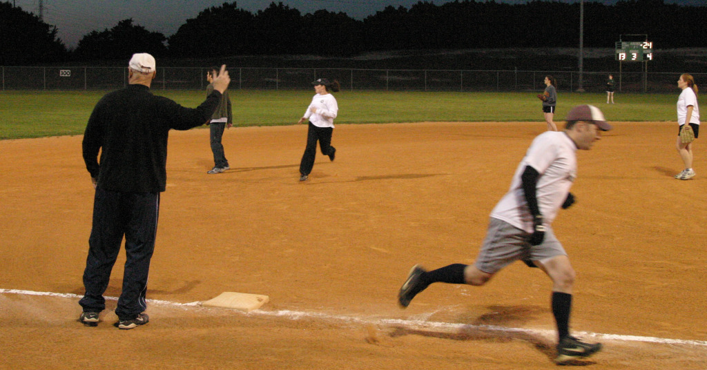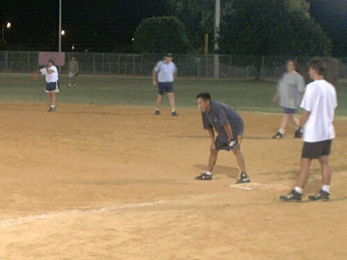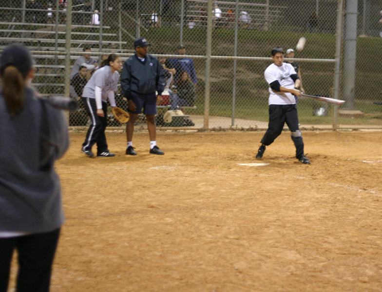 Shawn W at bat in the top of the 3rd inning. Michelle F is on first base. Tim R's head is visible at first base coach. |