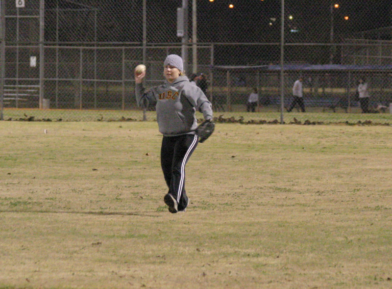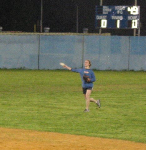 Aimee throws. She is at third base, making the throw to Krissy at first base. |