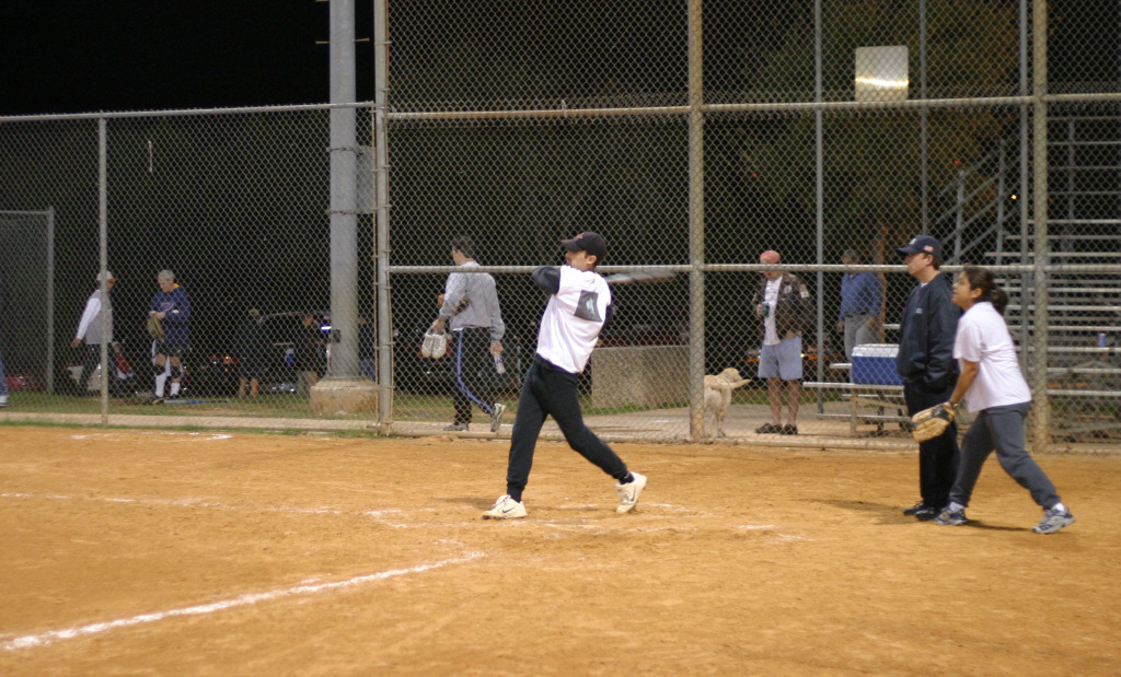 Chris E launches a hard line drive to left field in the top of the 2nd inning. Matt is third base coach. Shawn W (white shirt) can be seen in the background standing near the dugout door. Tony (Azzy's dad) watches from the other side of the fence. |