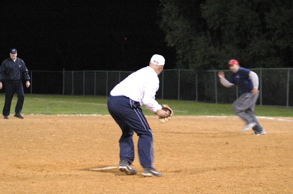 Play at 1st -- The opposing first baseman receives a throw. This photo, as well as all other photos of this game, were taken by Eric, Laurie S's fiance. We all still love him for it. |