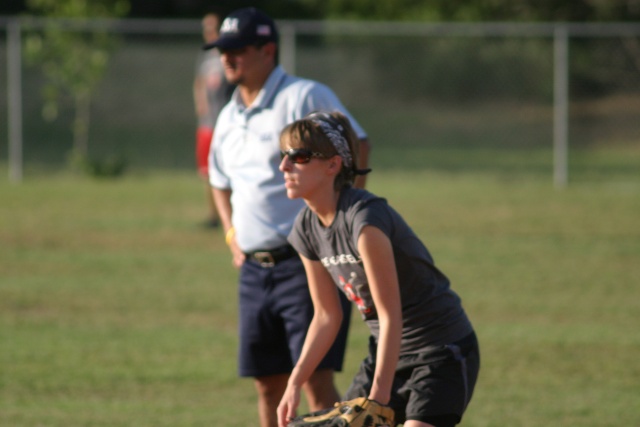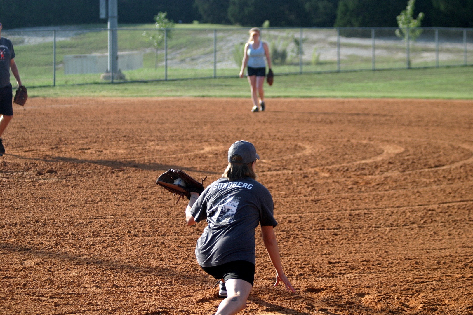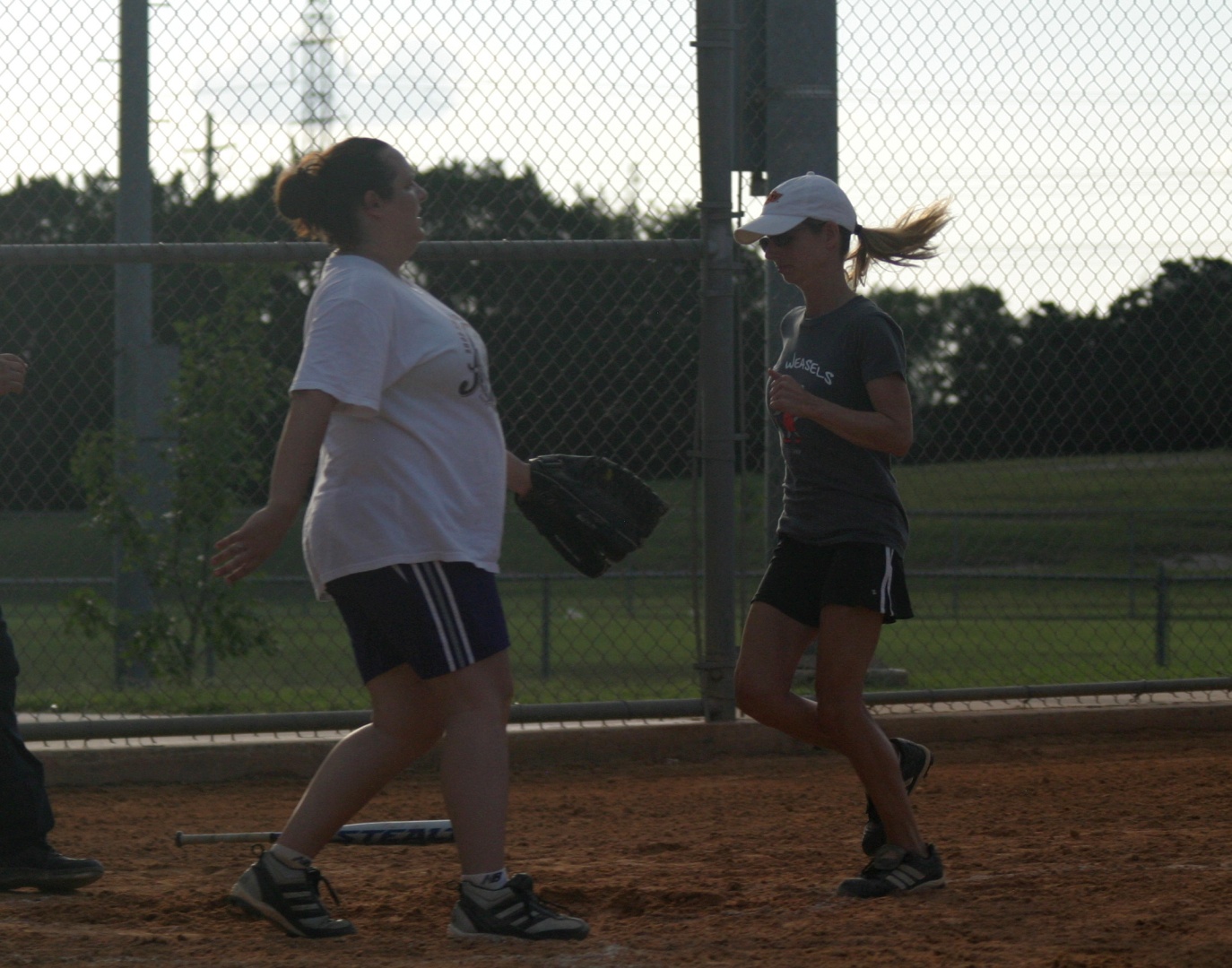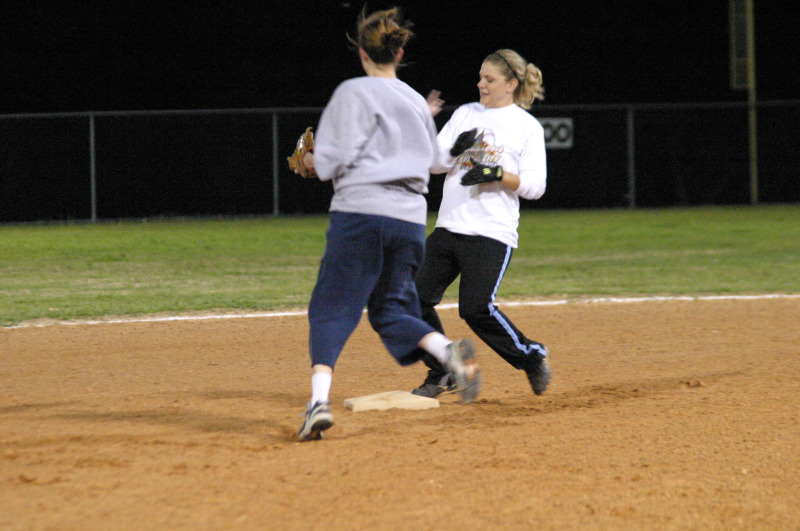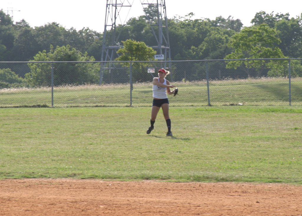 Becky appears to be about to throw the ball. Courtney is visible in the background near second base. |