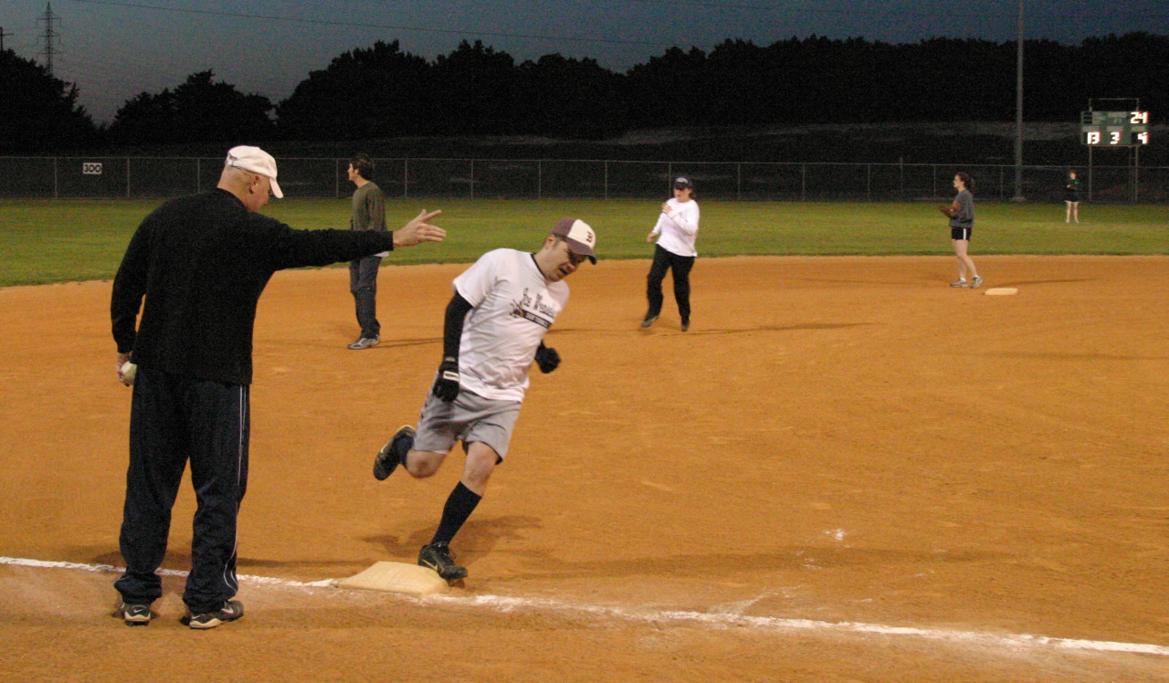 Chris E walks back to the dugout after scoring in the top of the 4th inning, slapping handa with Shawn W who is coming to the plate. Matt is is visible in the background at third base coach. |