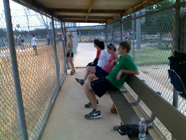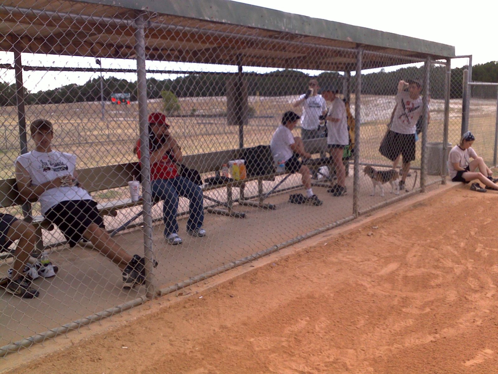 Chris E about to bat in the top of the 2nd inning. Tony (Azzy's dad) is in the background watching on the other side of the fence. Michelle F holds a bat near the dugout door. Inside the dugout you can see Mitch (Red Sox cap) and Lacey (black and white top). |